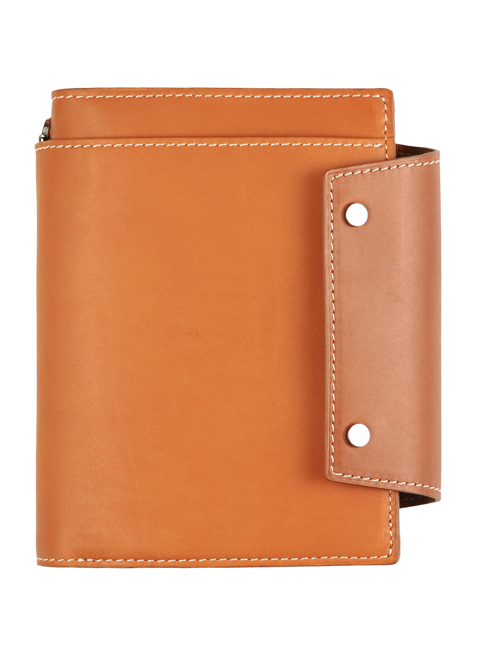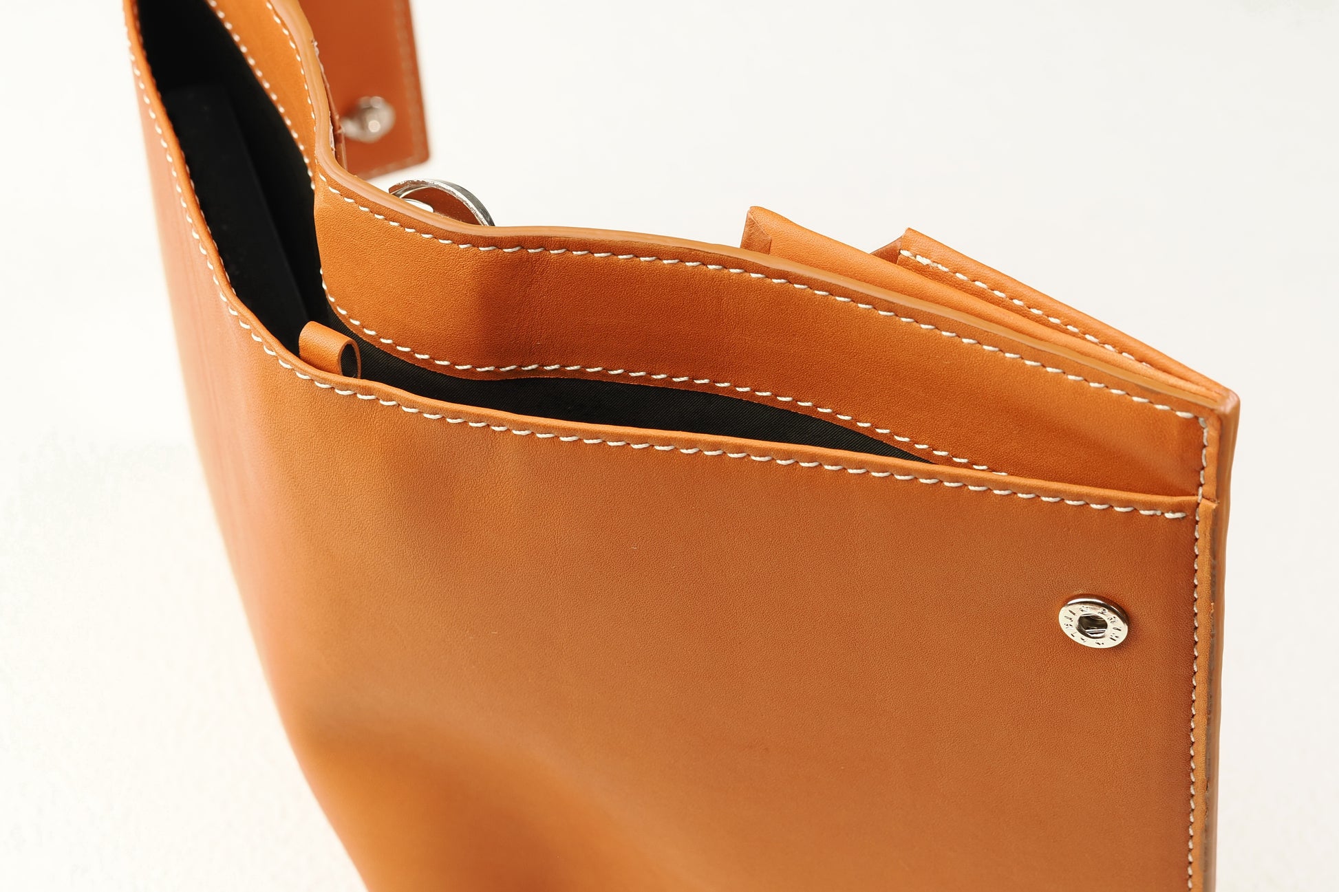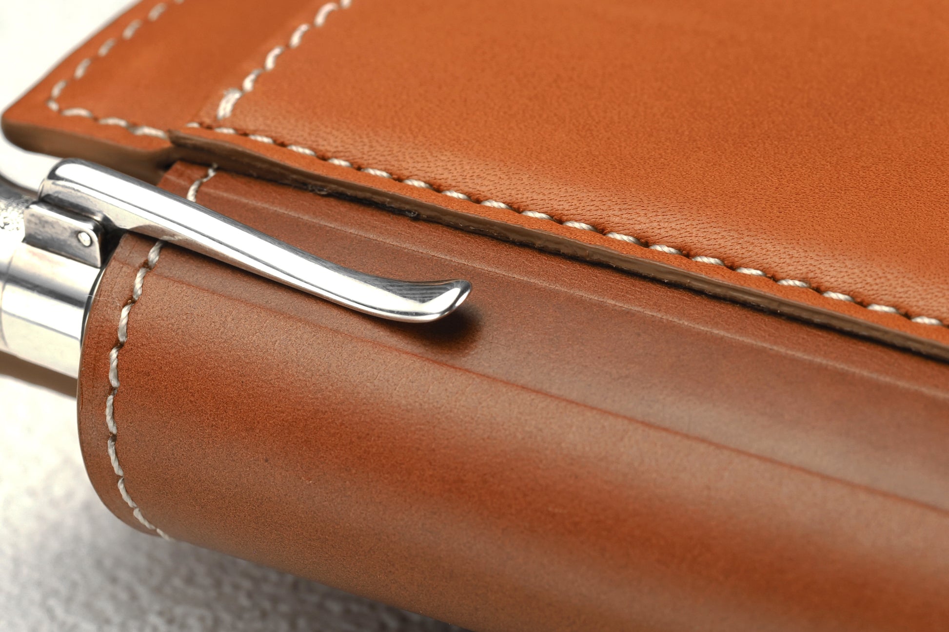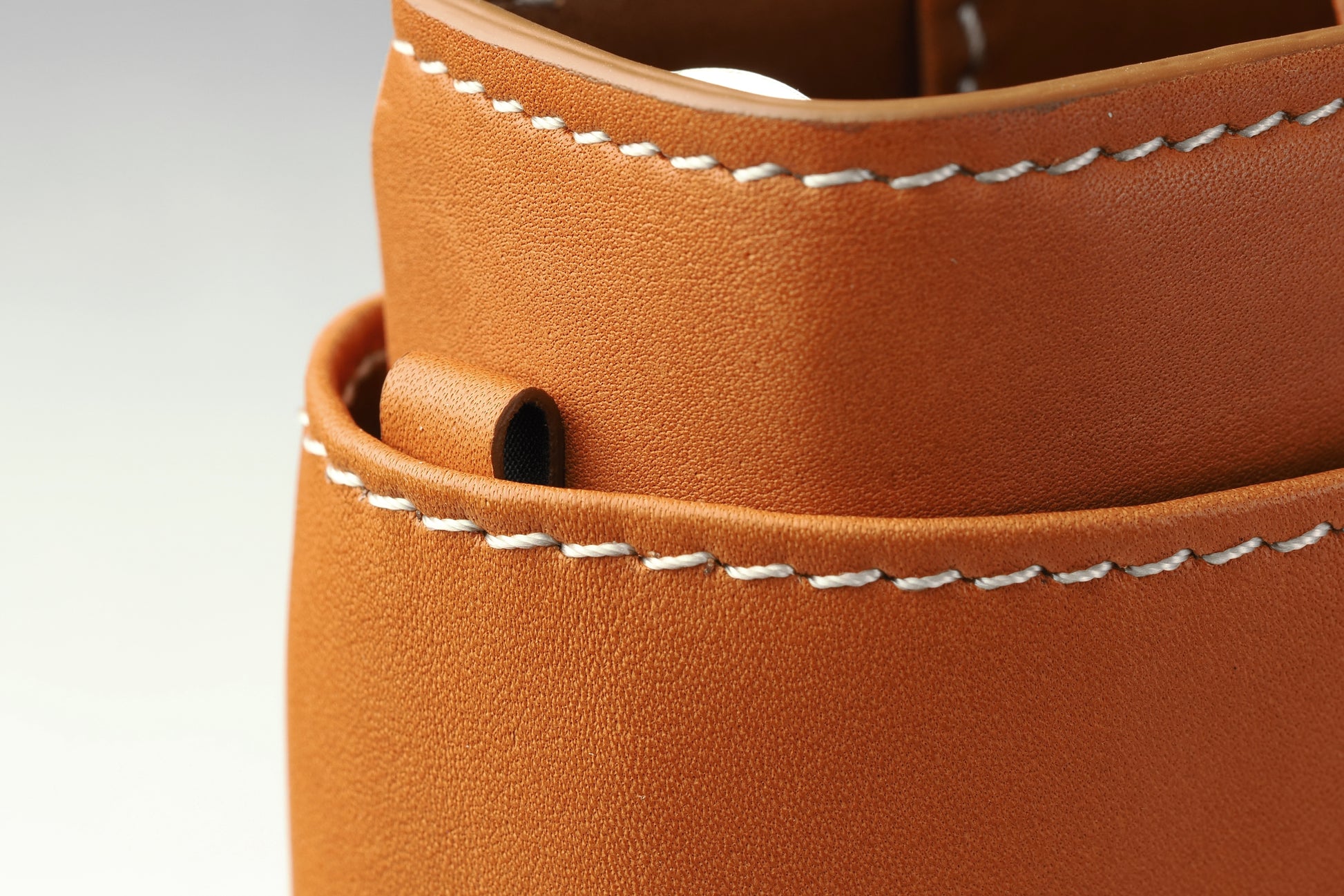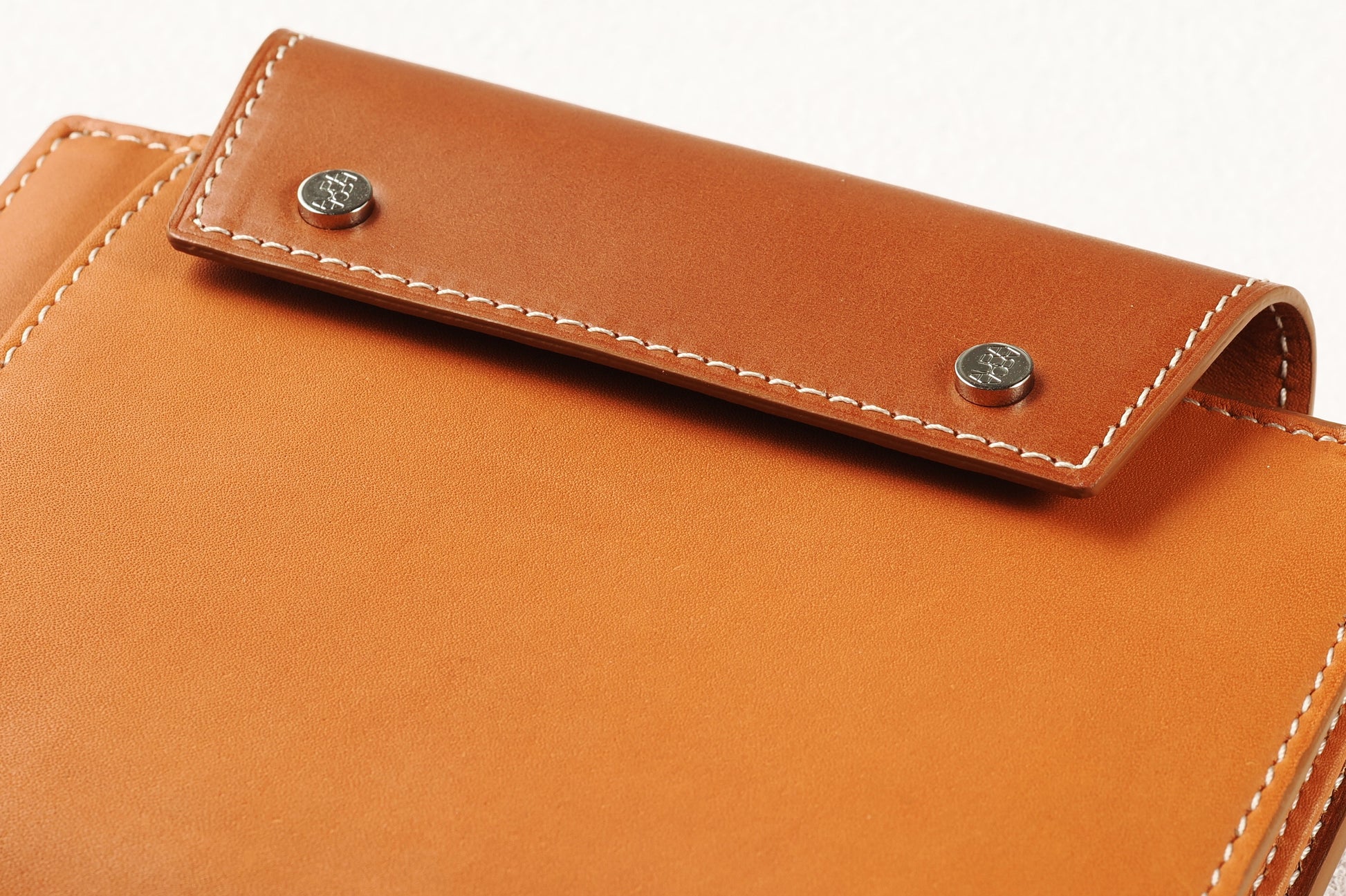 直径7mmの特注ホックは、一度大きく打ち抜いた金具を再度小さく打ち抜くという手の込んだ作り。ロゴの刻印は伝統ある「やげん(薬研)彫り」を採用。断面の形をV字形に彫るので、文字はシャープに浮き立ち、使い込んでも際立ったロゴの明快さが持続します。
