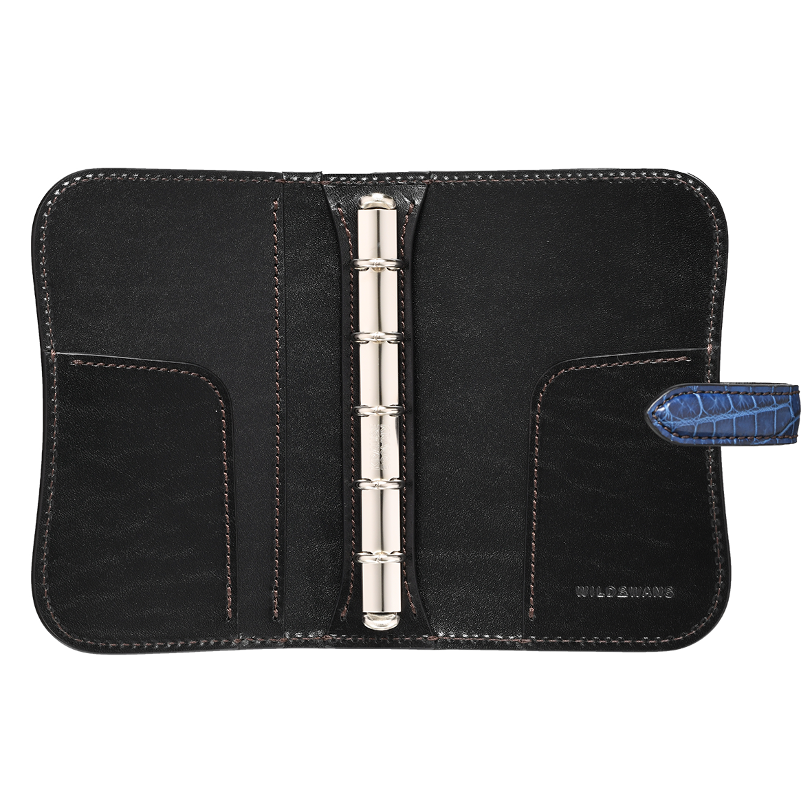 ワイルドスワンズとコラボした超プレミアムなM5手帳です。表革はクロム鞣しを施した後、天然藍で染め上げたナイルクロコダイルを使用しました。軽やかで堅牢なナイルクロコダイルは、腹部中央の竹斑からサイドの丸斑へと移ろう自然なグラデーションが美しく、藍染めの濃淡が斑模様を際立たせることで、唯一無二の風合いを生み出しています。
