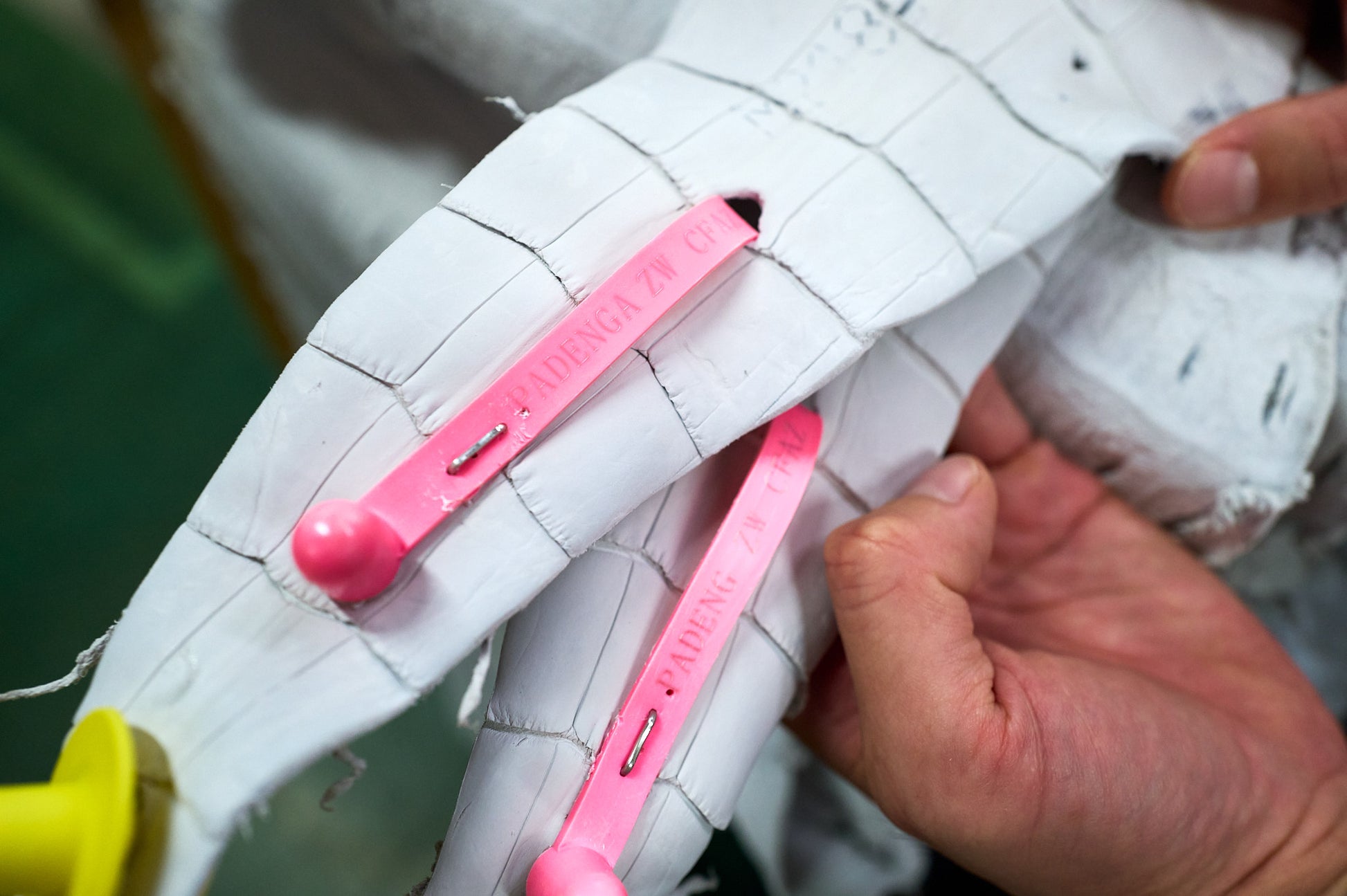ピンクの「サイテスタグ」は、ワシントン条約で管理されている生体識別番号で、養殖場の名前や国名なども記されています。例えば「ZW」は「ジンバブエ産」を意味します。