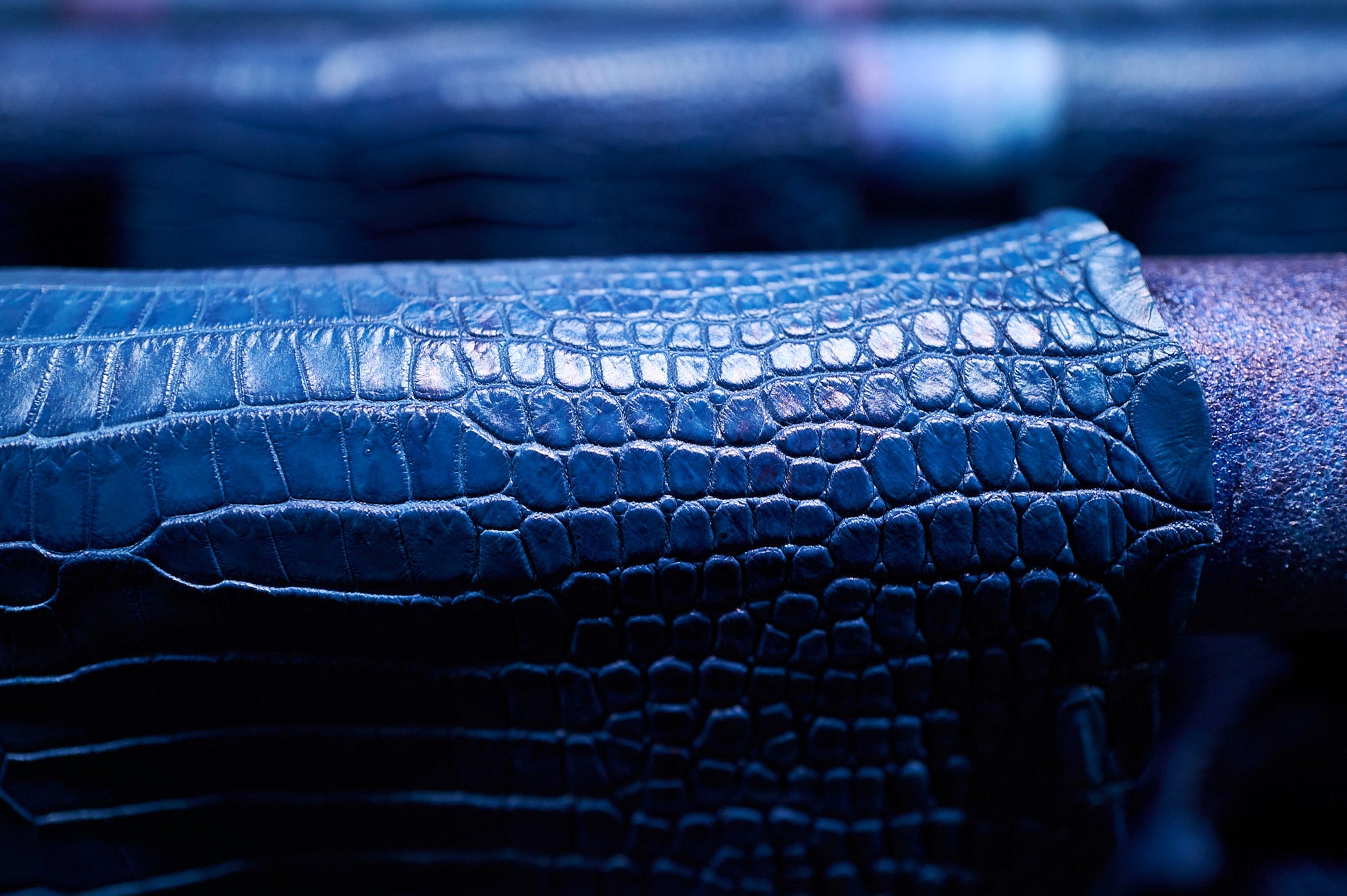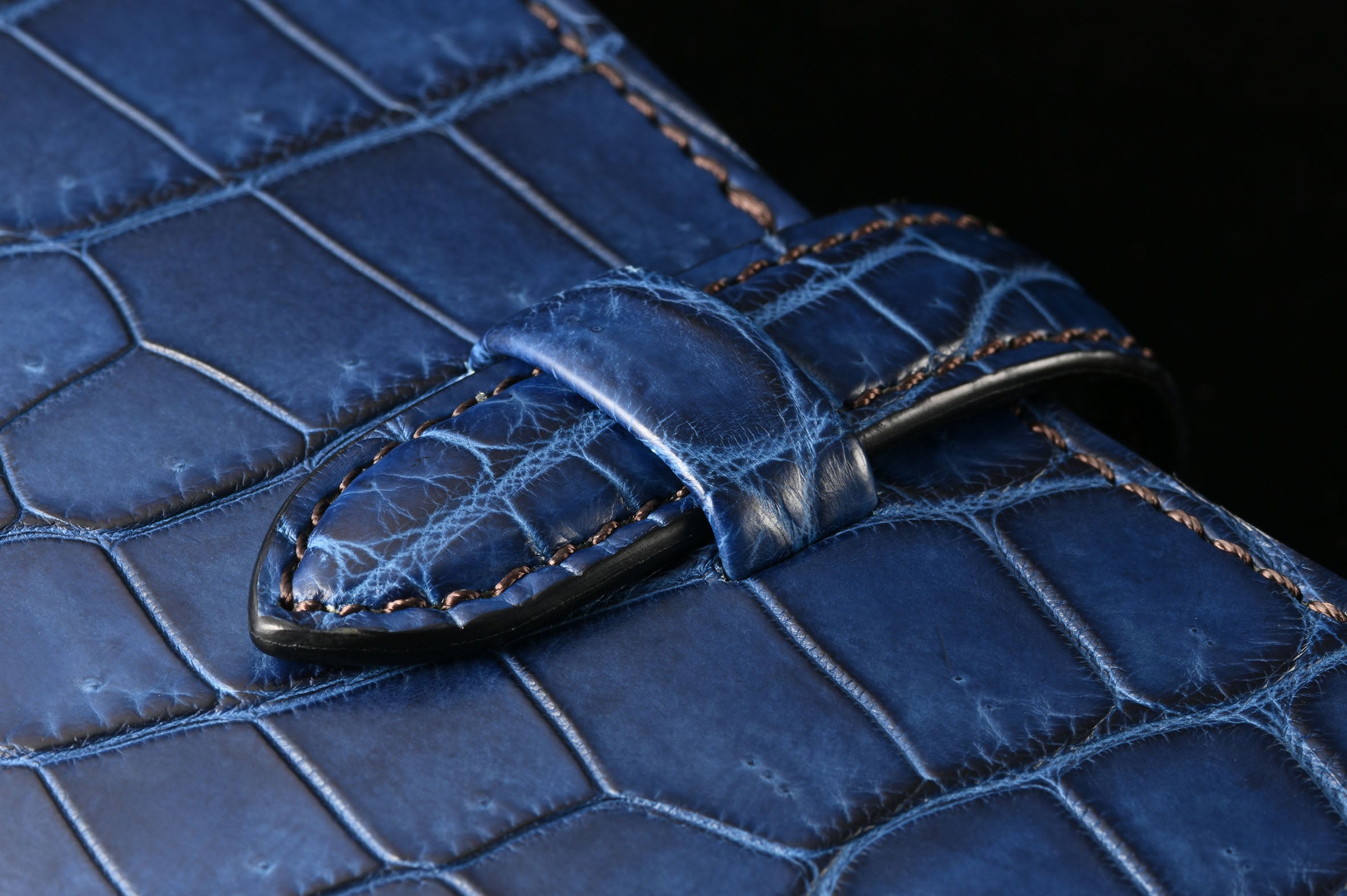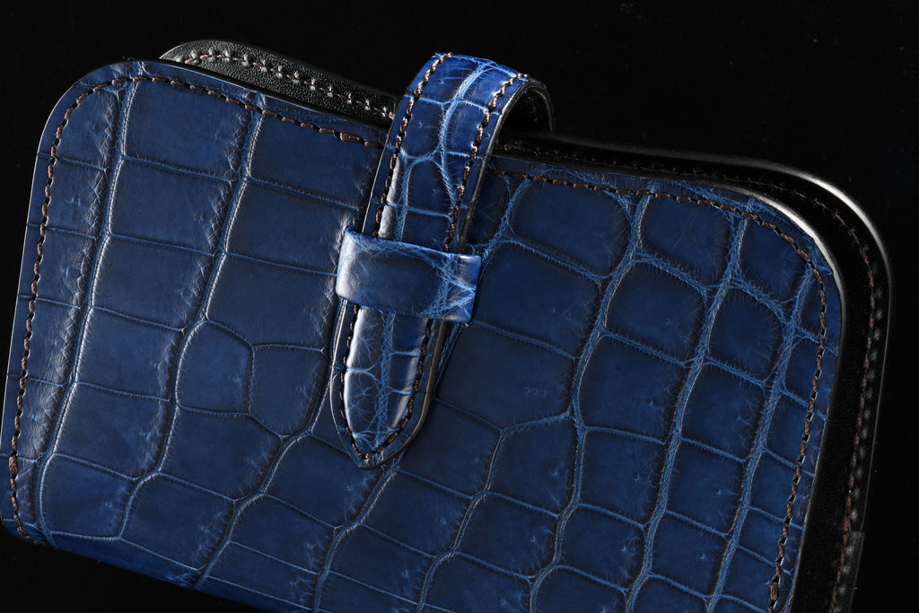 天然藍で染め上げたクロコダイルは、深みのある青の中に繊細な濃淡が宿り、光の加減によって多彩な表情を見せてくれます。まるで静かな水面に揺らめく光を閉じ込めたかのような奥行きと、他を寄せ付けない圧倒的な存在感を感じさせる素材です。