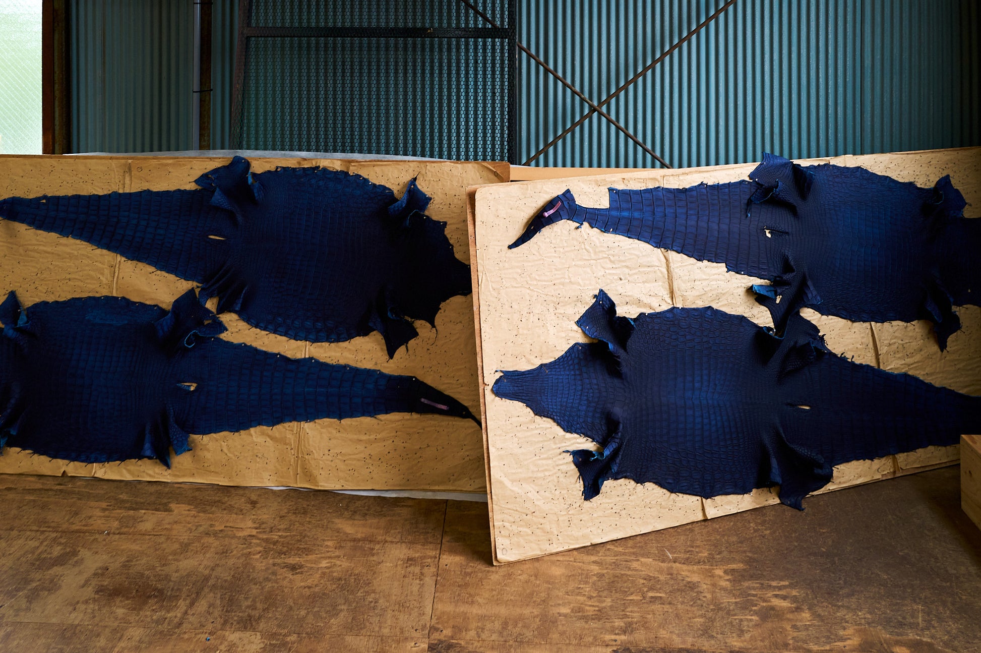 今回は、ワイルドスワンズと提携しているタンナーを取材。写真は藍染め前のナイルクロコダイルです。中央の竹斑から外側の丸斑へと移り変わる美しさに心を奪われました。ワイルドスワンズでは、傷などが少ない、グレードの高い上質なものだけを厳選。品質管理も徹底しています。