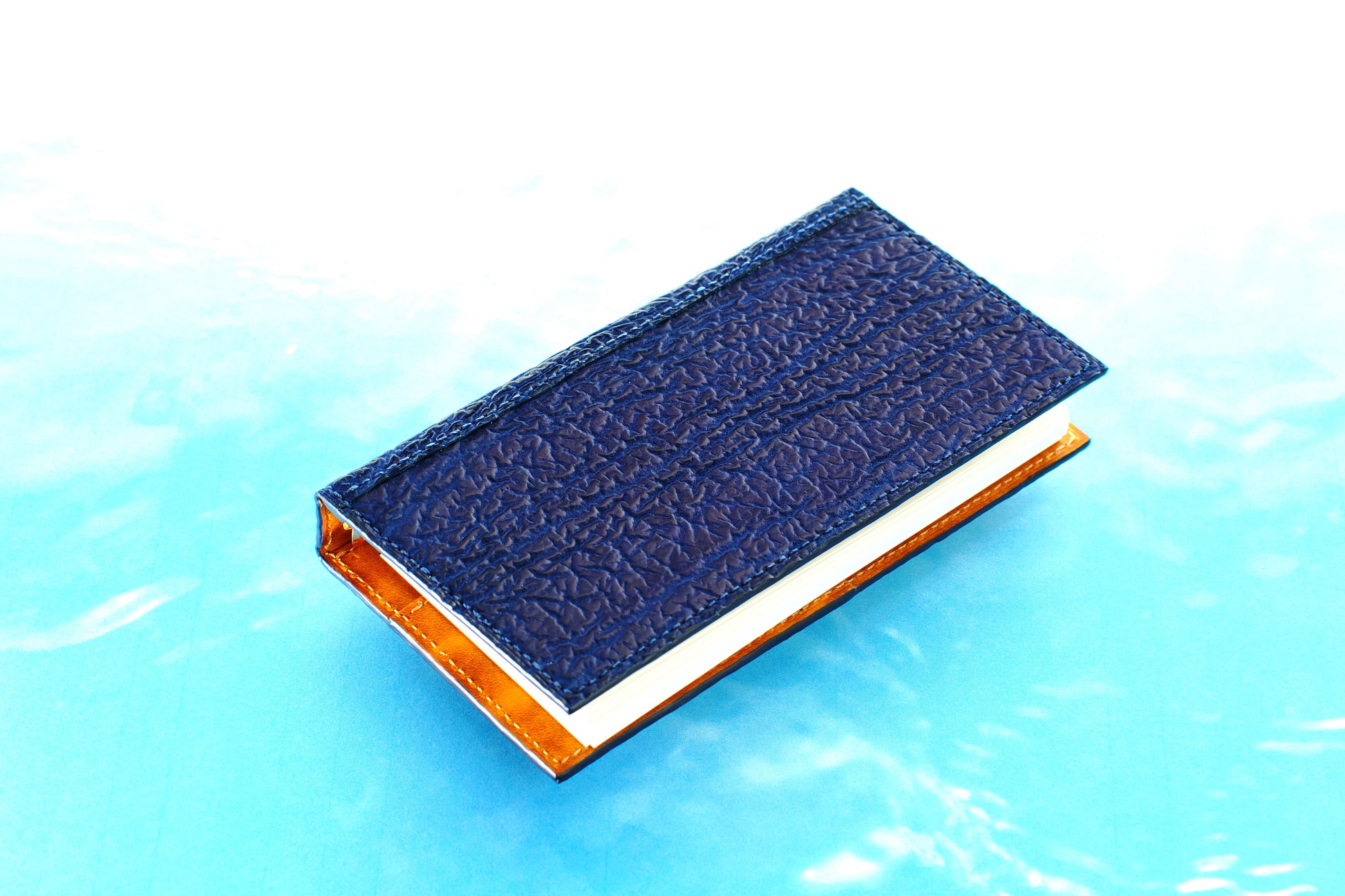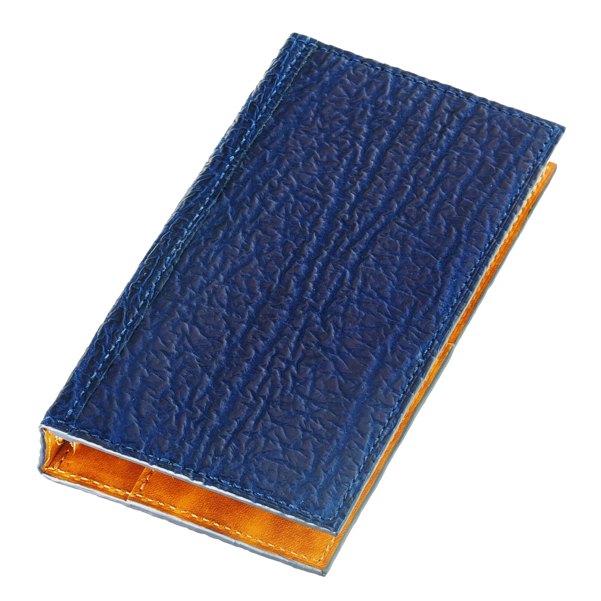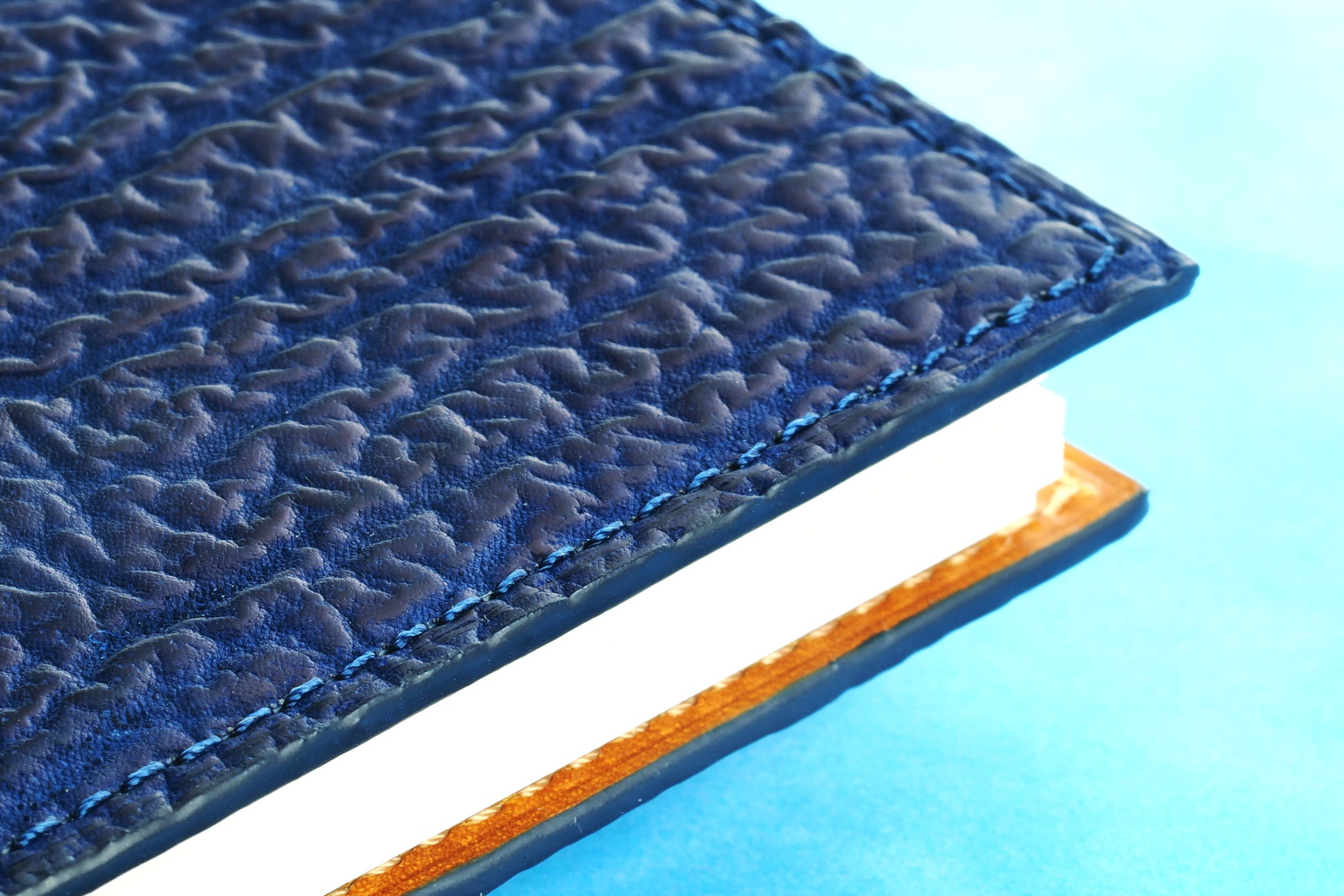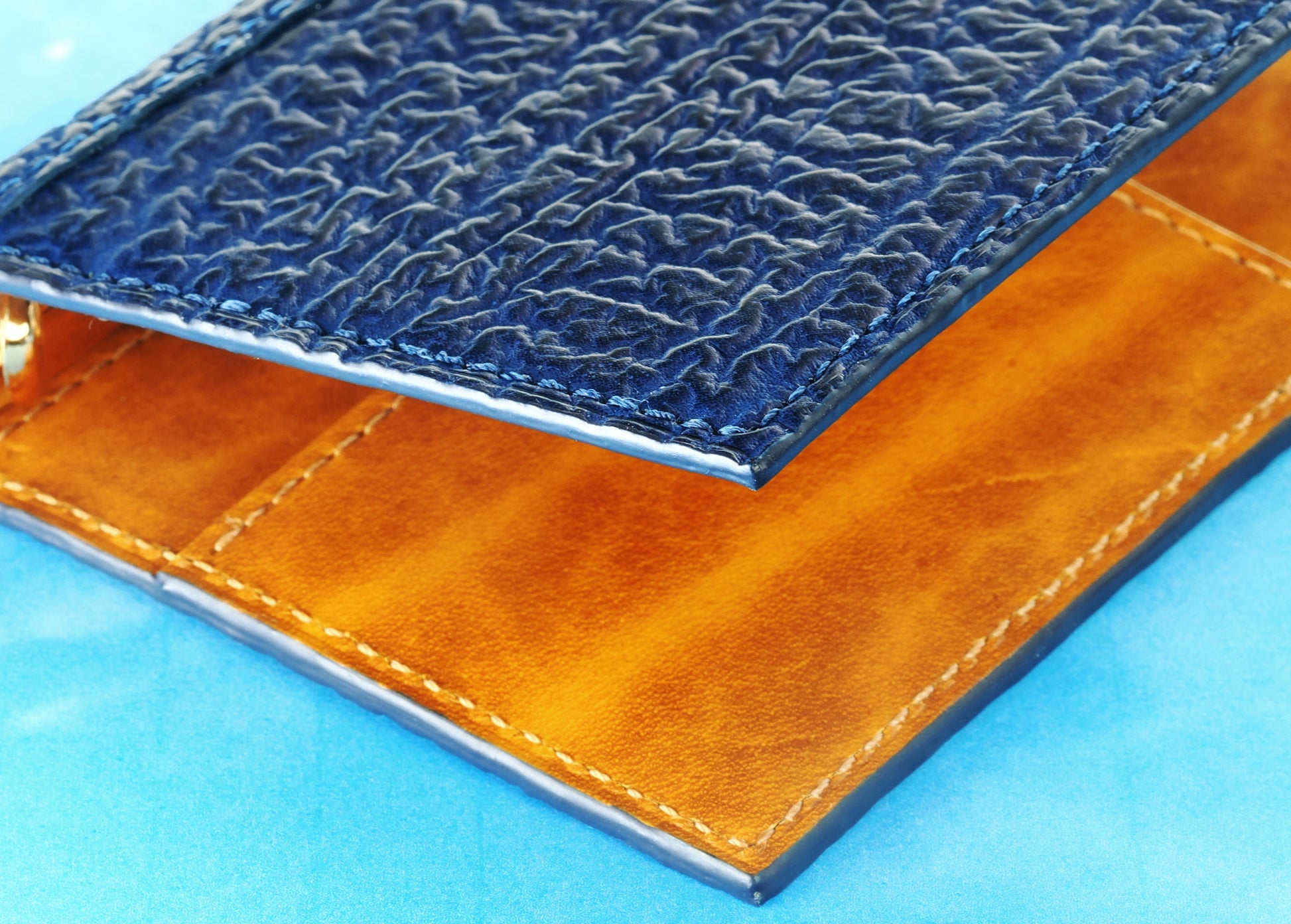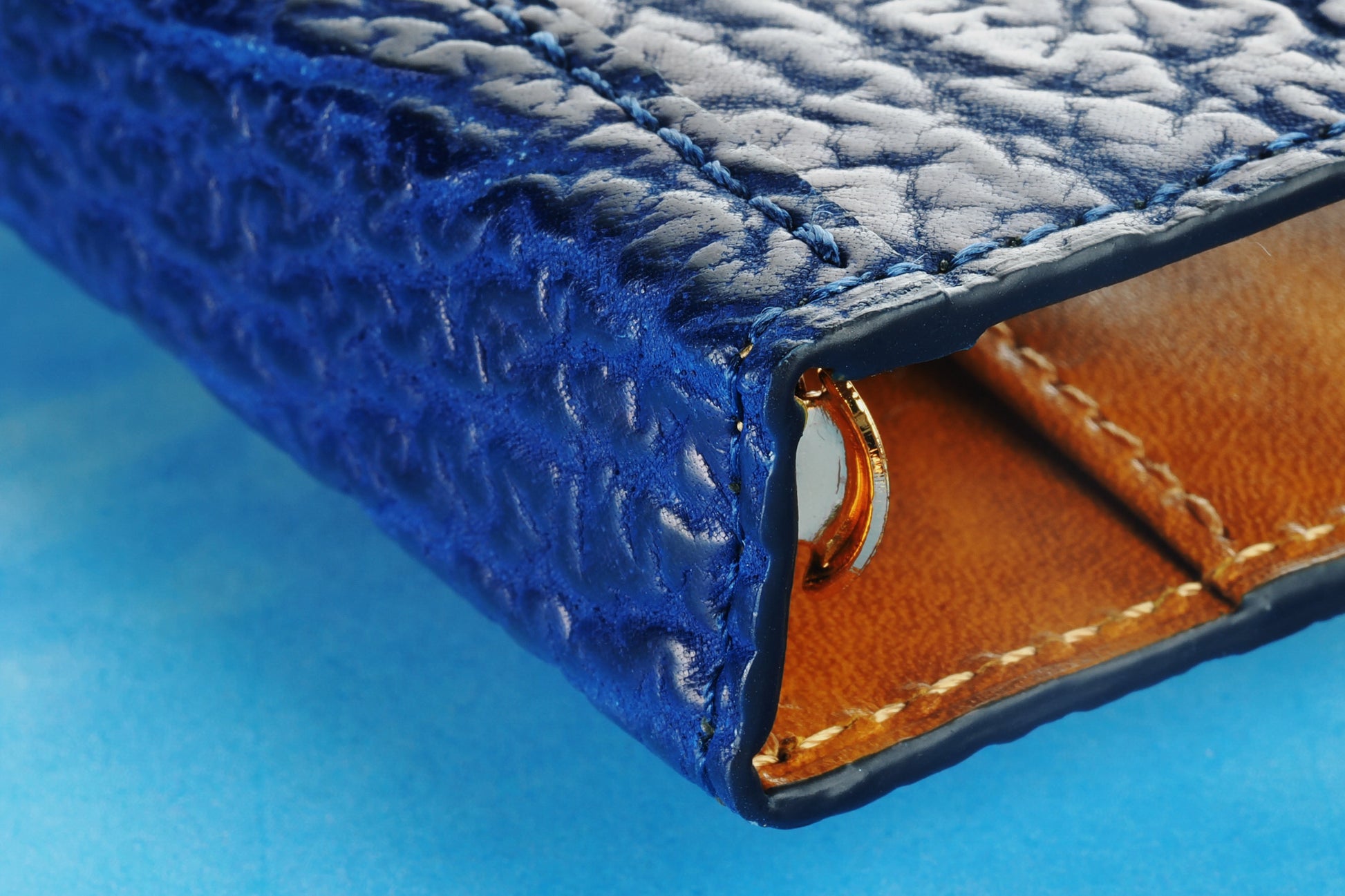 純国産のサメ革を使った深みのある藍染ブルーが映える