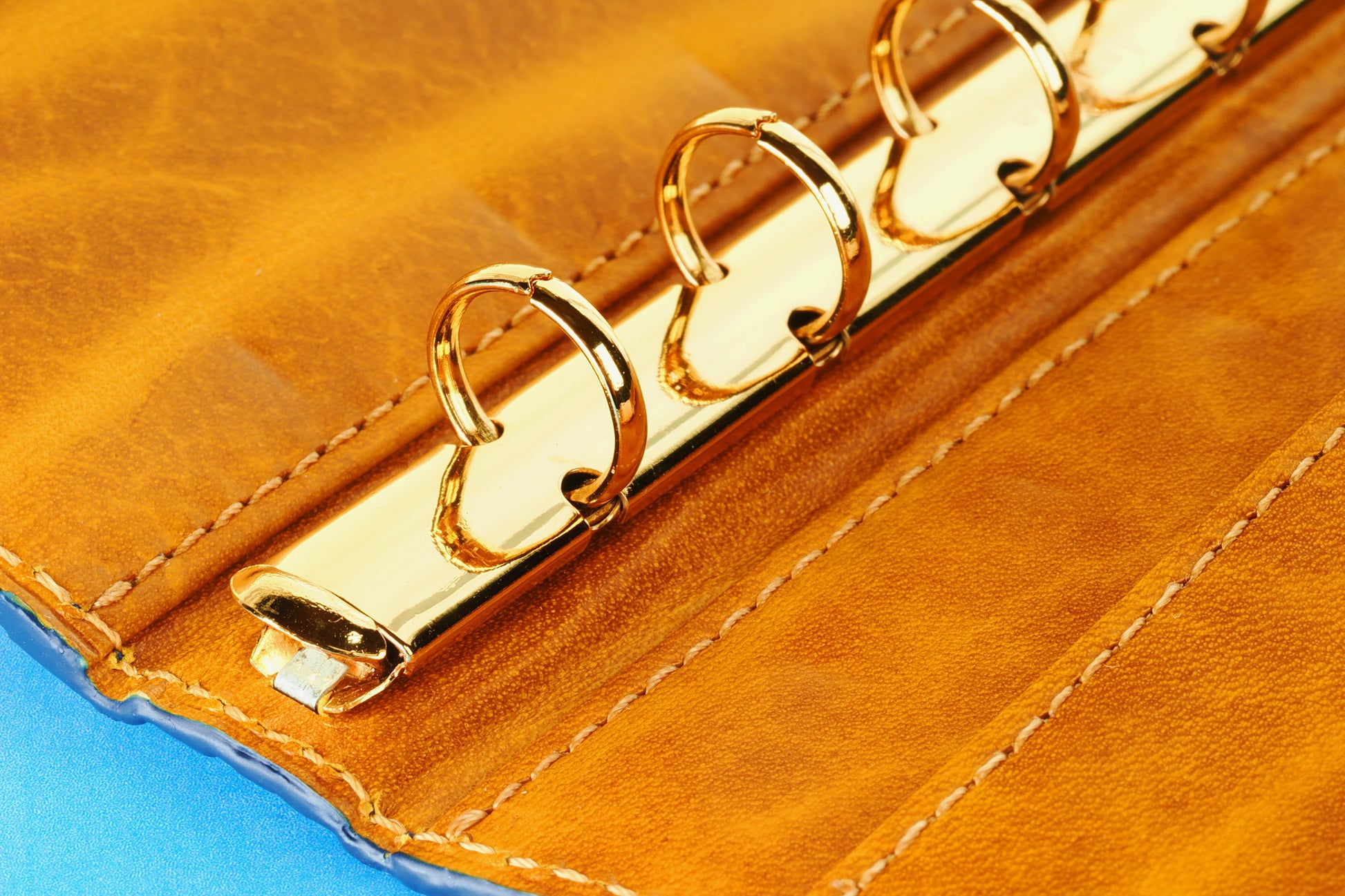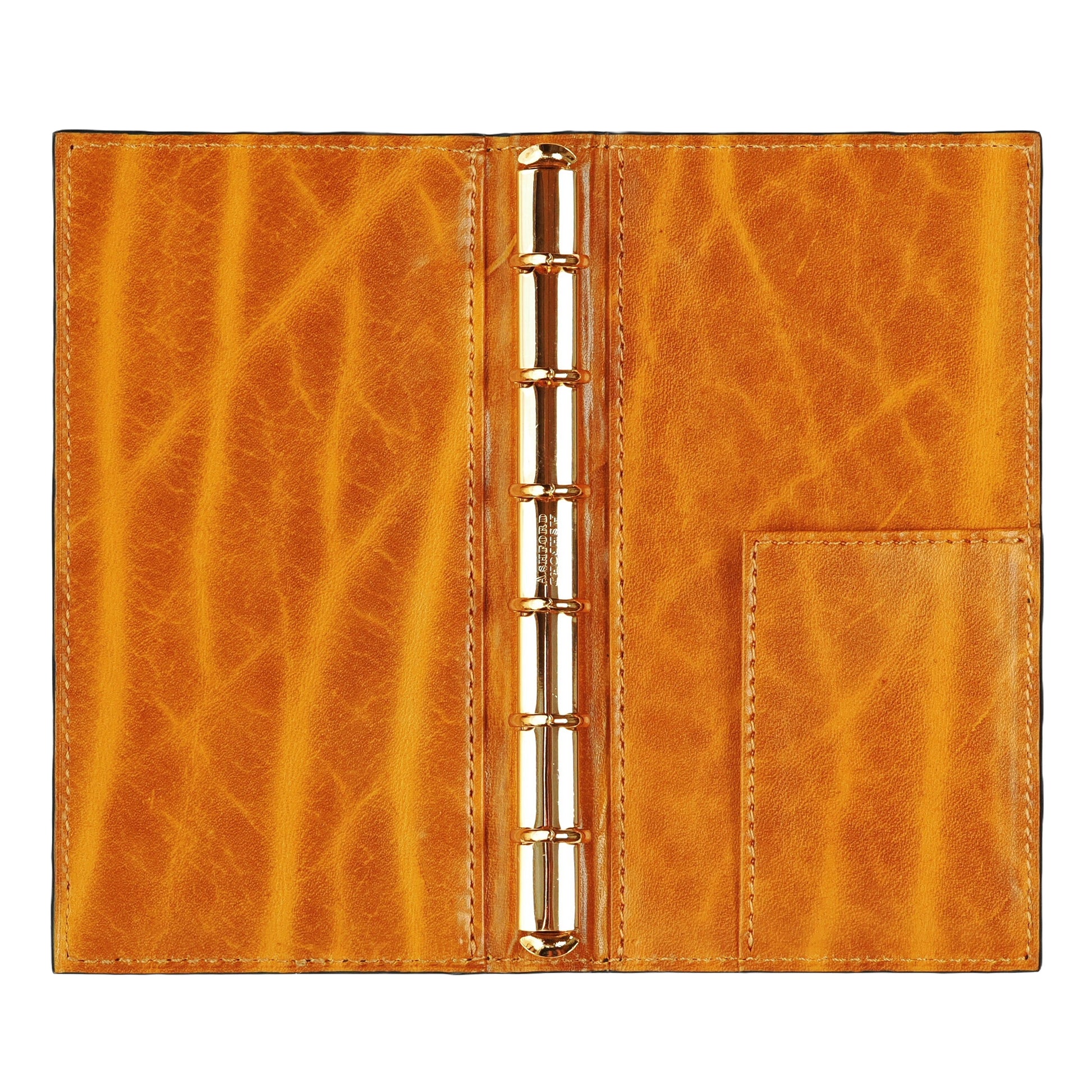 内側には定評のある高級牛革ルガードを採用。ルガードの色はイエローで、独特のトラ模様と相まって表のブルーと強烈なコントラストを放ちます。リングはクラシカルなゴールドを組み合わせて高級感を演出。リング径は11mmでコンパクトかつ適度なリフィル枚数を綴じることができます。