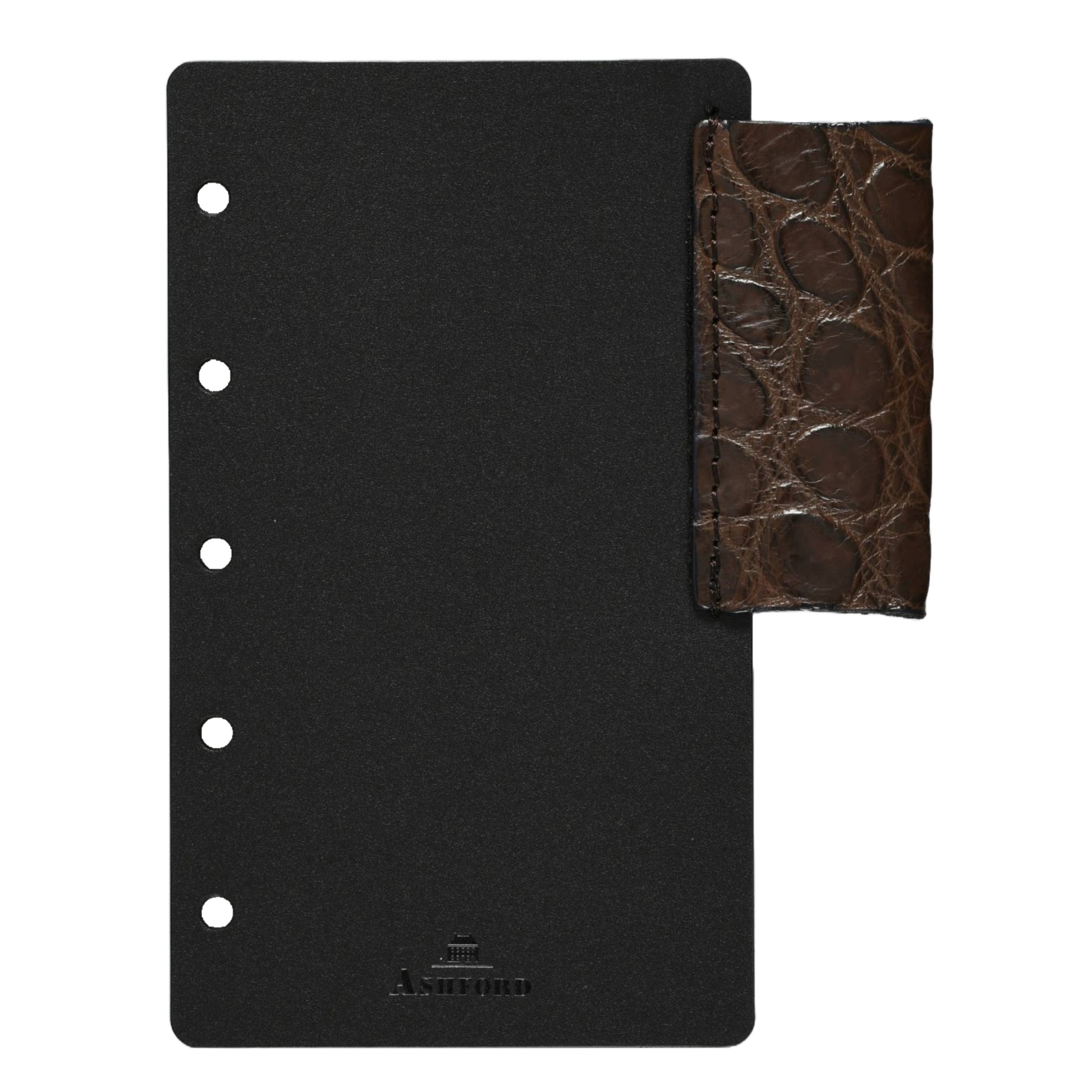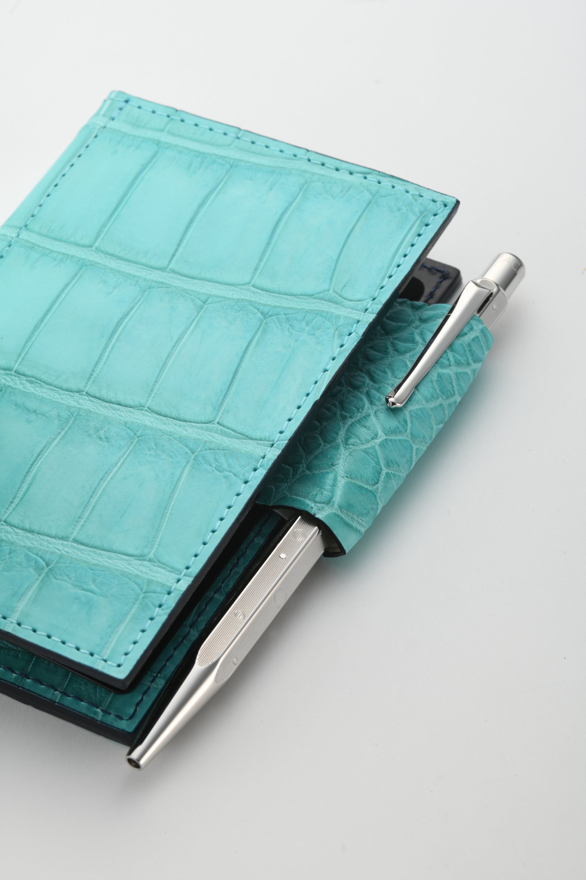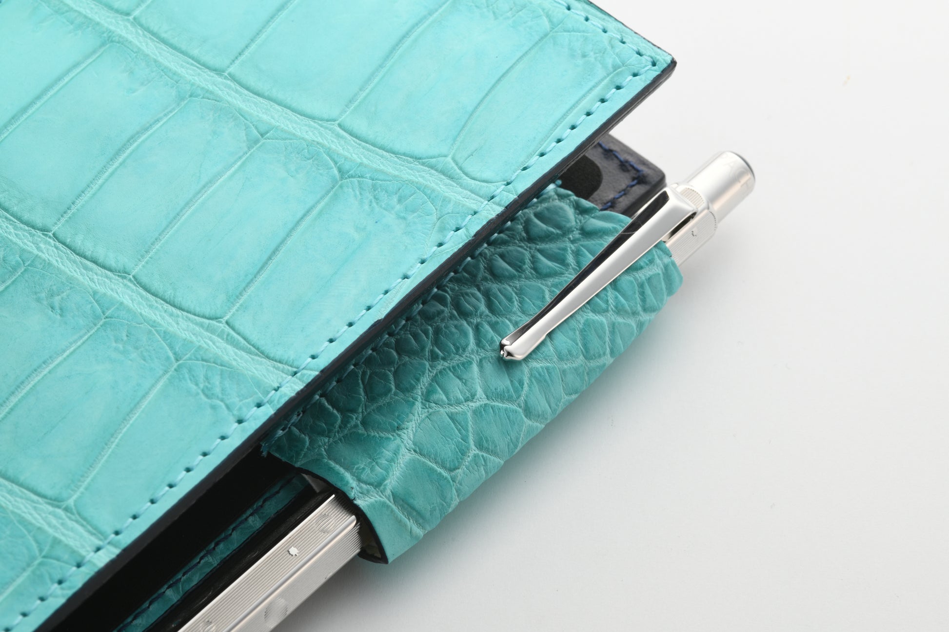 システム手帳にペンホルダーの機能を追加するアクセサリーです。ホルダーの本革部分には、ワニ革の中でも希少かつ最高級のスモールクロコダイル「ポロサス」を採用しています。表面の仕上げはマットな質感のグレージング加工で、気品のある上質さを表現。そして使い込んでいくほどに本物のクロコダイルならではの艶上がりが楽しめます。