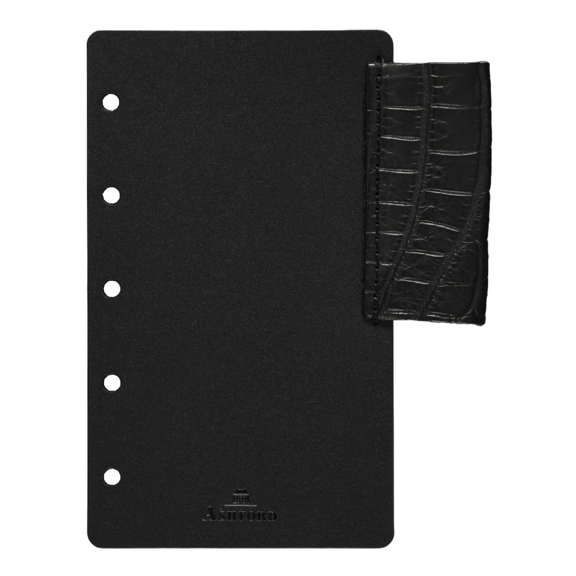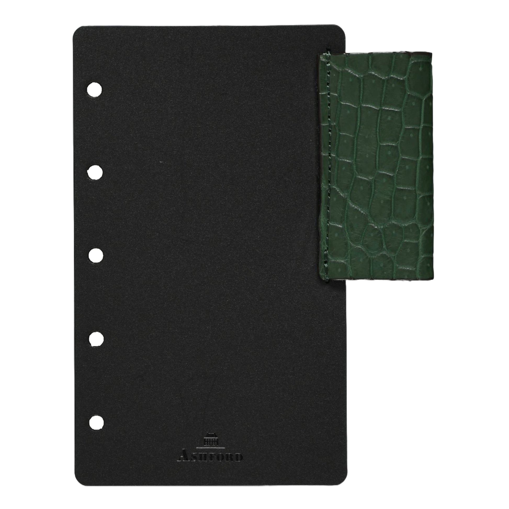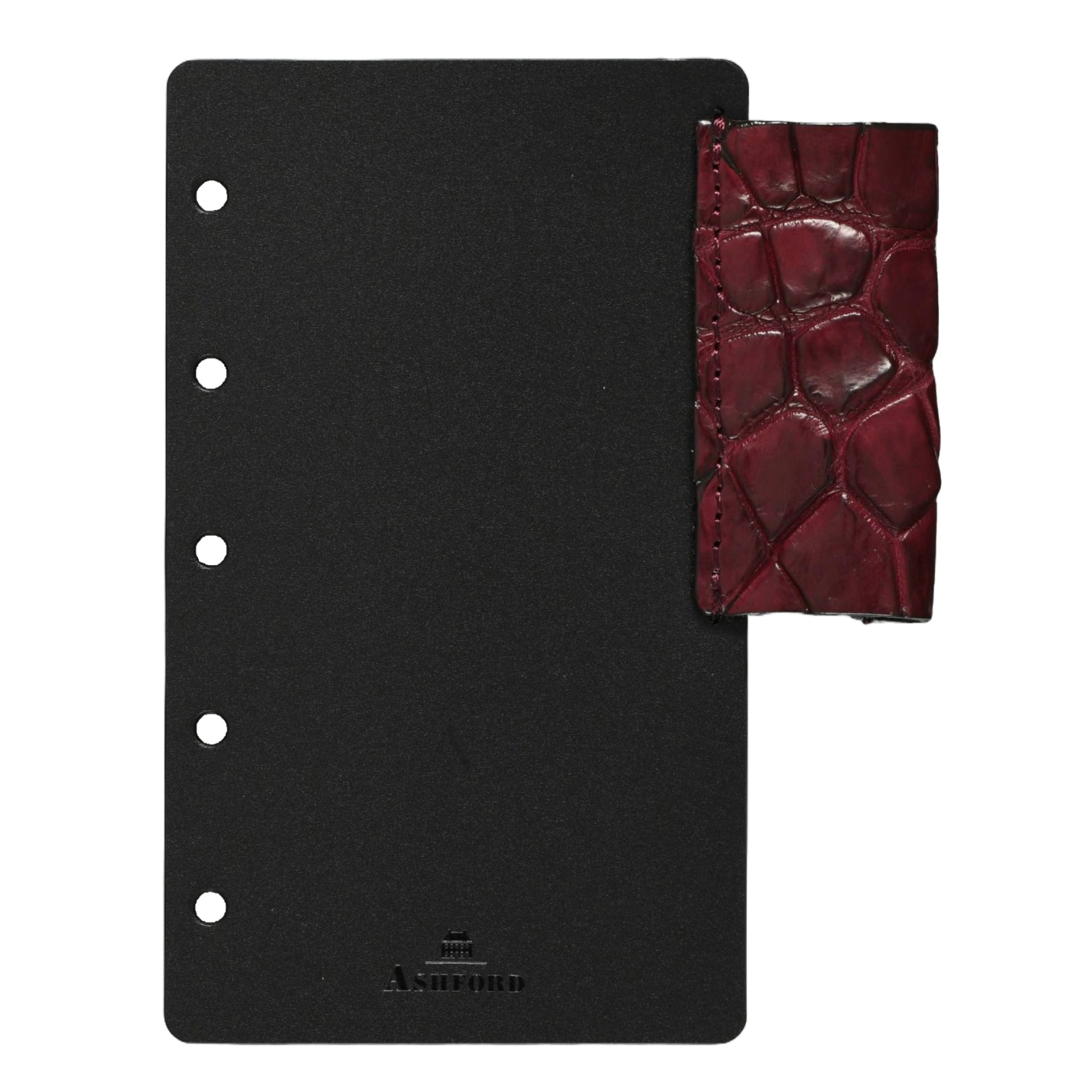 システム手帳にペンホルダーの機能を追加するアクセサリーです。ホルダーの本革部分には、ワニ革の中でも希少かつ最高級のスモールクロコダイル「ポロサス」を採用しています。表面の仕上げはマットな質感のグレージング加工で、気品のある上質さを表現。そして使い込んでいくほどに本物のクロコダイルならではの艶上がりが楽しめます。