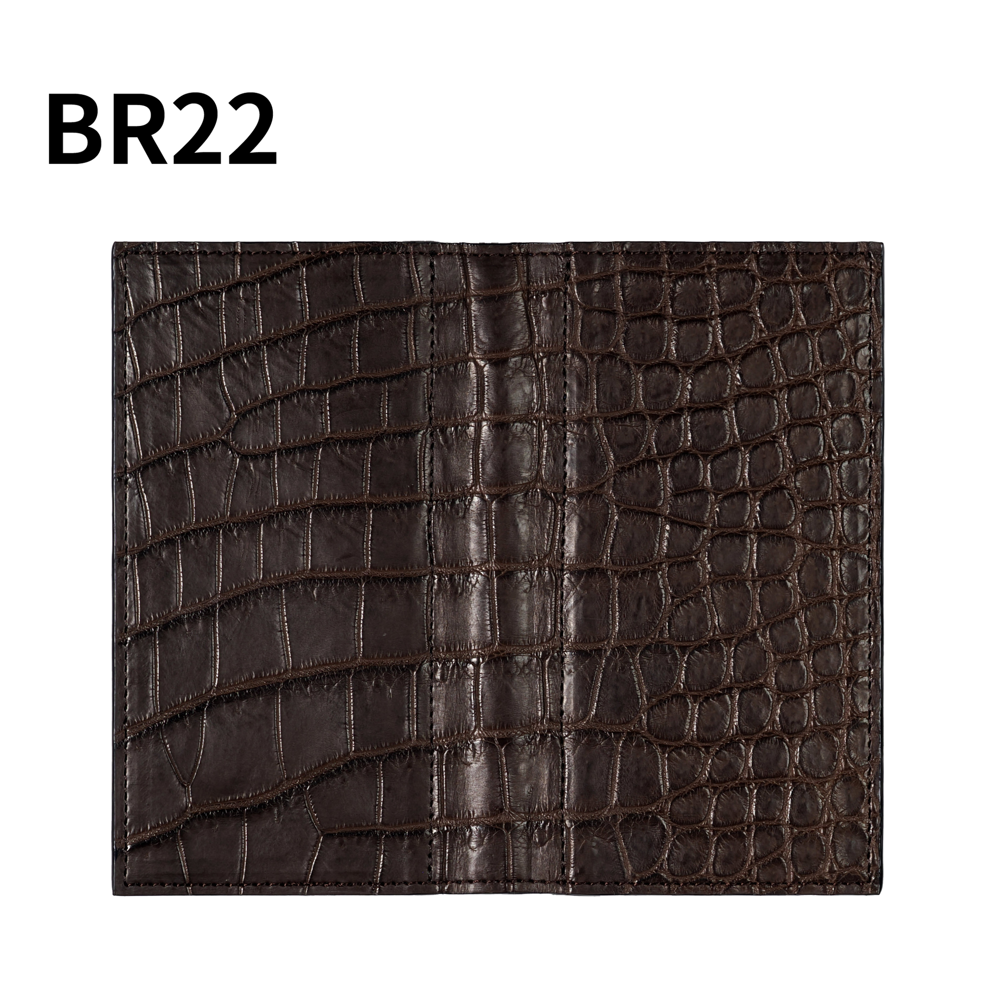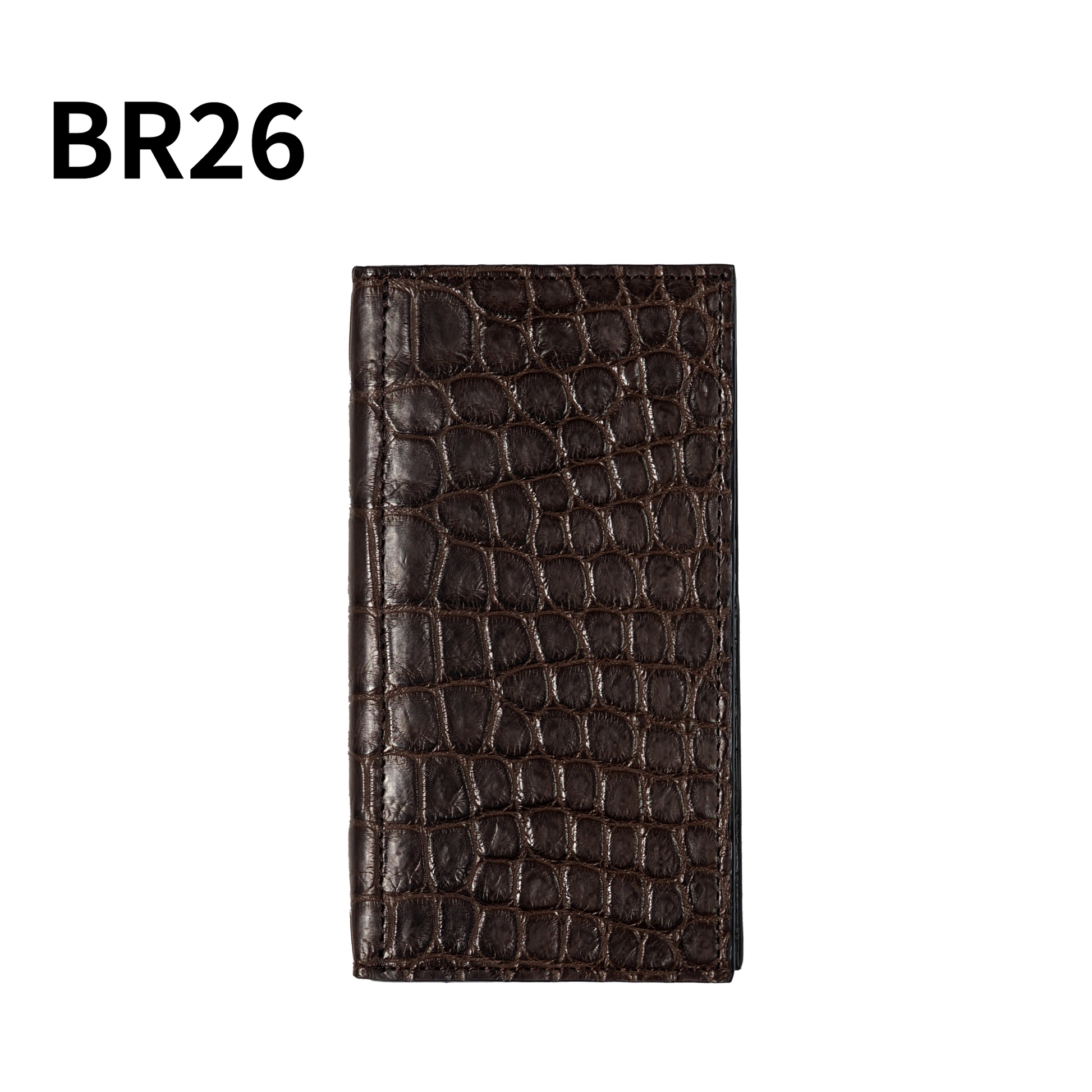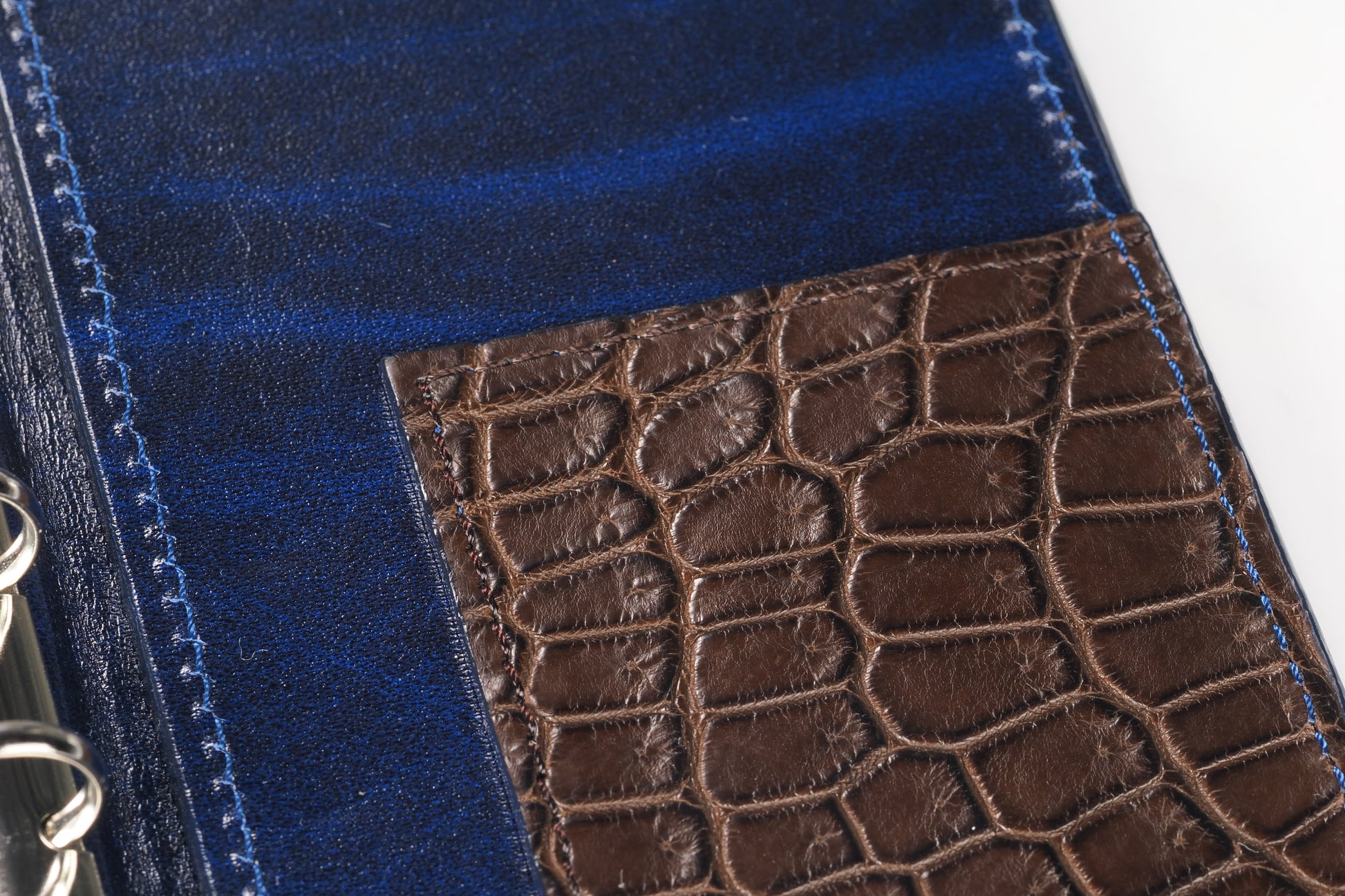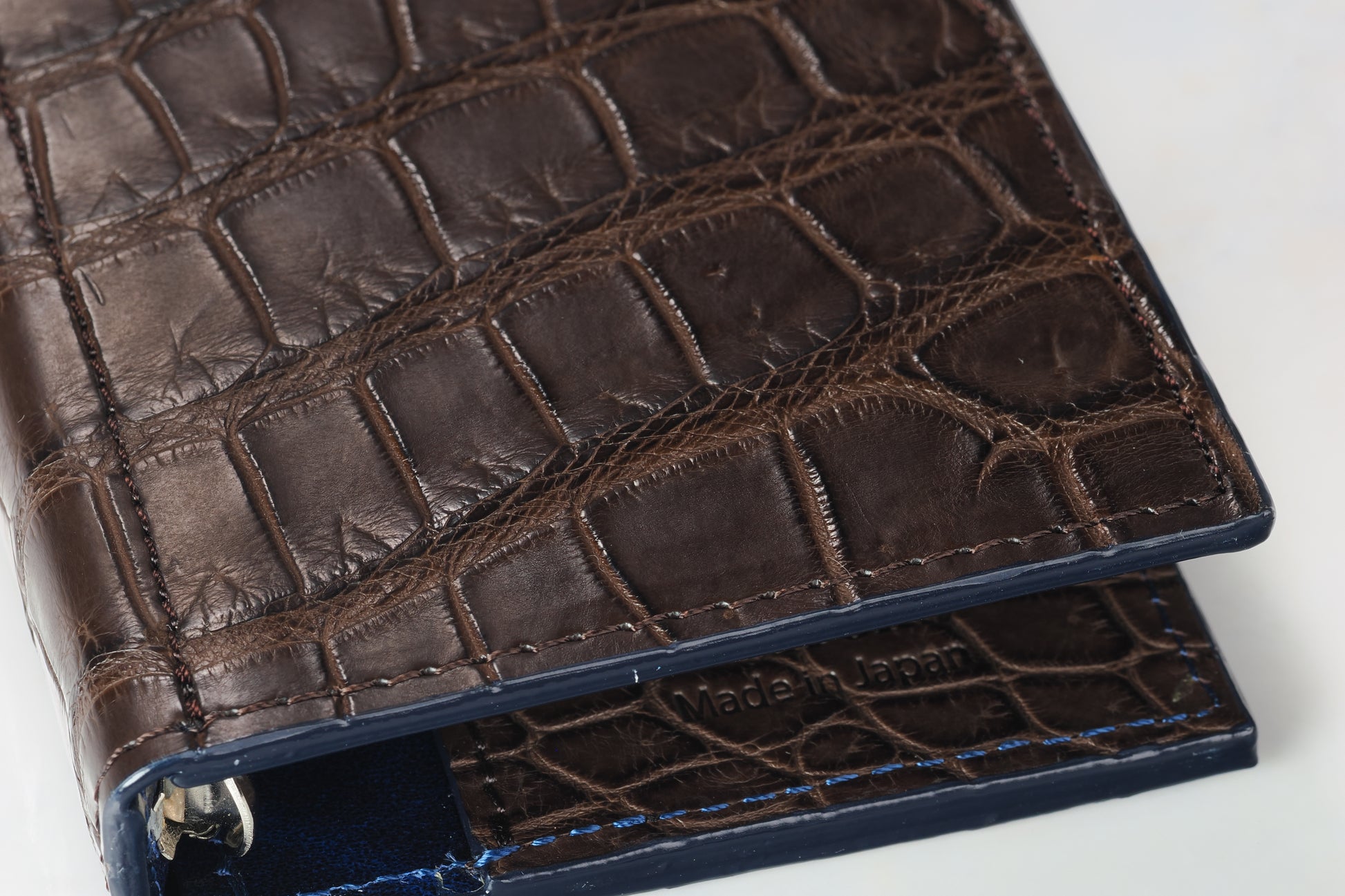 ミニ6ナローは、趣味の文具箱が開発した独自のサイズです。このシリーズの最高峰となるモデル「クロコダイル」です。表側は、ワニ革の中でも希少かつ最高級のスモールクロコダイル「ポロサス」の1枚革を採用。天然のクロコダイルの絶妙な形の鱗(竹腑)の配置が美しい。
