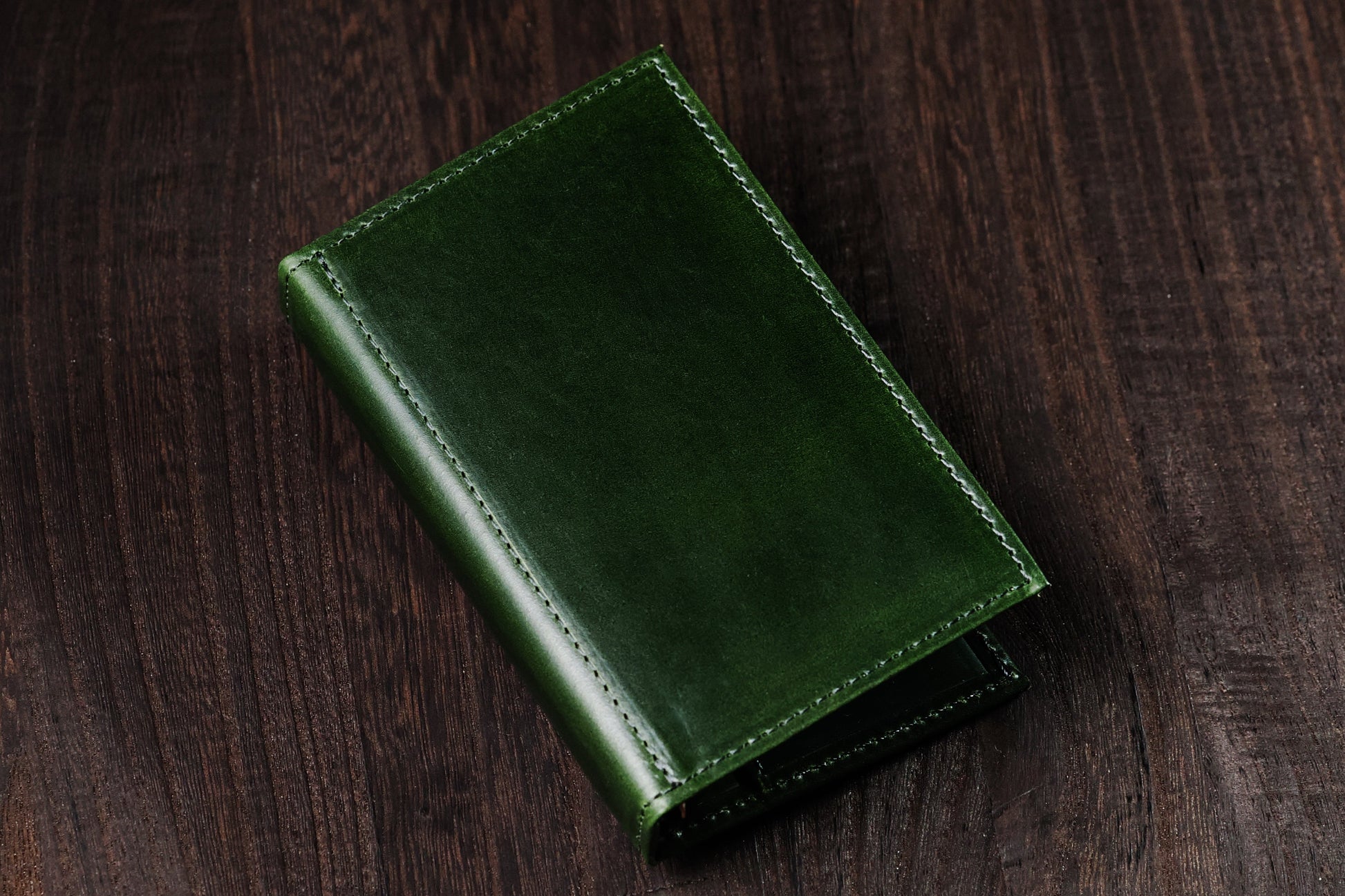 国産コードバンの大手「宮内産業(長野県)」の最高級コードバンを使ったマイクロ5(M5)のシステム手帳です。深みのあるグリーンは、使い込むほどに艶が増していきます。
