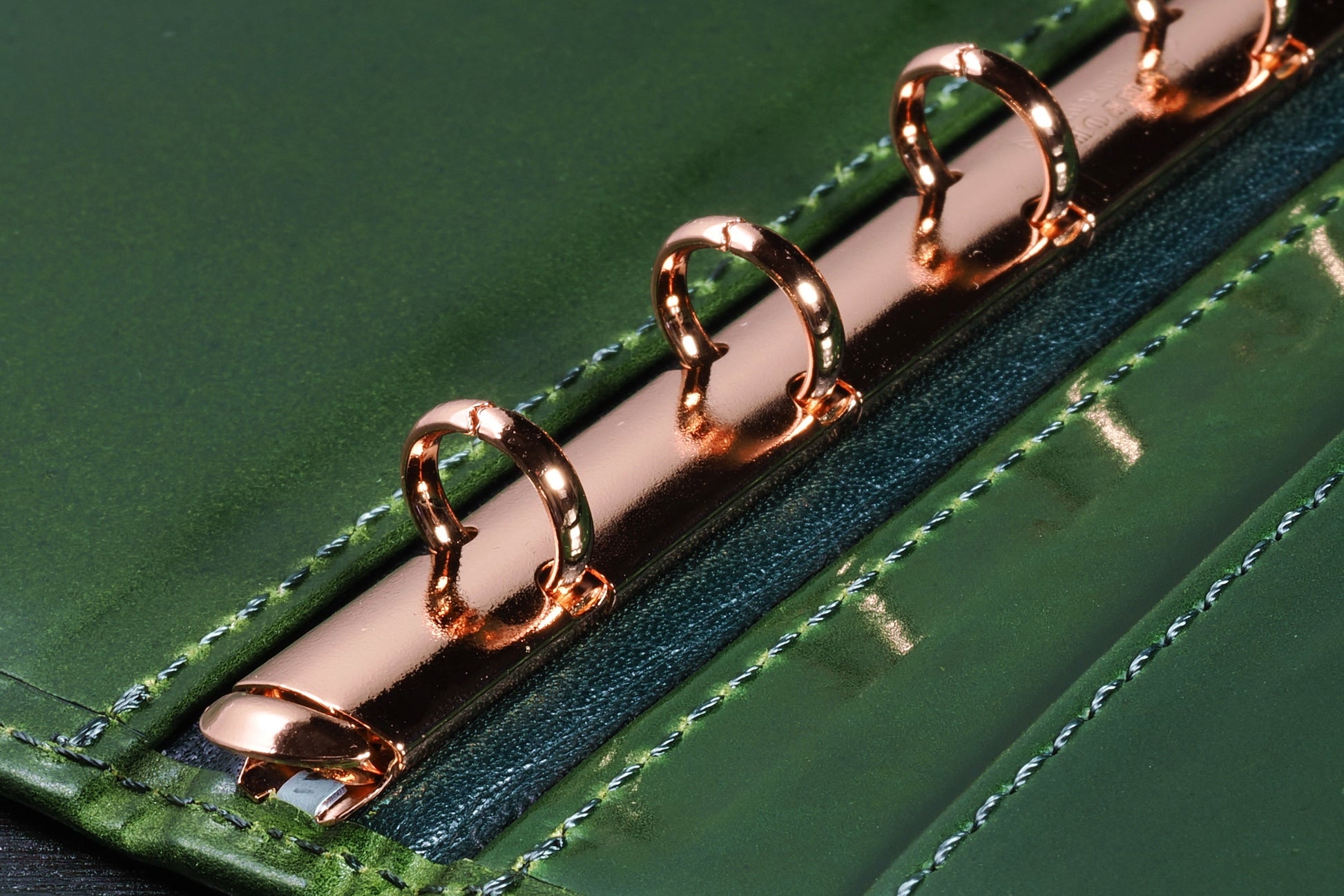 リング金具は赤みを帯びたローズゴールドメッキで、コードバンとの色の対比が美しく映えます。