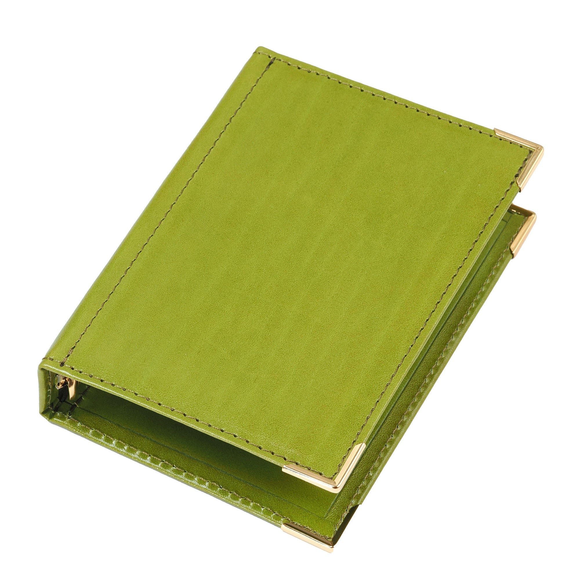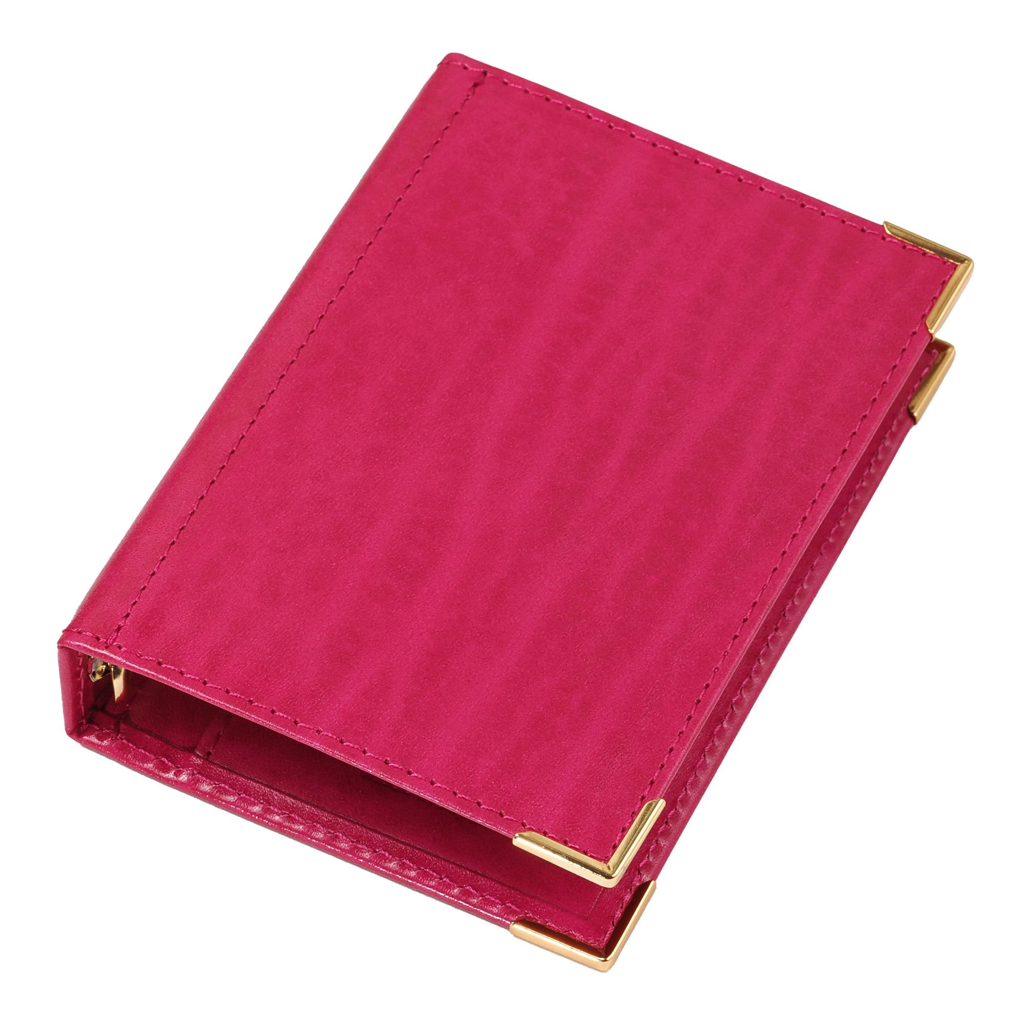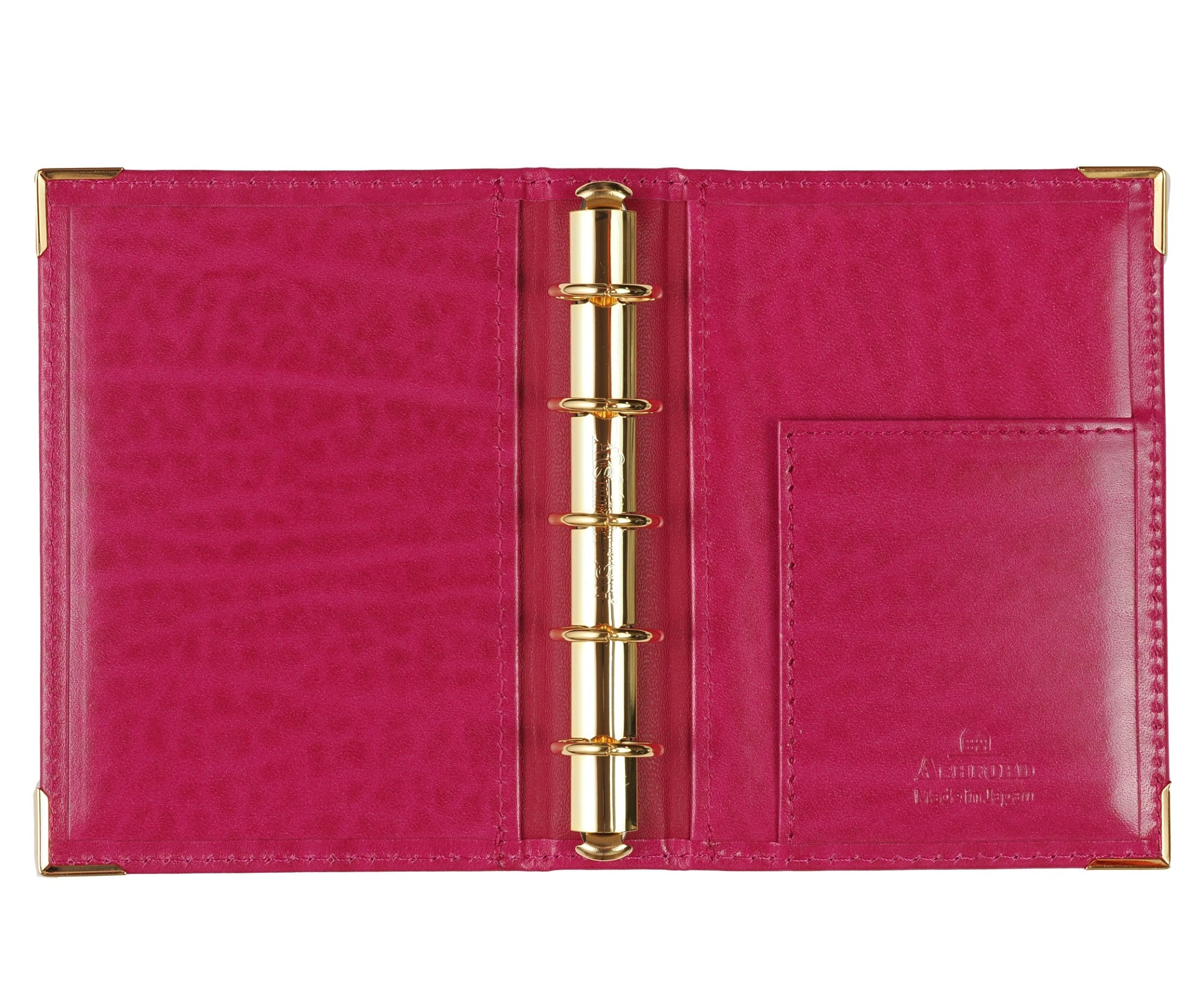 クラシカルな印象を際立たせているのが、カバー隅の金色のコーナー金具。大きなリングも同系の金色です。