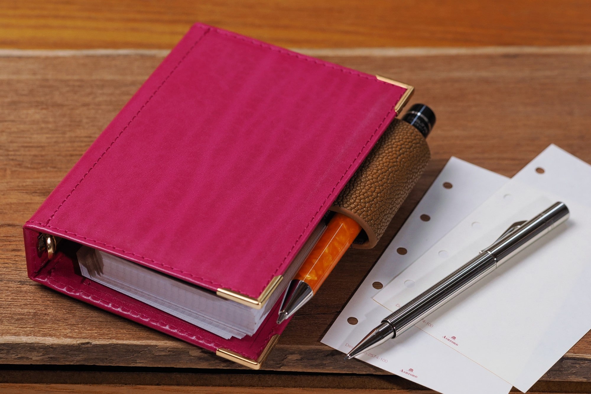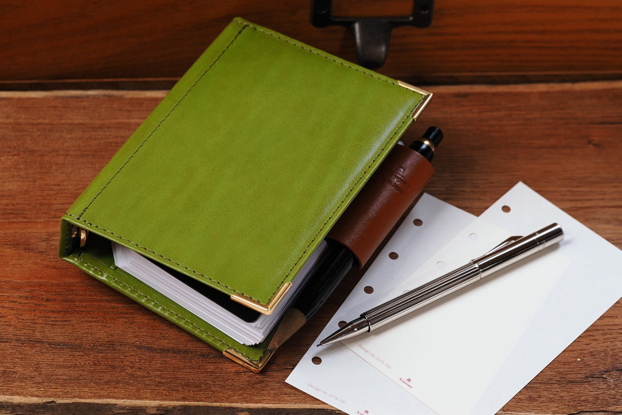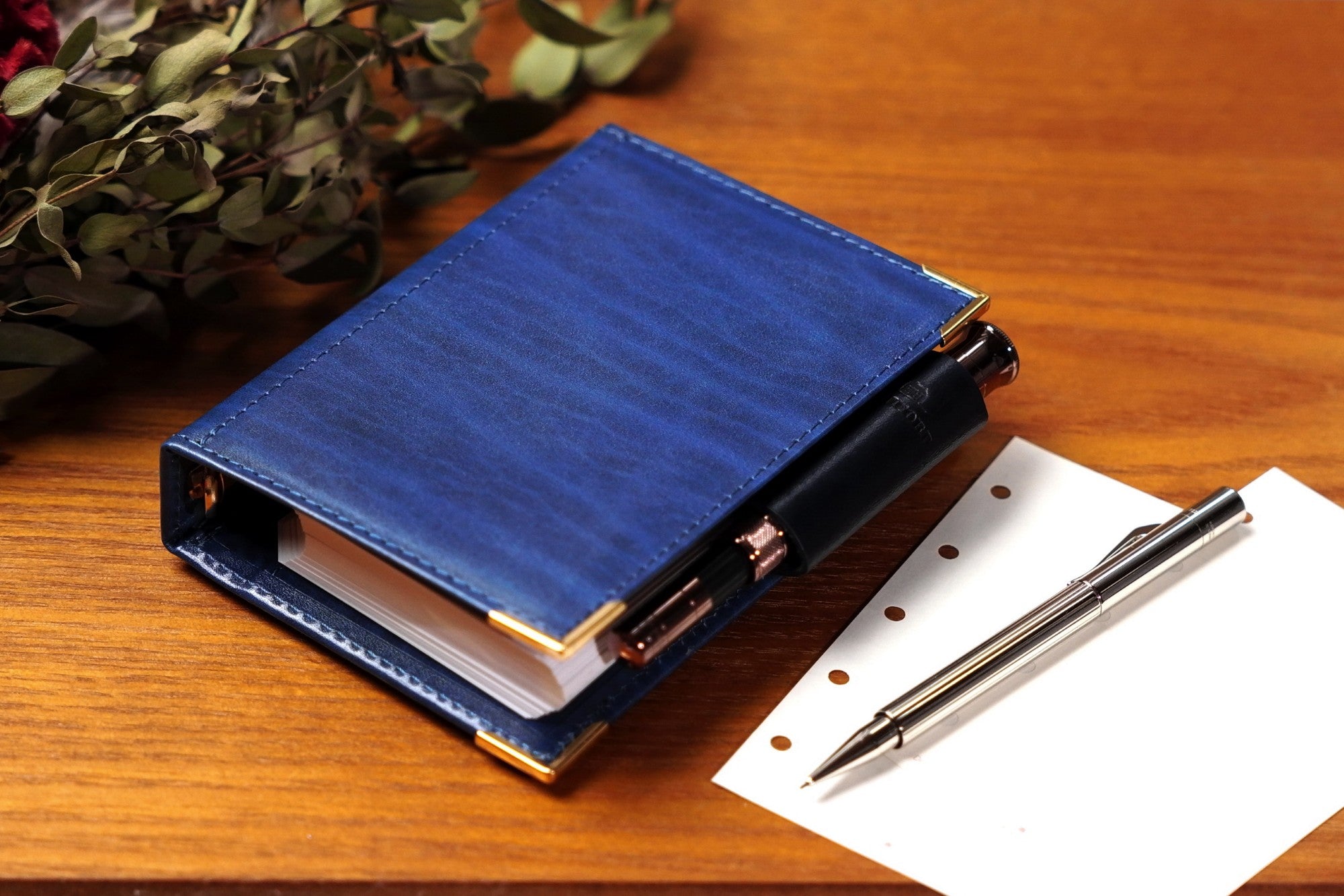このモデルはアシュフォードが開発した最新の17mm大口径リングを搭載。M5としては最大級で、多くのリフィルを綴じることができます。リフィル満載の姿はまるで本革を纏った小型の辞書や聖書のよう。
