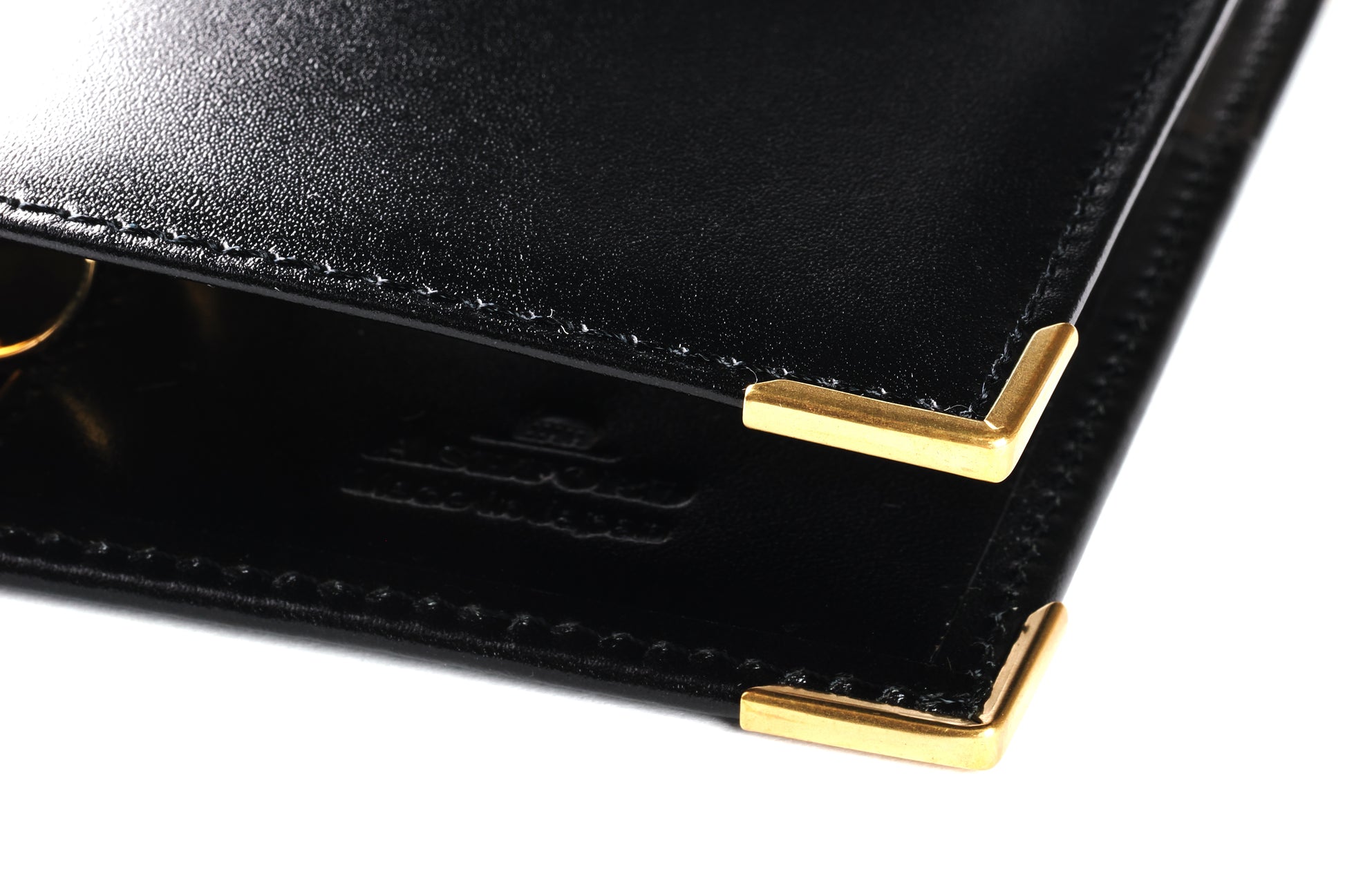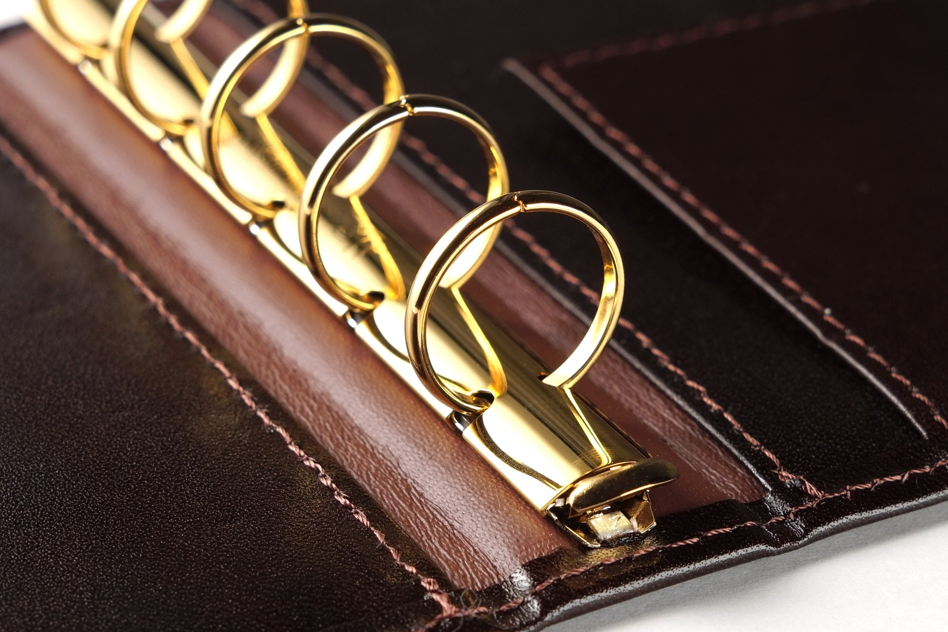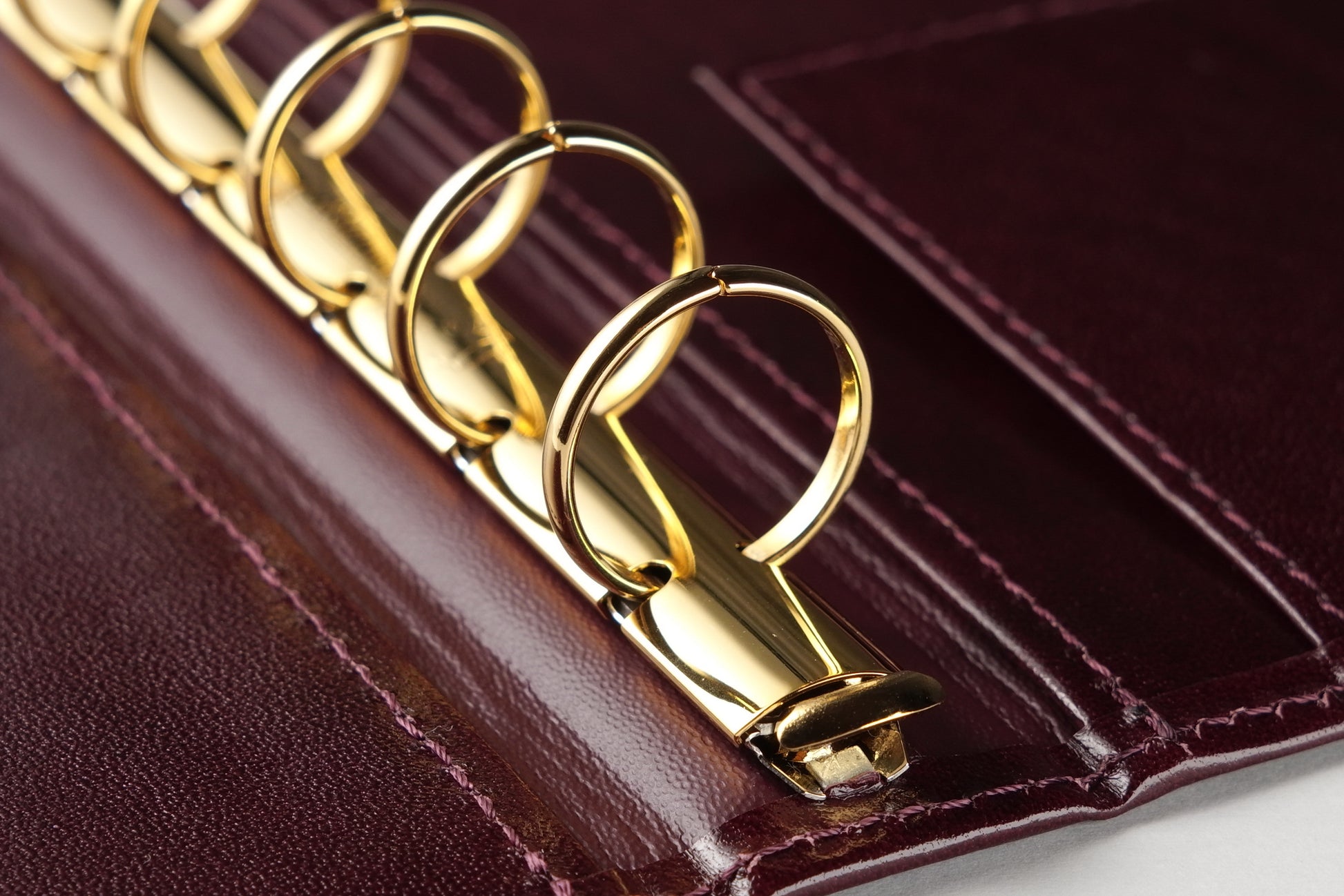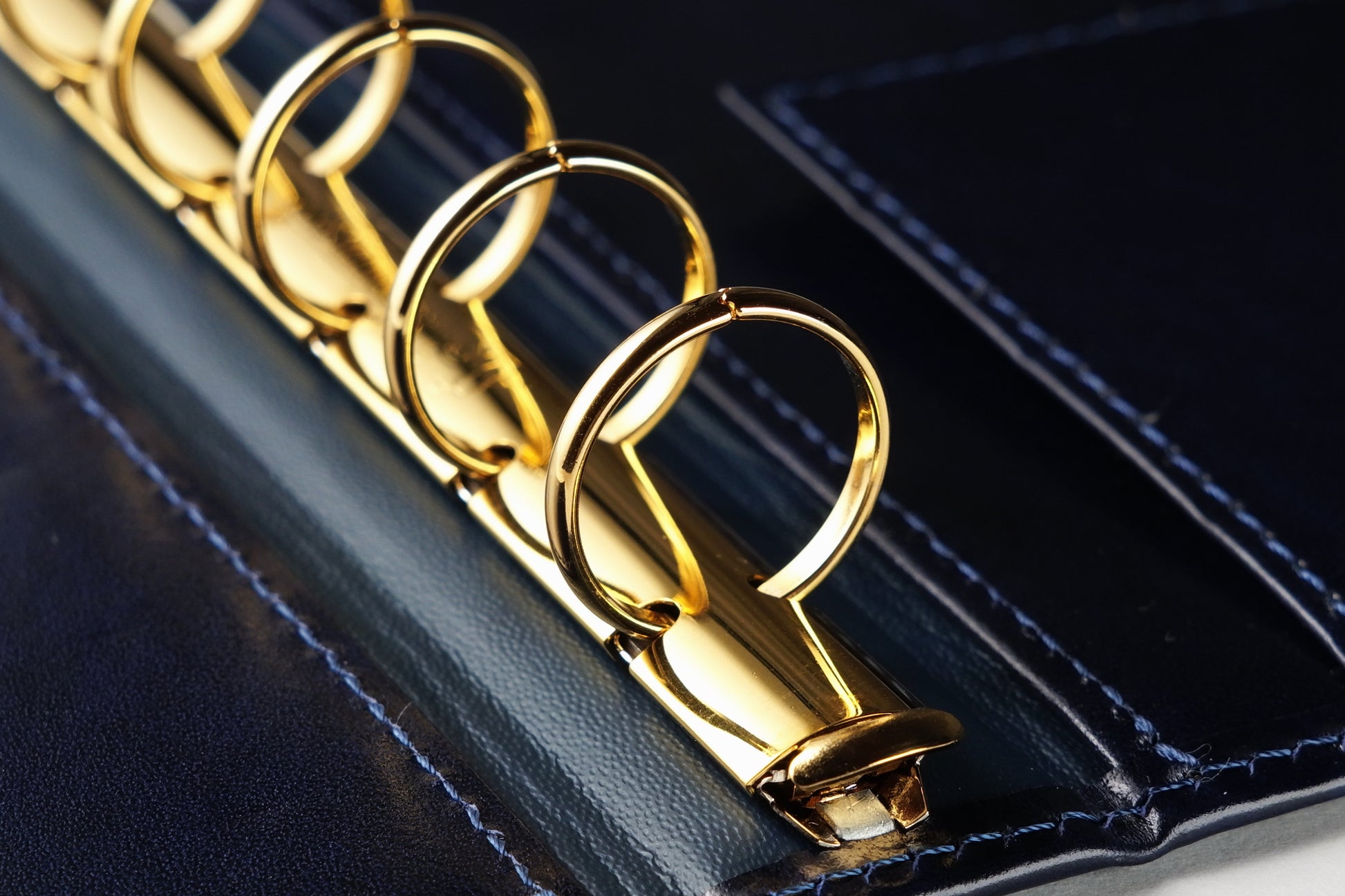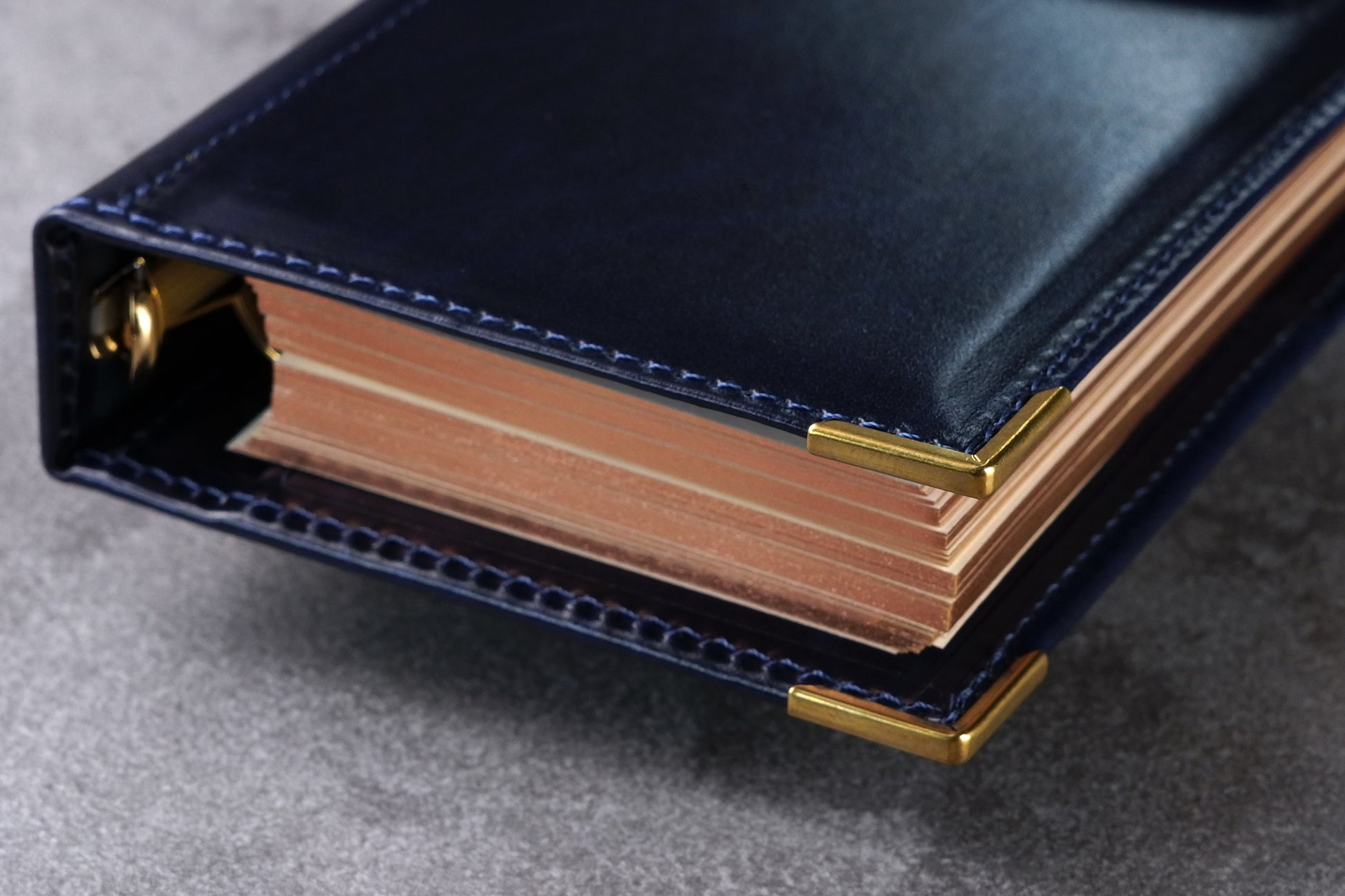 クラシカルな印象を際立たせているのが、カバー隅の金色のコーナー金具。大きなリングも同系の金色です。