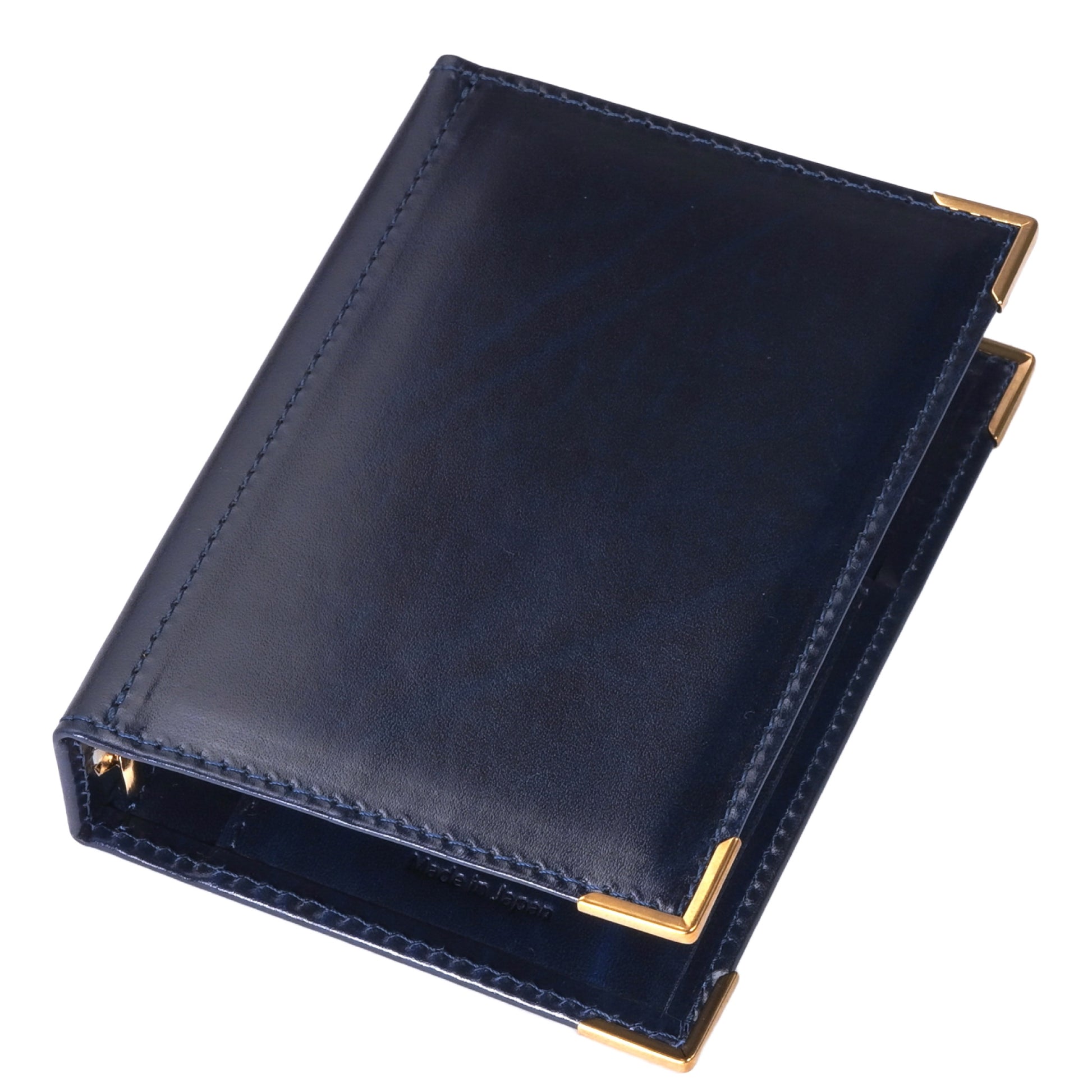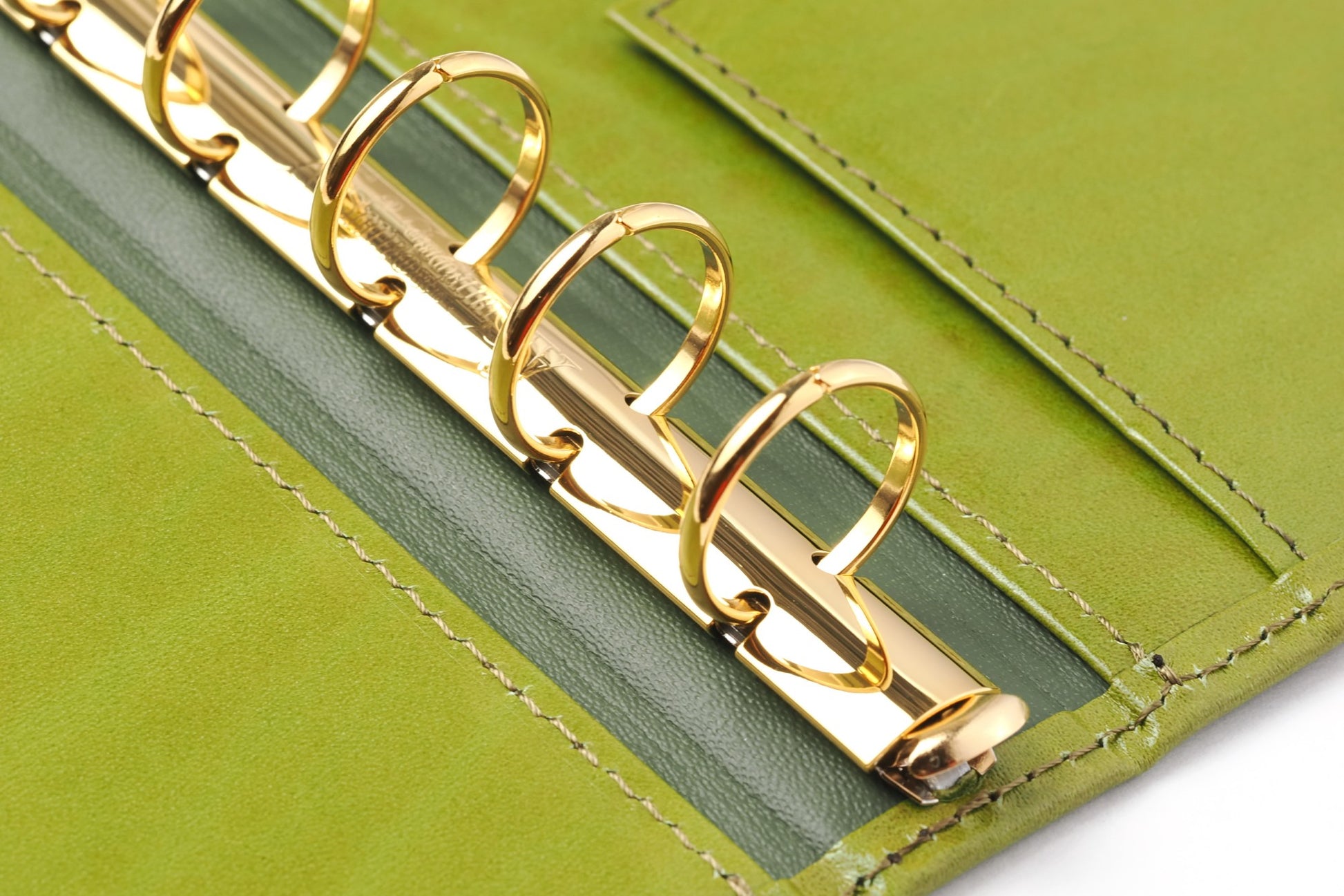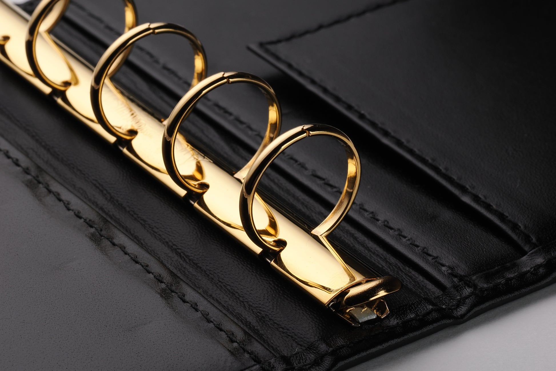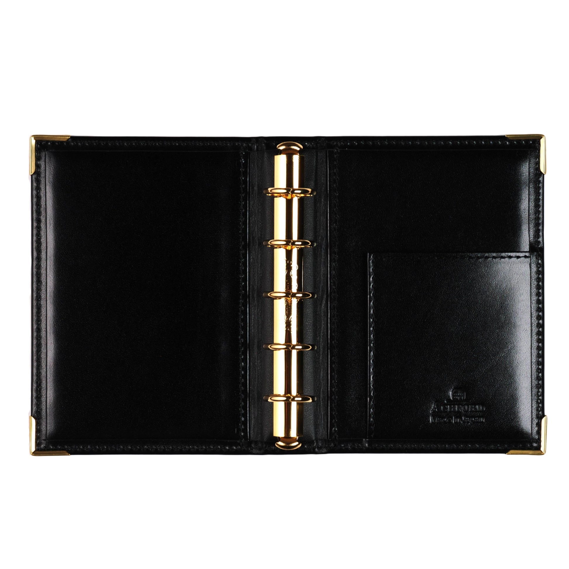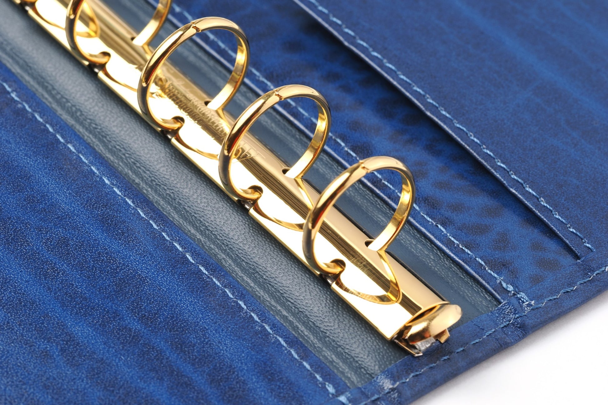クラシカルな印象を際立たせているのが、カバー隅の金色のコーナー金具。大きなリングも同系の金色です。