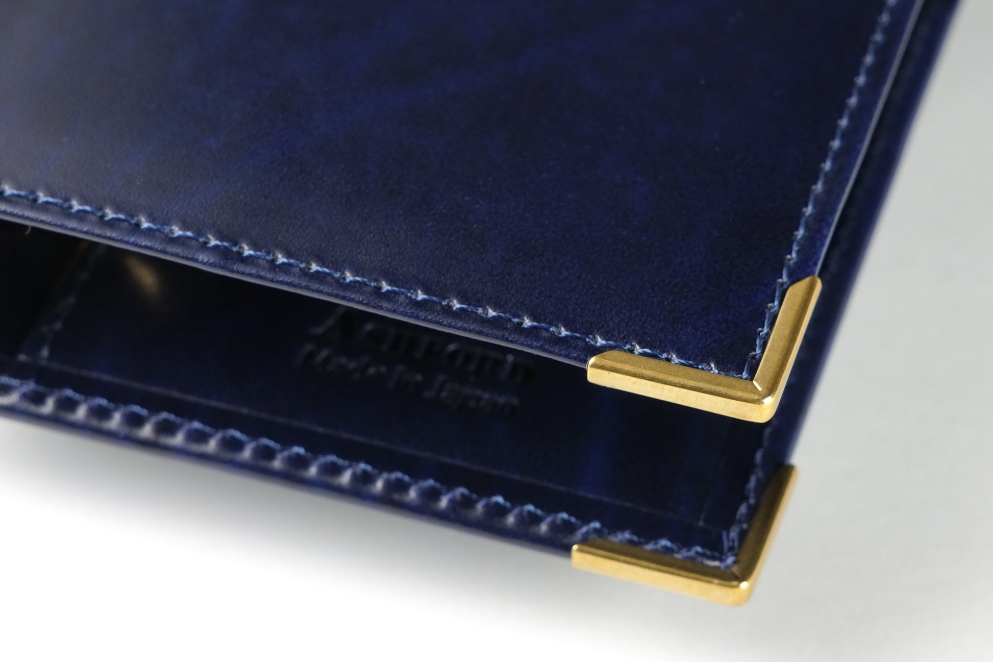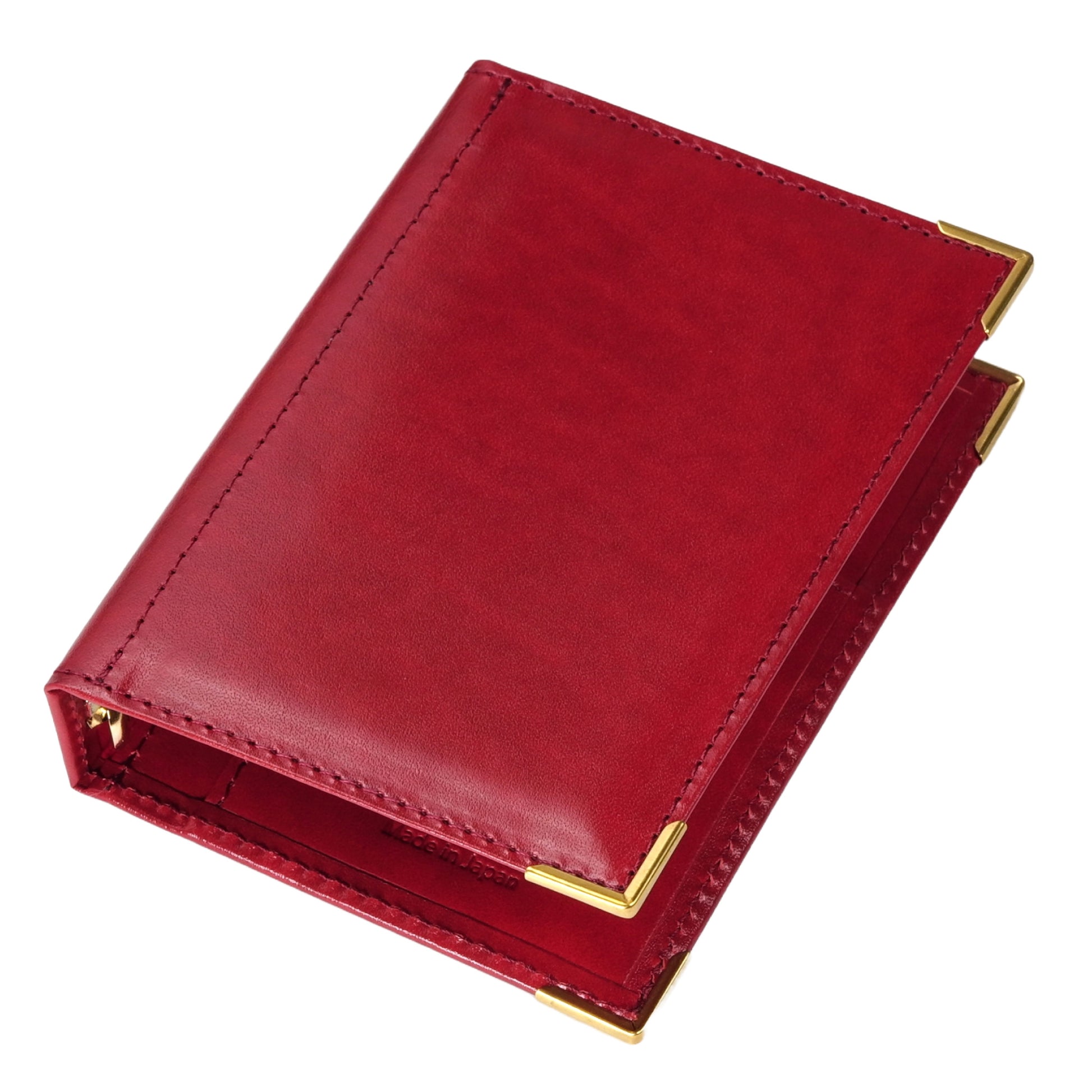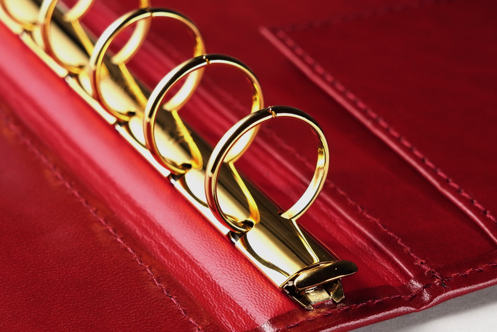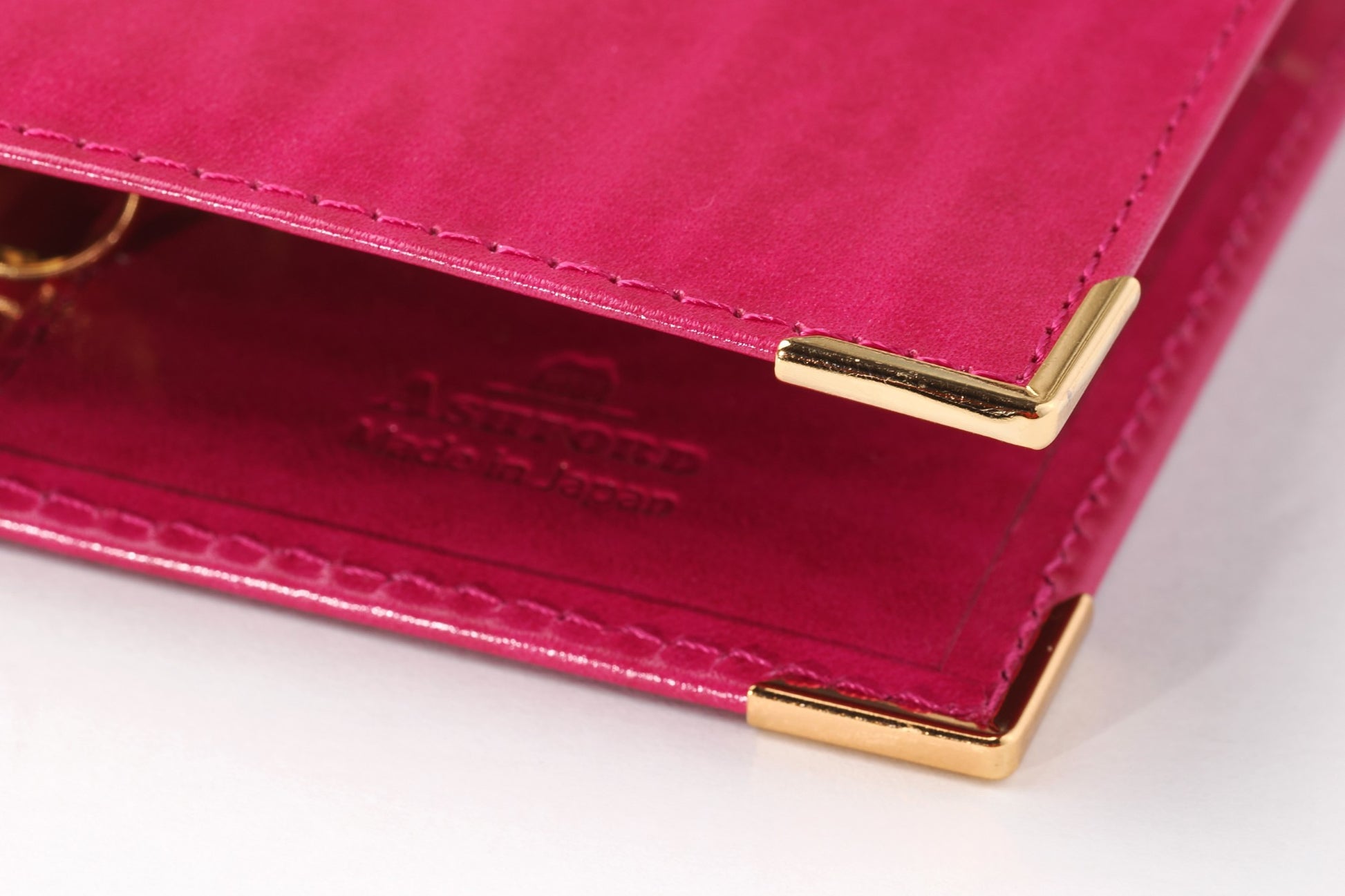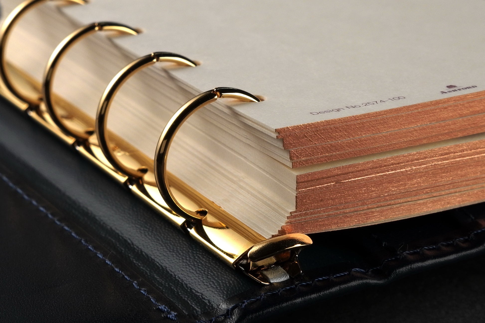 クラシカルな印象を際立たせているのが、カバー隅の金色のコーナー金具。大きなリングも同系の金色です。