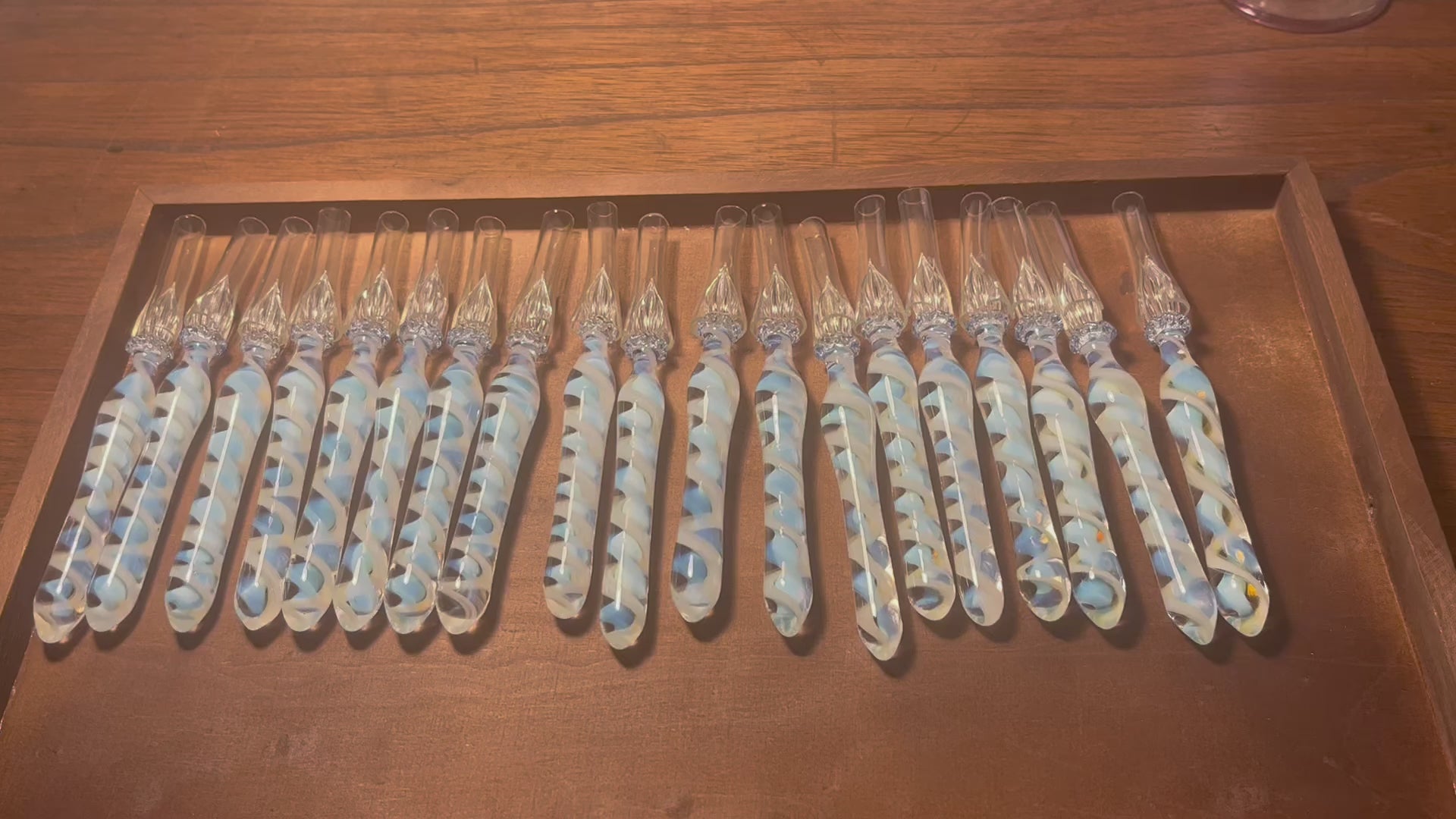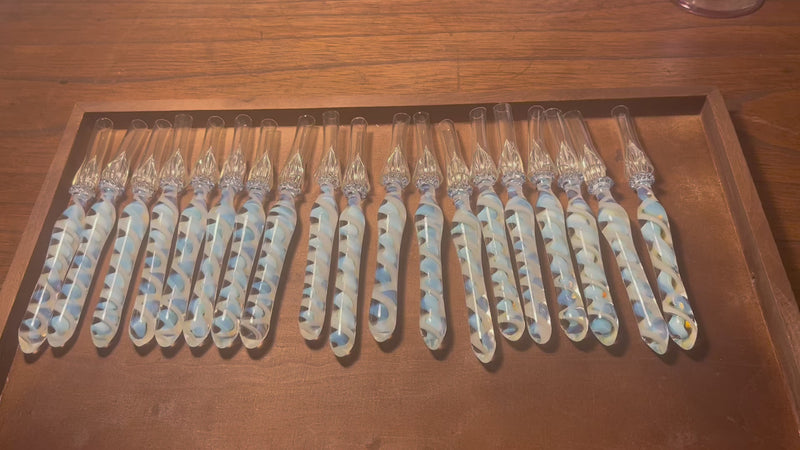光り方には個体差がある点ご了承いただけたら幸いです。また、蓄光ガラスは日光浴をさせたりUVライトを当て続けてしばらくエネルギー充電をしていただいた方が良く光りますが写真の方がわかりやすいかもというぼんやり優しい光り方です。おまけの遊びが隠れたガラスペンです。