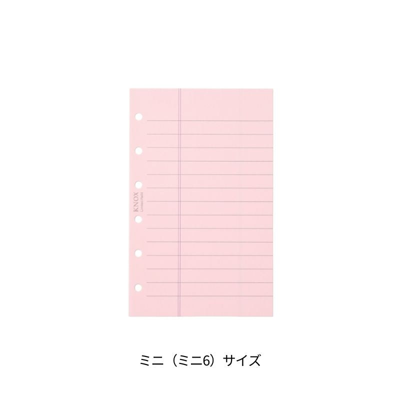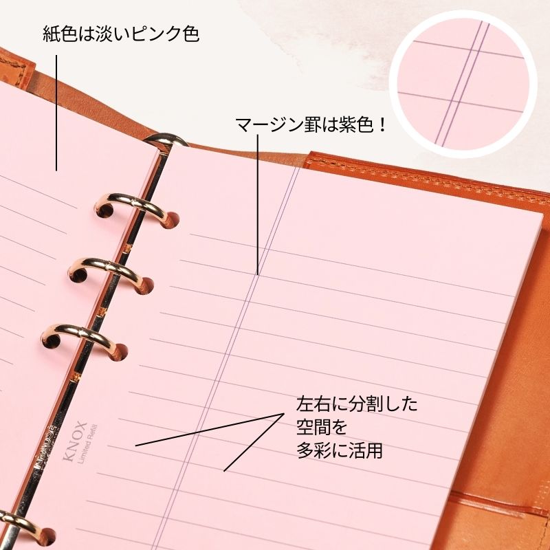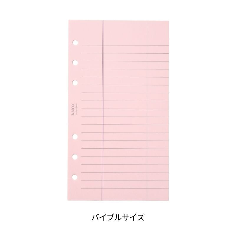 ノックスの人気リフィルで、定番の紙色はブルー。「すもも」は淡いピンクの色上質紙に紫色の縦罫線を加えた2025年限定カラーです。