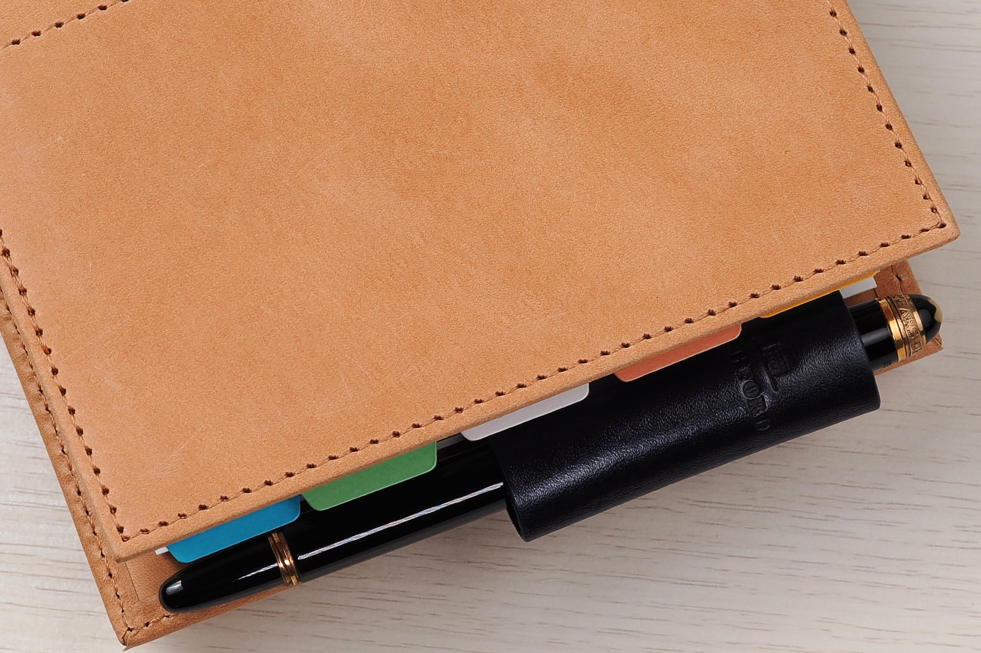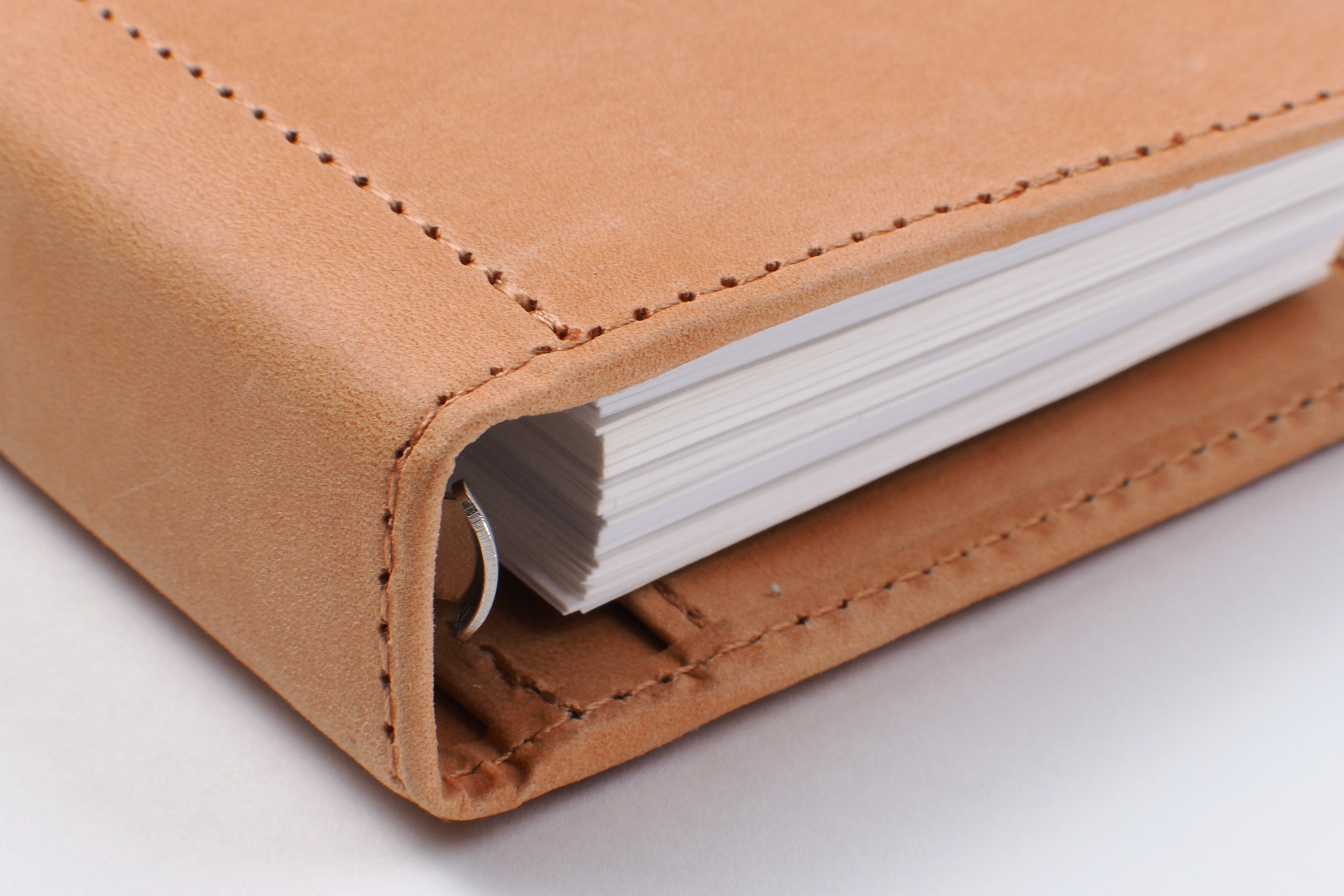 大口径のリングに合わせて、カバーまわりもゆったりとした作り。ペンホルダーやインデックスなどのアクセサリーも自然にカバーする設計です。