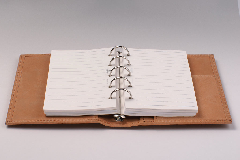 とってもコンパクト。だけど、私たちの有り余る筆欲をしっかり受け止める。リング径を最大級の17mmにすることで、これまでにない枚数のリフィルをしっかり綴じられる仕様です。M5の軽やかさはそのままに、思いつきやひらめきをためておける実質的な筆記面積を広げてくれる。バッグに入れてもかさばらず、カフェでも会議でも、すぐに取り出して書ける軽やかさ。コンパクトなのに、頼もしい。