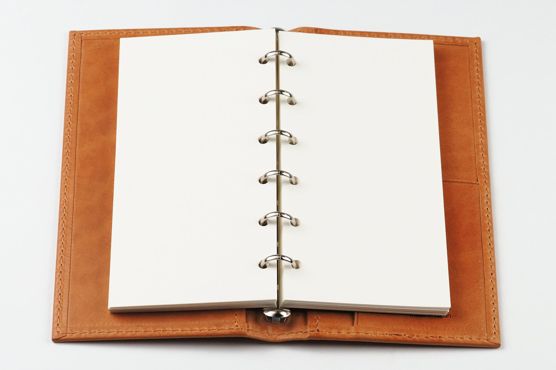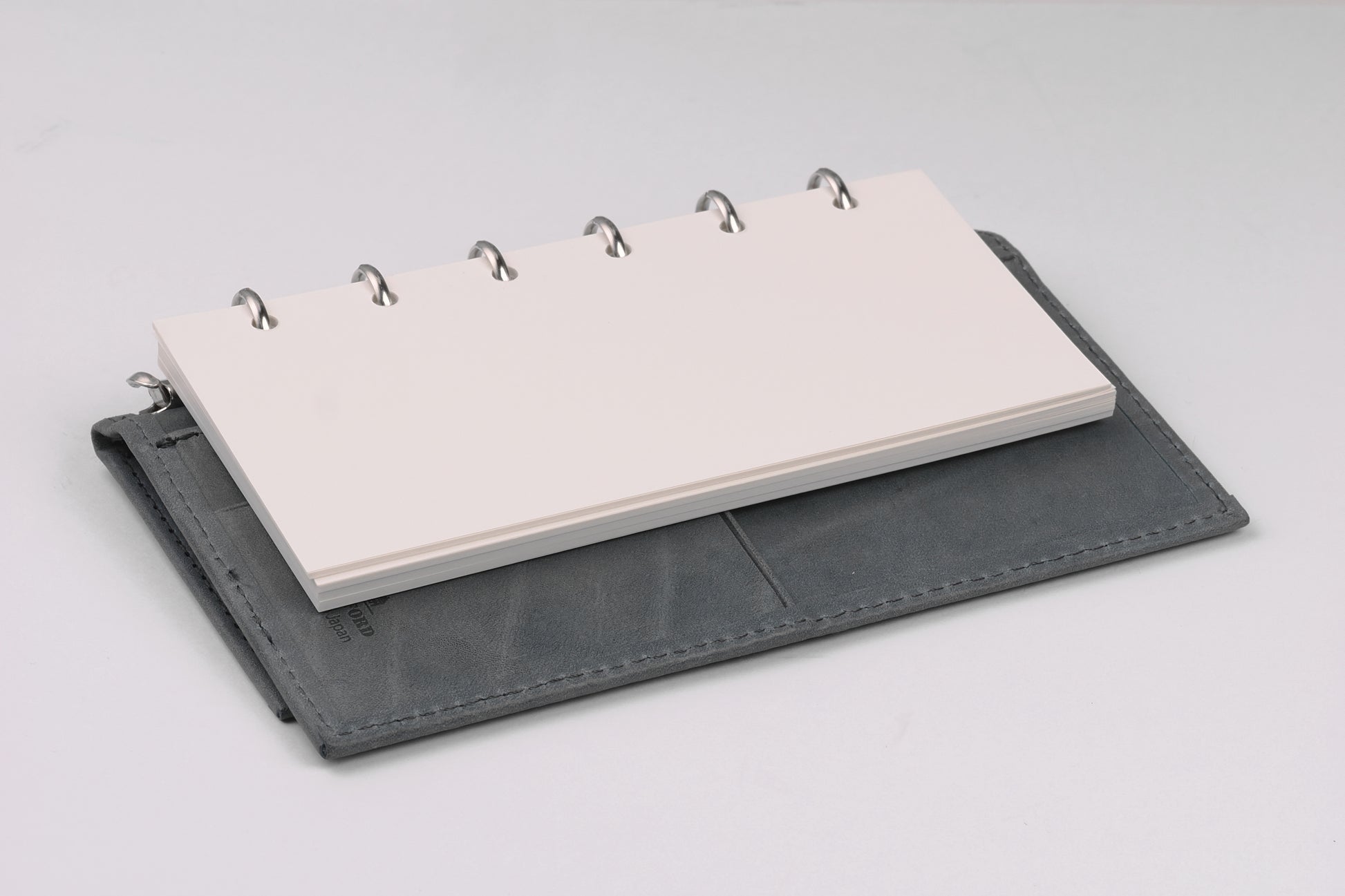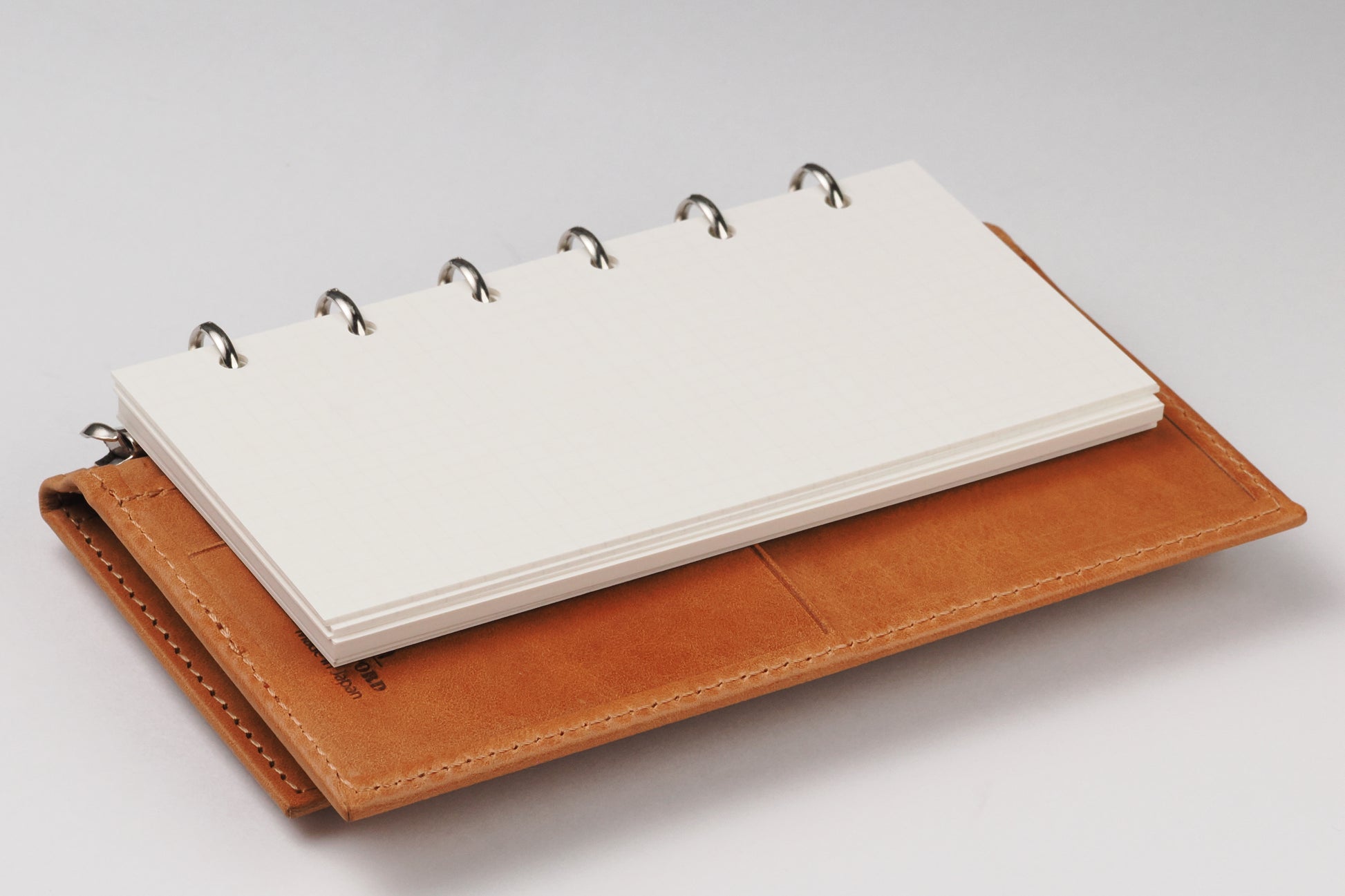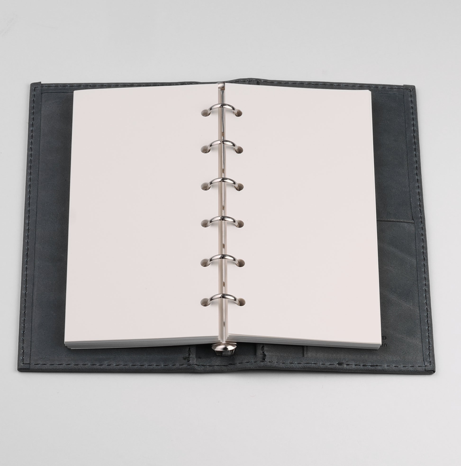 リング径は11mmで薄型。アシュフォードのスクエアバック(角背)仕様で、上製の綴じ手帳のような佇まい。リフィルは約70〜80枚を目安に綴じることができます。