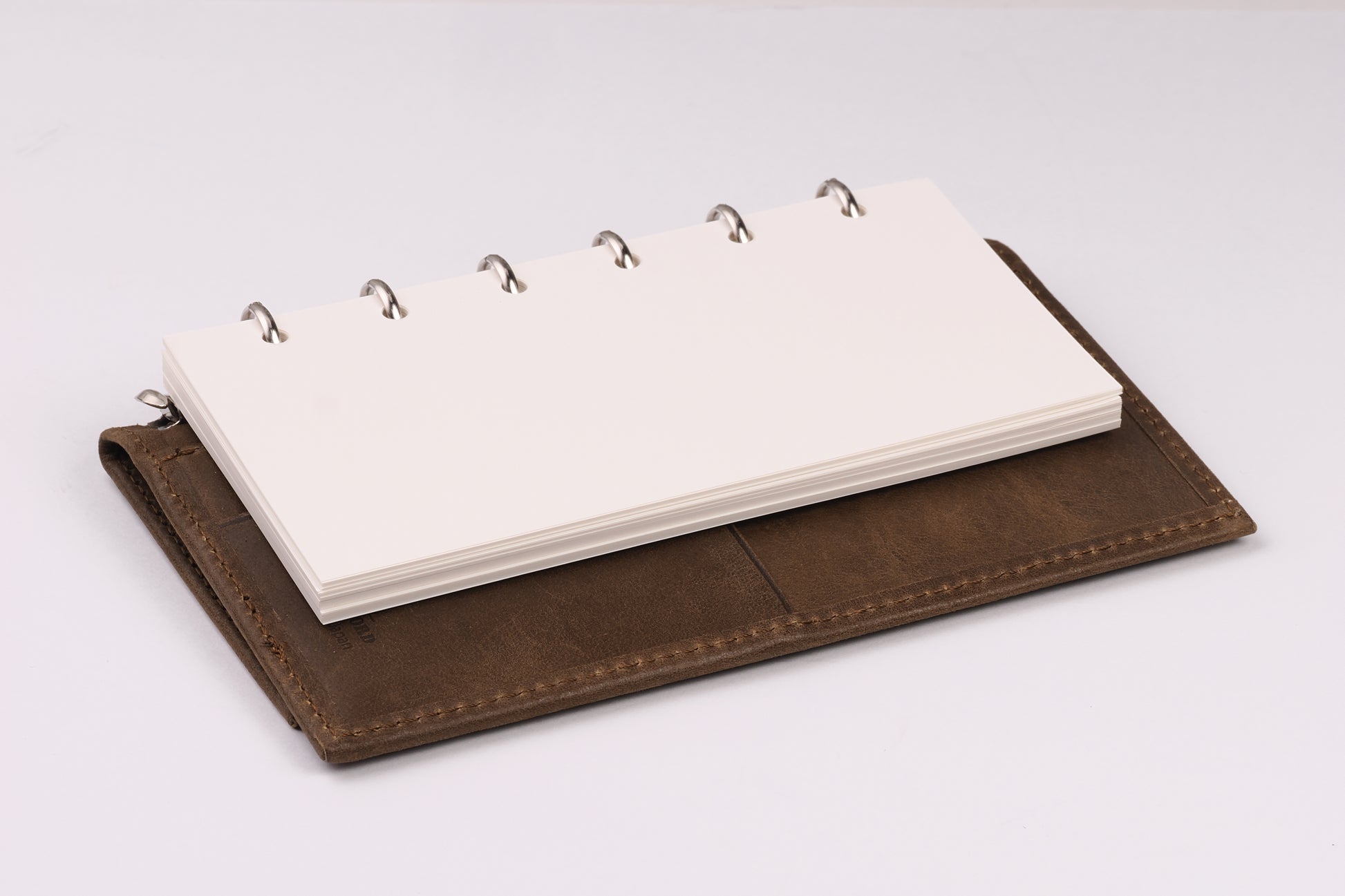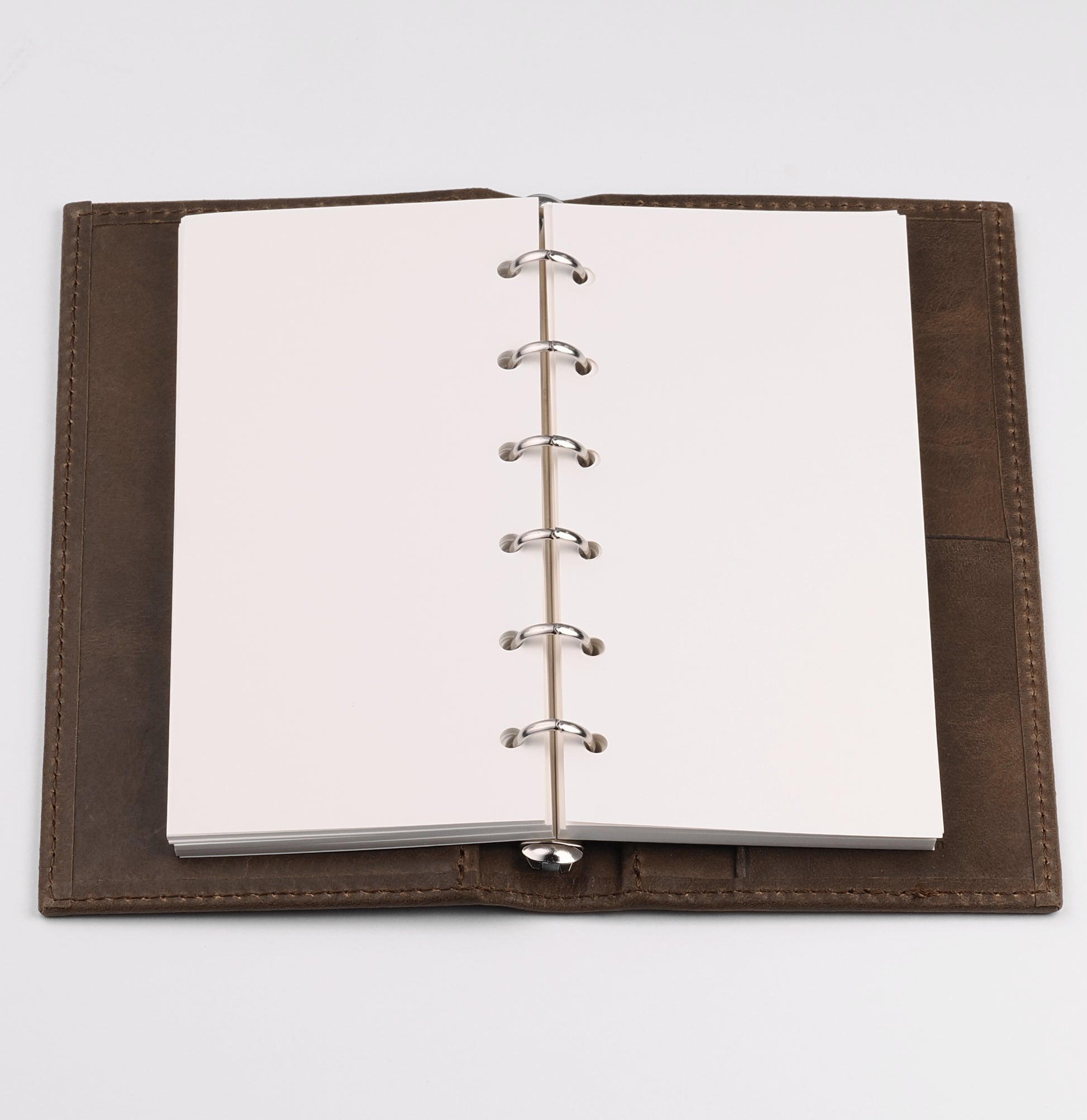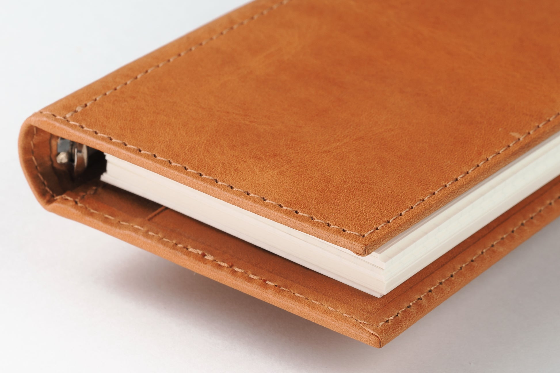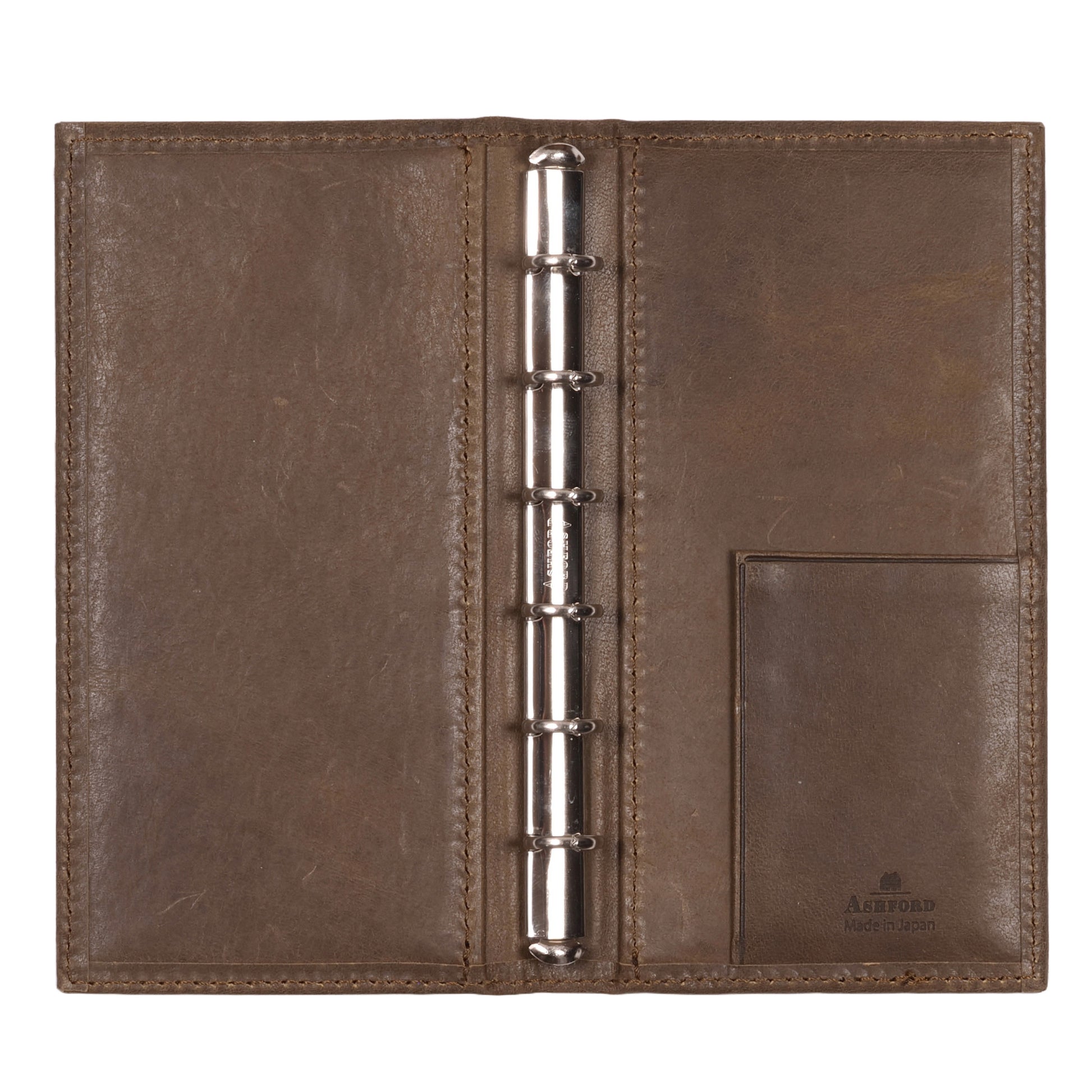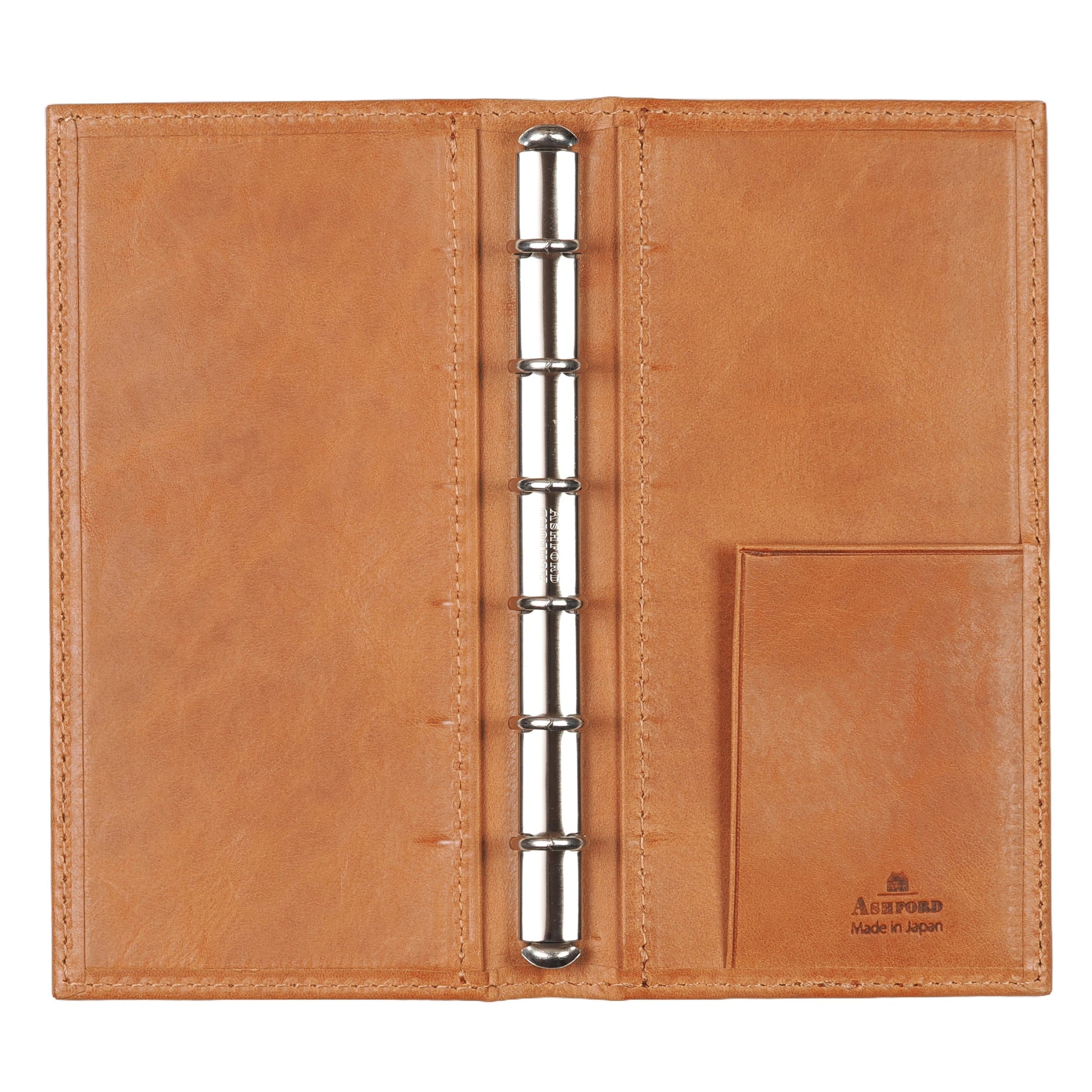 リング径は11mmで薄型。アシュフォードのスクエアバック(角背)仕様で、上製の綴じ手帳のような佇まい。リフィルは約70〜80枚を目安に綴じることができます。