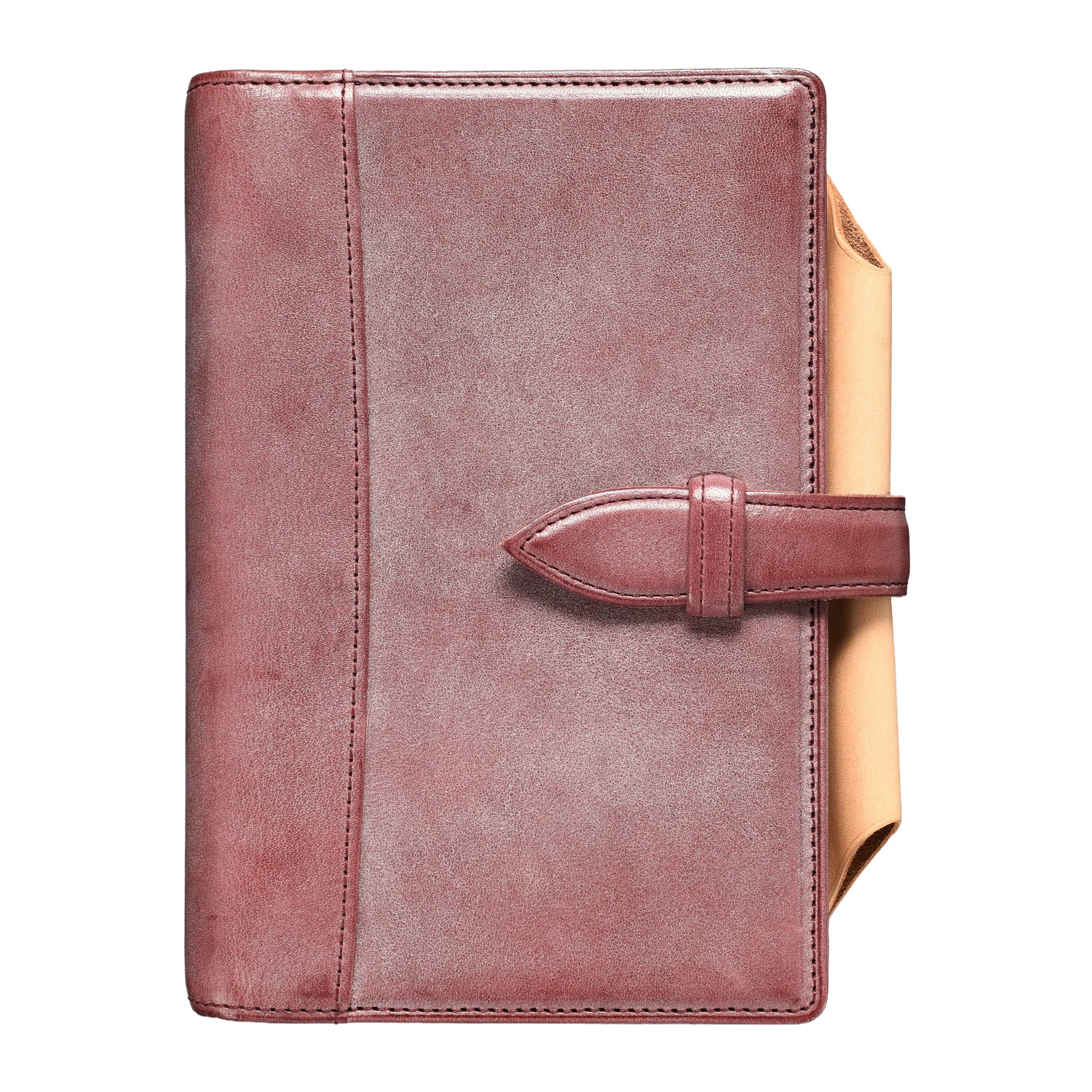 ベルトの設計は20mm径リングによるリフィルの厚みの増減を考慮しています。中央にかけて緩やかに膨らむ「肉盛り」は、美観と実用を両立し、抜けにくく差し込みやすい構造を実現しています。長い歴史を誇るシステム手帳ブランドならではの技術です。