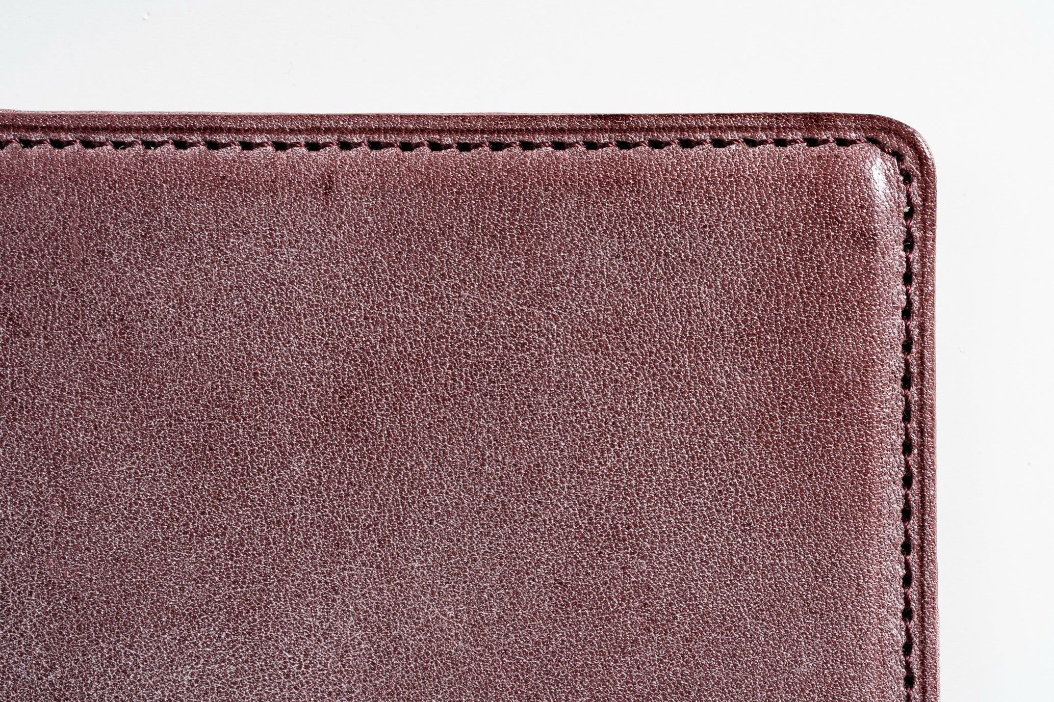エヌ/ピアスの佇まいには、優しいふっくら感が漂います。特にカバーの角や背、中面のポケットは丸みを帯びており、クラシカルで洗練された佇まいを生み出しています。カバーの仕上げはオーソドックスなヘリ返しです。ヘリ返しとは、革の端を薄く漉き、数ミリだけ折り返してミシンで縫う革の伝統技術。このヘリ返しを2種類の革で行い、それぞれを重ねることでふっくら感と柔らかな存在感を生み出しているのです。見た目でも伝わってくるこの感触は、実際に手にして初めてその心地よさが実感できる丹念な技です。