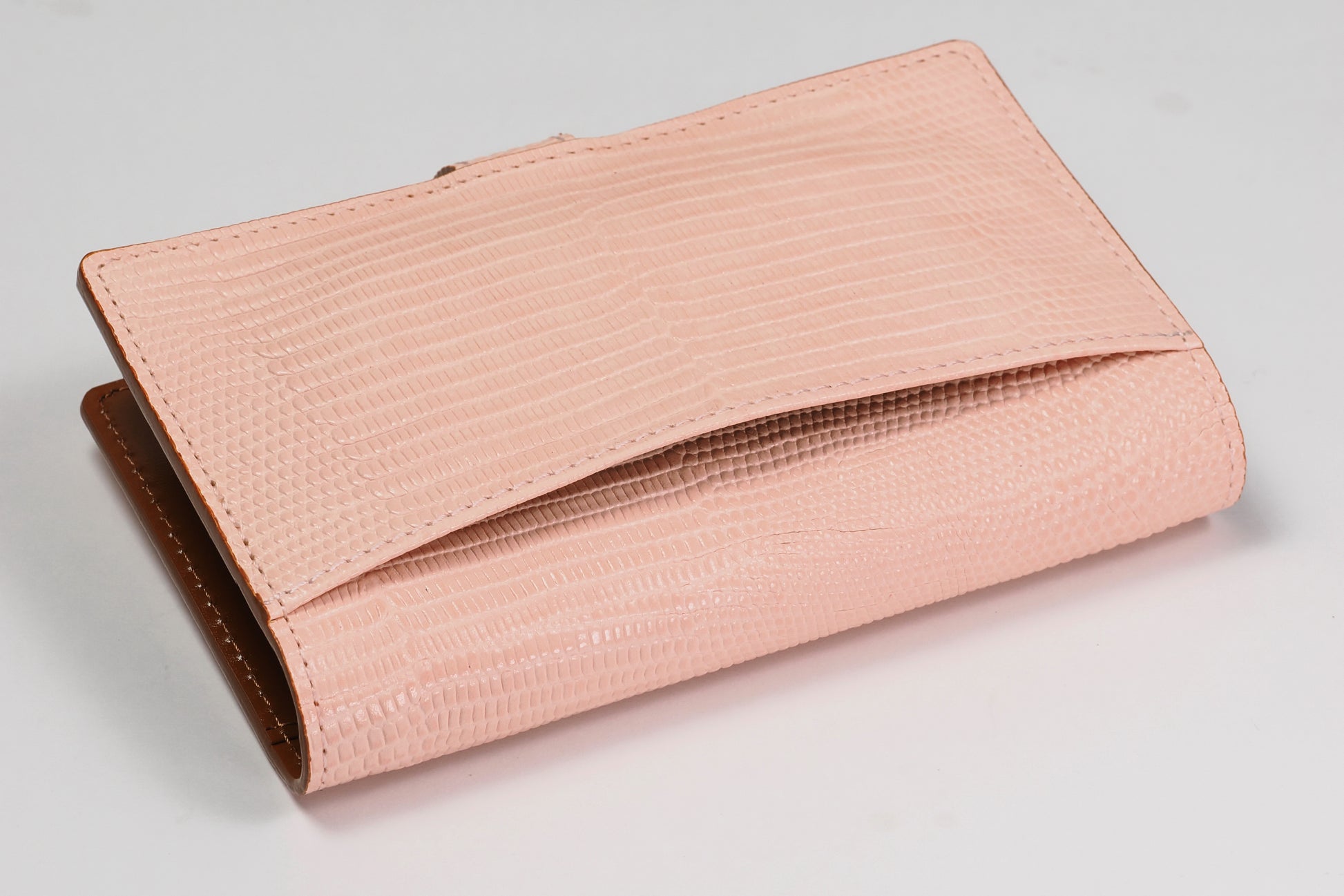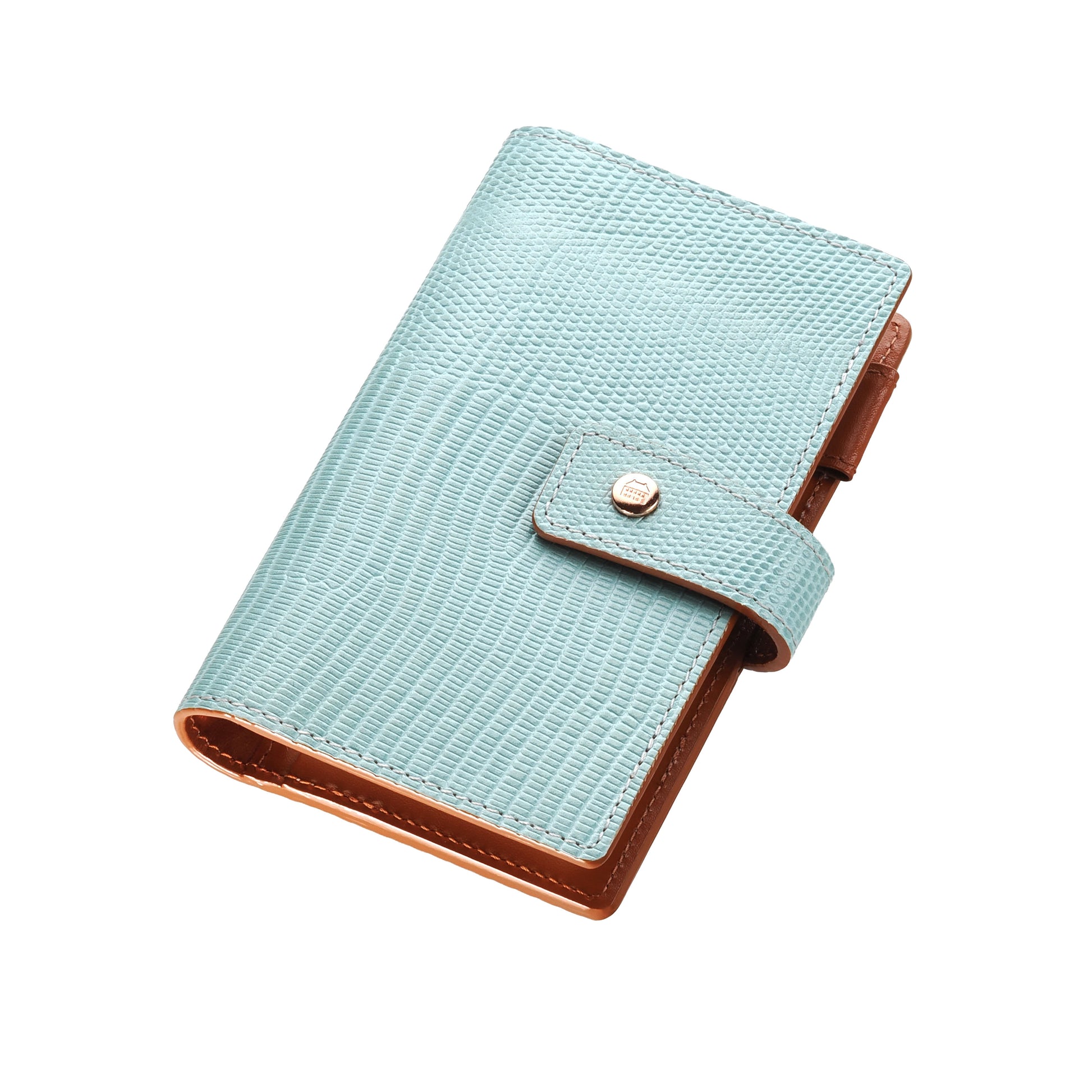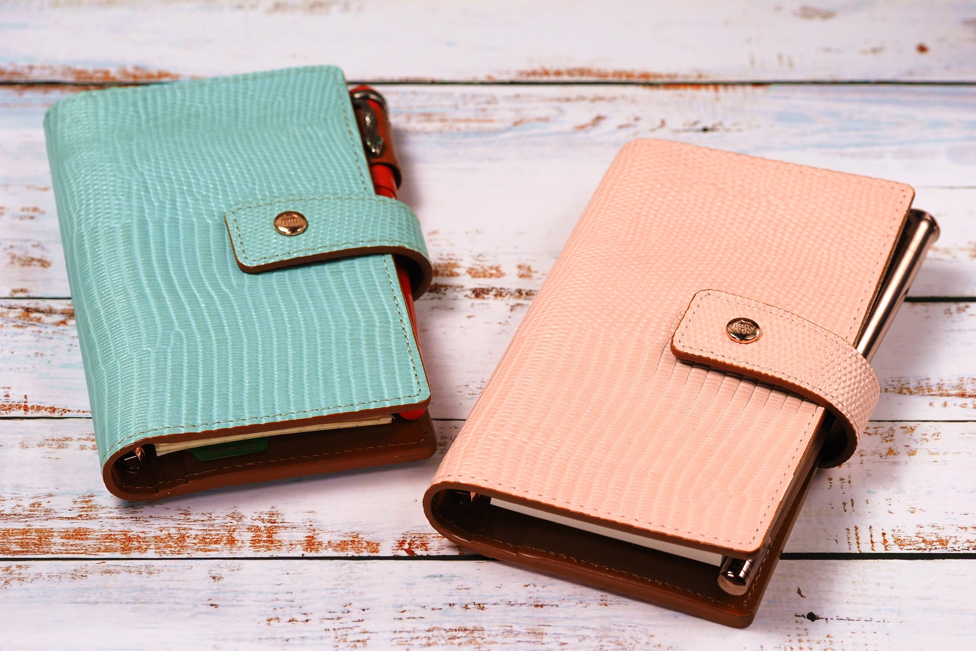 表カバーの色はさわやかなミントグリーンの「わかば」と、絶妙なくすみを含んだ淡ピンクの「さくら」の2色で展開しています。色調はやさしく柔らかい。でも表面はリザード調で芯のある硬さがある。上品さの奥に野性を感じさせてくれるのがネオフィナードの特徴です。繊細に見えて頼もしい。使い込んでいくほどにこの二面性が癖になる。さらに中面の革の濃いめのブラウンとの対比もキュートです。ミニ6ナローは、小型かつ縦長のスリムな形が特徴。ここに金属パーツ(リング、ベルトホック)のローズゴールドが加わり、独特の気品を漂わせています。