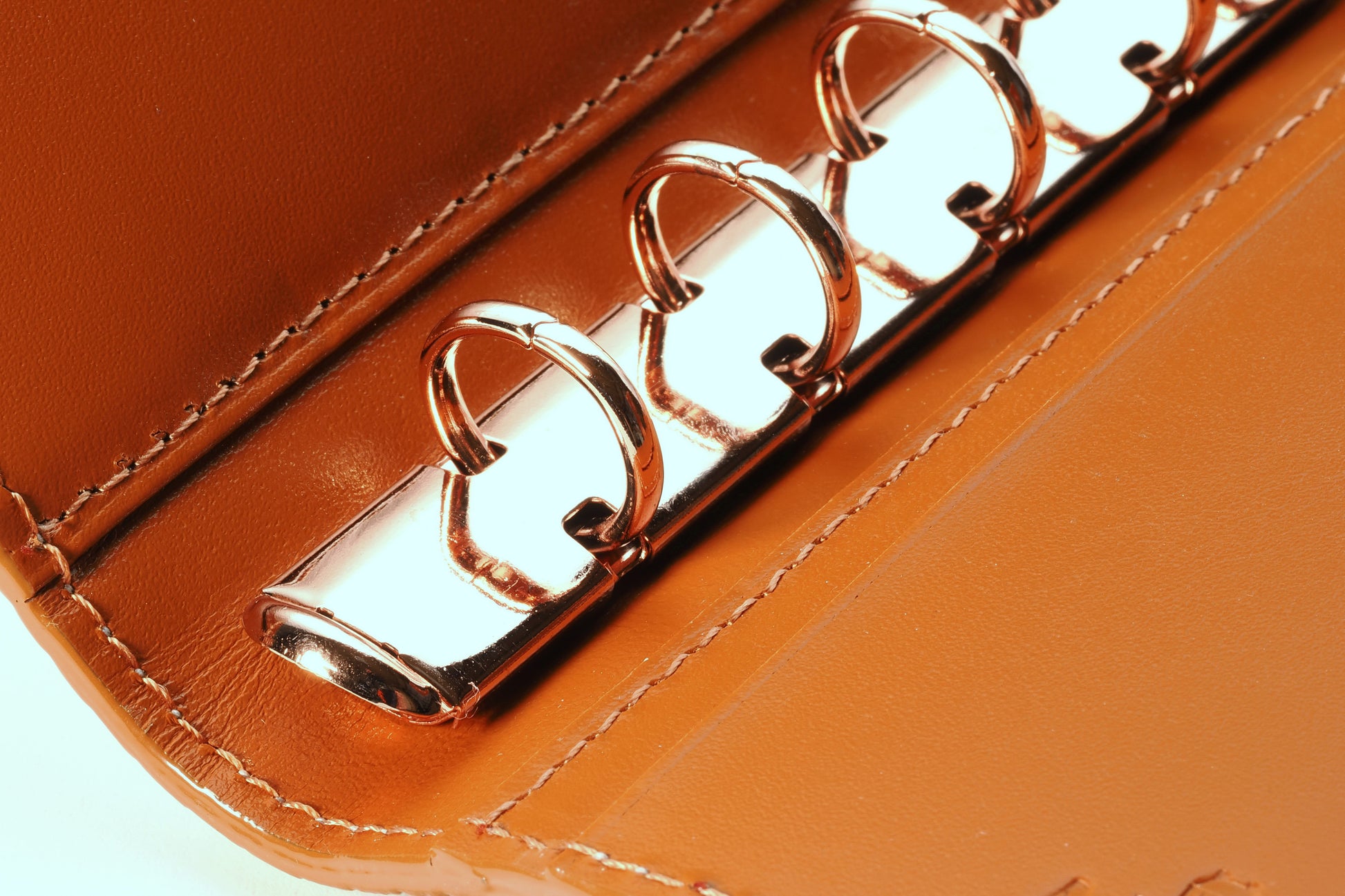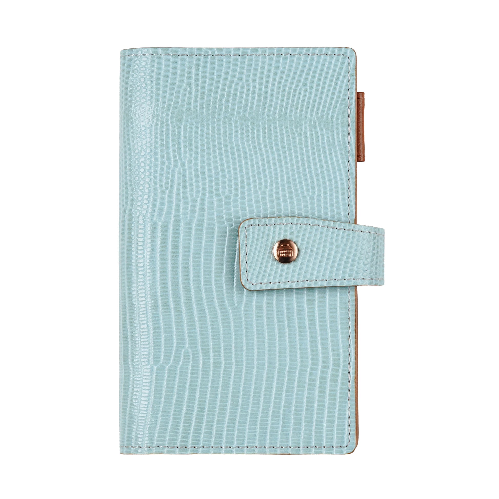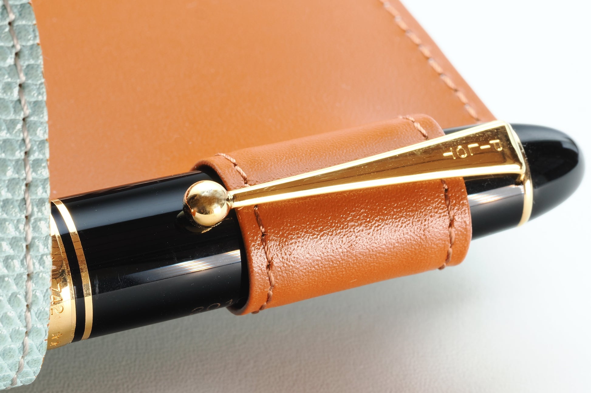 表カバーの色はさわやかなミントグリーンの「わかば」と、絶妙なくすみを含んだ淡ピンクの「さくら」の2色で展開しています。色調はやさしく柔らかい。でも表面はリザード調で芯のある硬さがある。上品さの奥に野性を感じさせてくれるのがネオフィナードの特徴です。繊細に見えて頼もしい。使い込んでいくほどにこの二面性が癖になる。さらに中面の革の濃いめのブラウンとの対比もキュートです。ミニ6ナローは、小型かつ縦長のスリムな形が特徴。ここに金属パーツ(リング、ベルトホック)のローズゴールドが加わり、独特の気品を漂わせています。