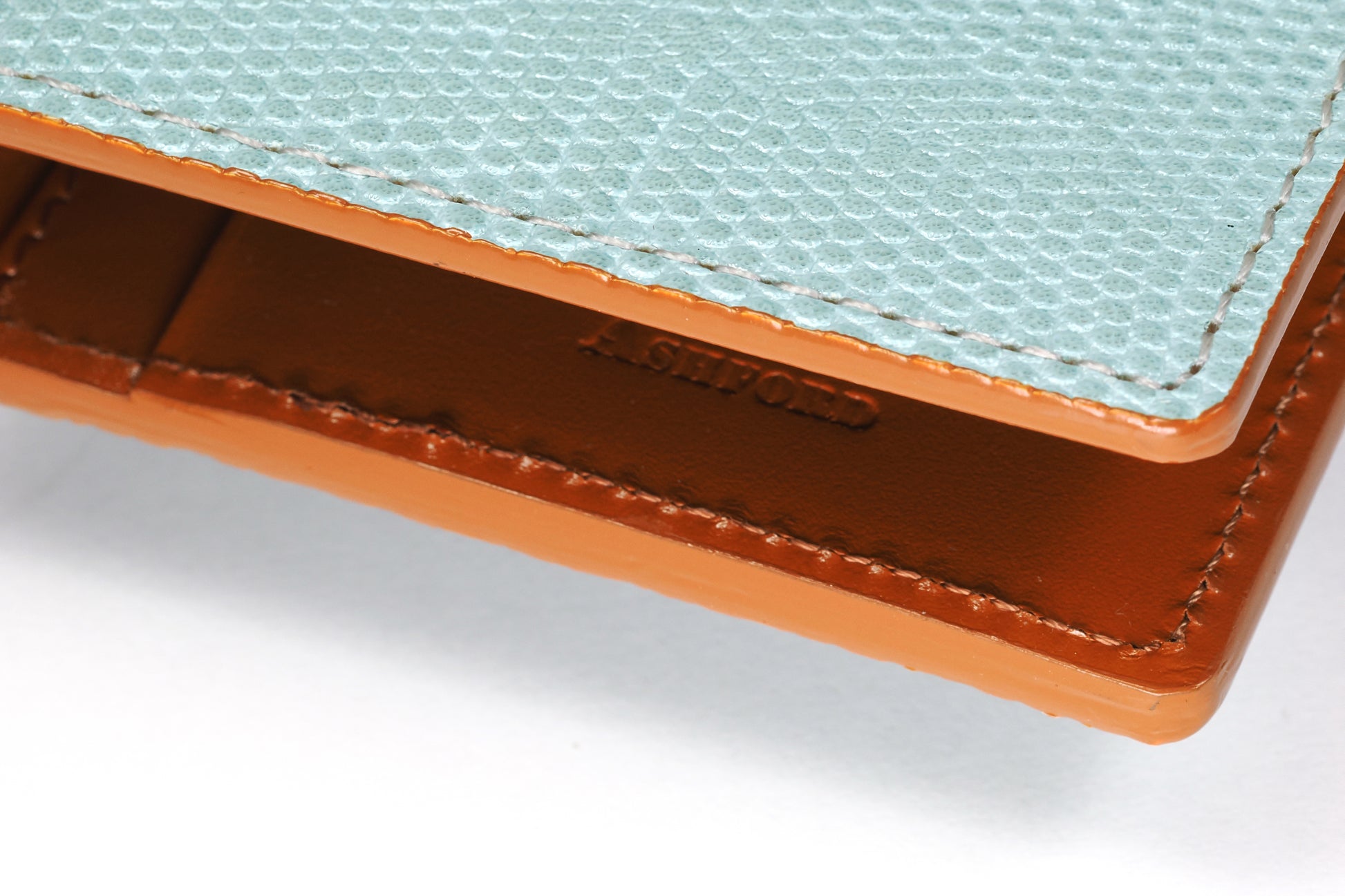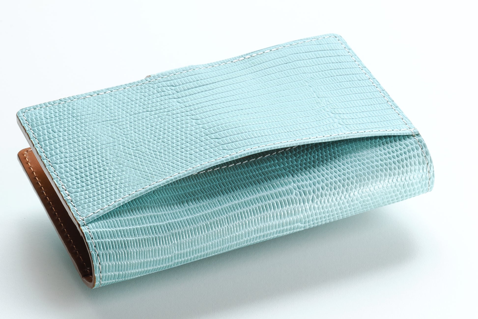 基本的な素材や仕様は、ネオフィナードと同じです。素材は、タンニンなめしの上質なキップレザーを採用。細かいリザード(トカゲ革)調の型をくっきり出すために3つの工程で丁寧に作られています。「頭バリ」と呼ばれる、ベースの色に対しトップを若干色濃くする手法で染色をすることで、型押しレザーを奥行きのある自然な雰囲気に仕立てています。また、傷や汚れがつきにくい加工になっています。