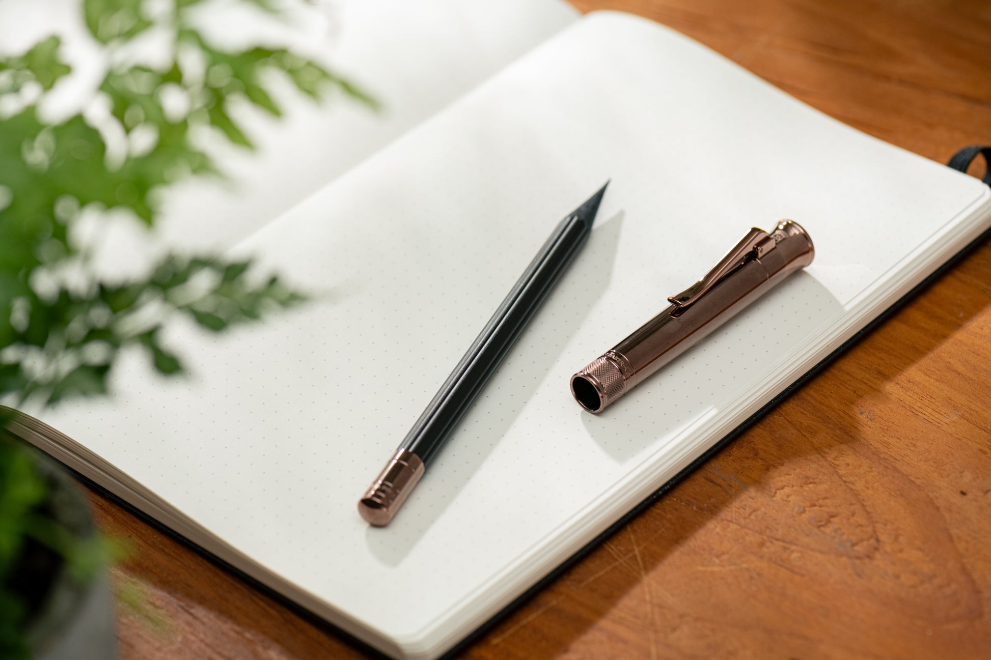 付属する鉛筆軸「ポケットペンシルNo.5」の色は黒。芯はファーバーカステルの最高クラスの材料を使い、木軸はカリフォルニアのインセンスシダー(オニヒバ=ヒノキ科の大高木)を採用。木目が整った美しいカリフォルニアシダーの削り心地も上質。表面からの乾燥防止には蜂の巣から採取した蜜蝋を何層にも重ねて塗り、天然かつ上質な仕上げ。シルクのような手触りで、使い込んで短くなっていくほどに艶が増していきます。ブラックは芯の内側にも黒い染料を入れており、鉛筆を削っても断面も黒色をキープ。