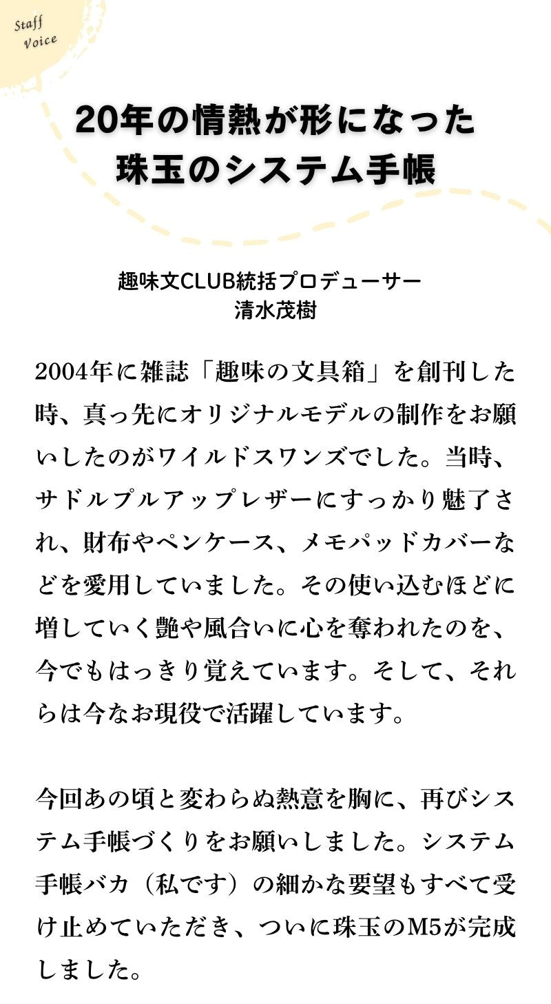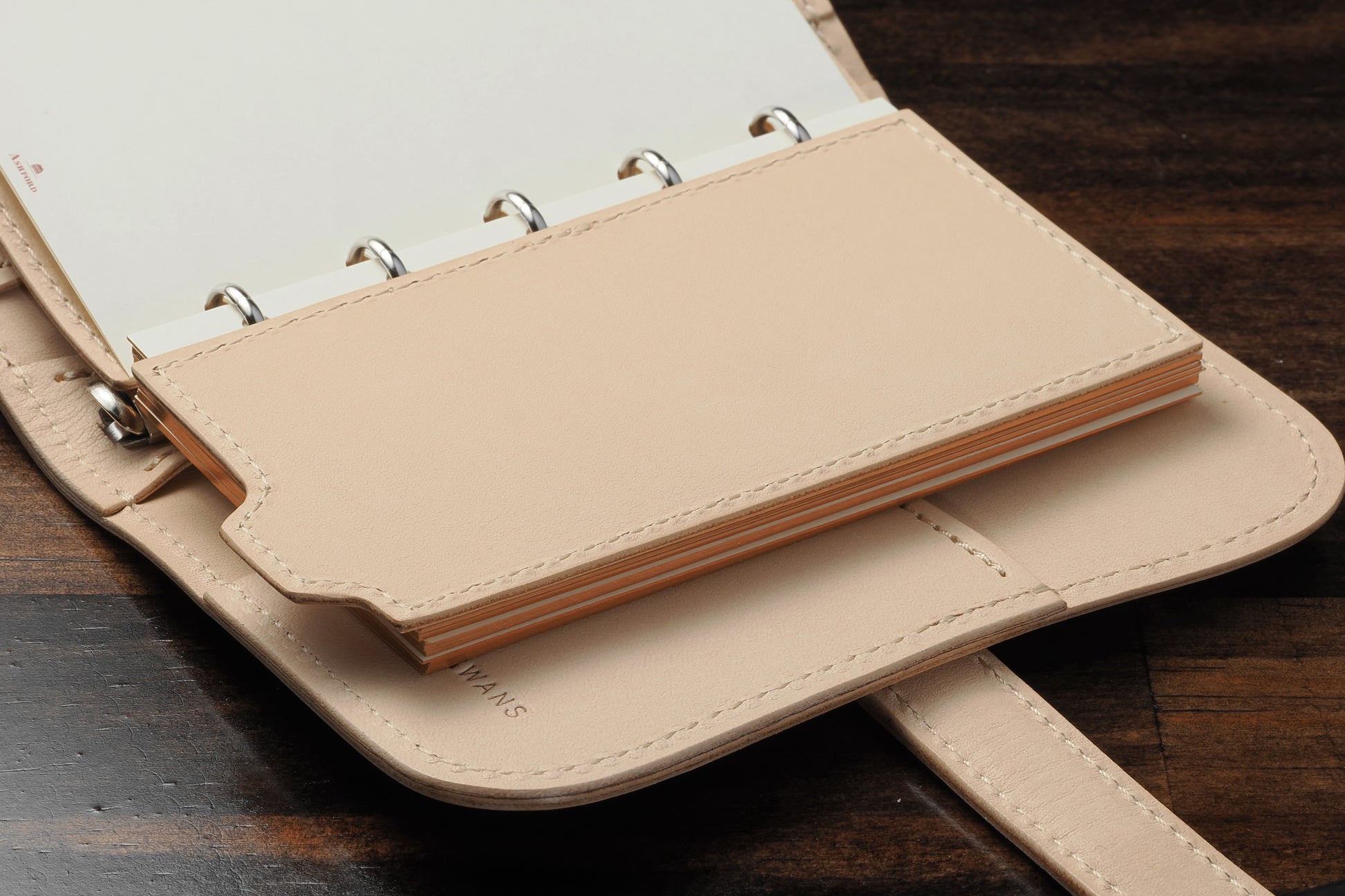 今回あの頃と変わらぬ熱意を胸に、再びシステム手帳づくりをお願いしました。趣味文CLUB独自の仕様として軽量化とシンプル化を図りながらも、素材、製法、デザイン、そして佇まいにはワイルドスワンズらしい品格が宿っています。