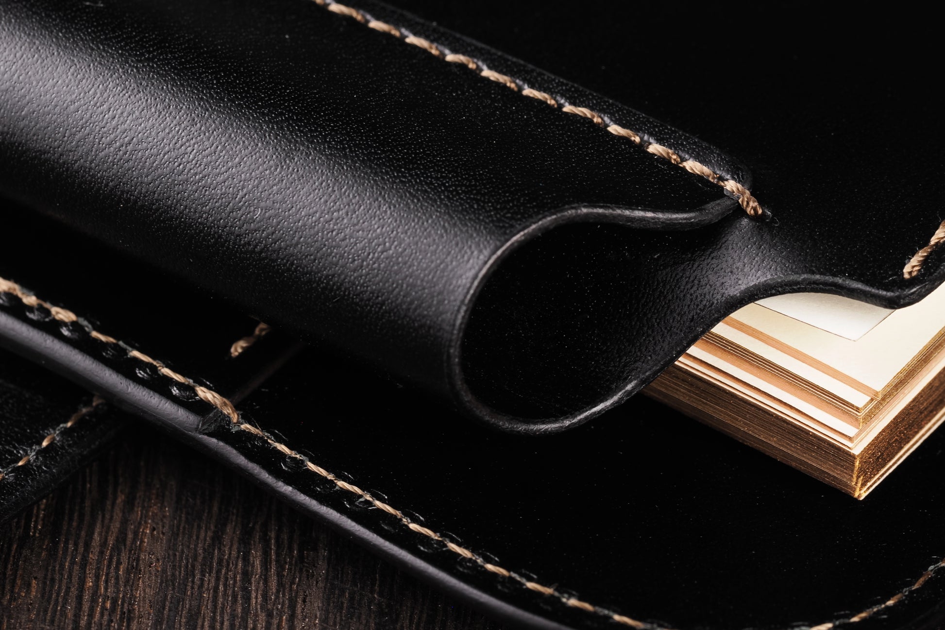 「ブラック」には色の劇的な変化は少ないものの、質感と黒の深さが変化していきます。上画像は5年熟成したブラックの3折サイフ(バーン)です。サドルプルアップの王道とも言える艶が劇的に上がっています。最初はマットな黒ですが、使い込むとまるで純黒のインクを流したような黒に近づいていきます。黒が深まり、透明感が加わっていくのです。手でよく触れる部分だけ他よりも黒の深みと艶が増すので、持ち主の個性が表情に変化していくのも奥深いところ。