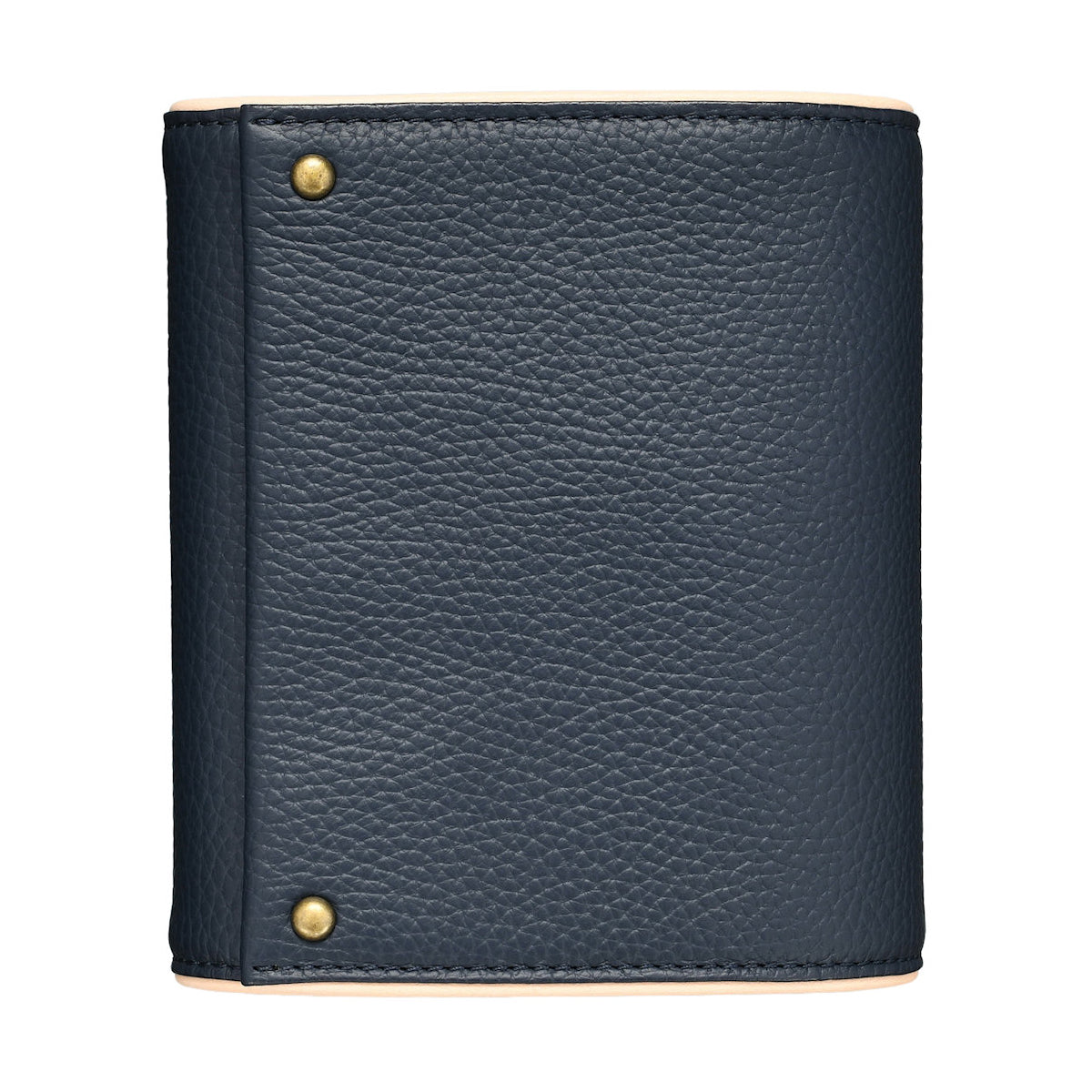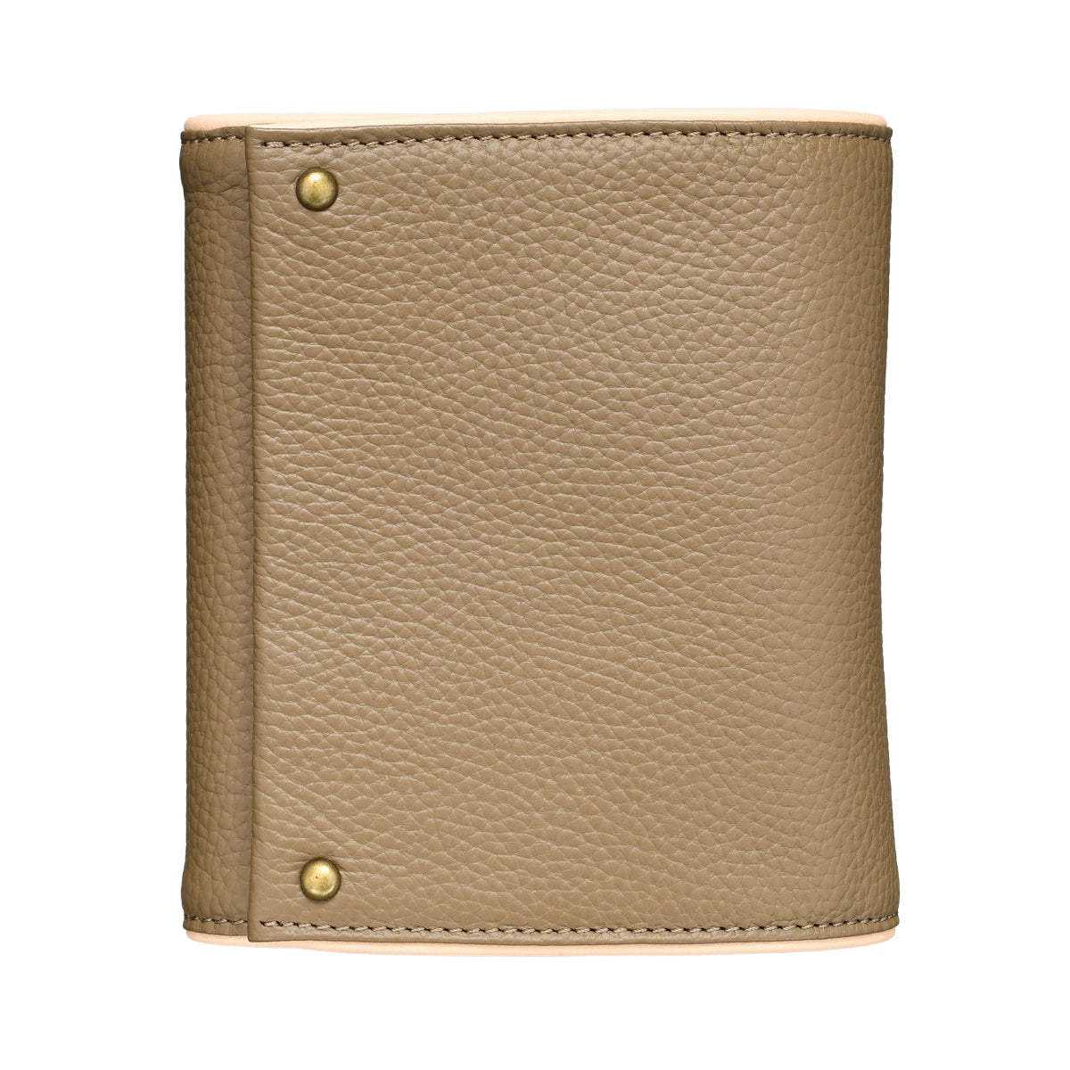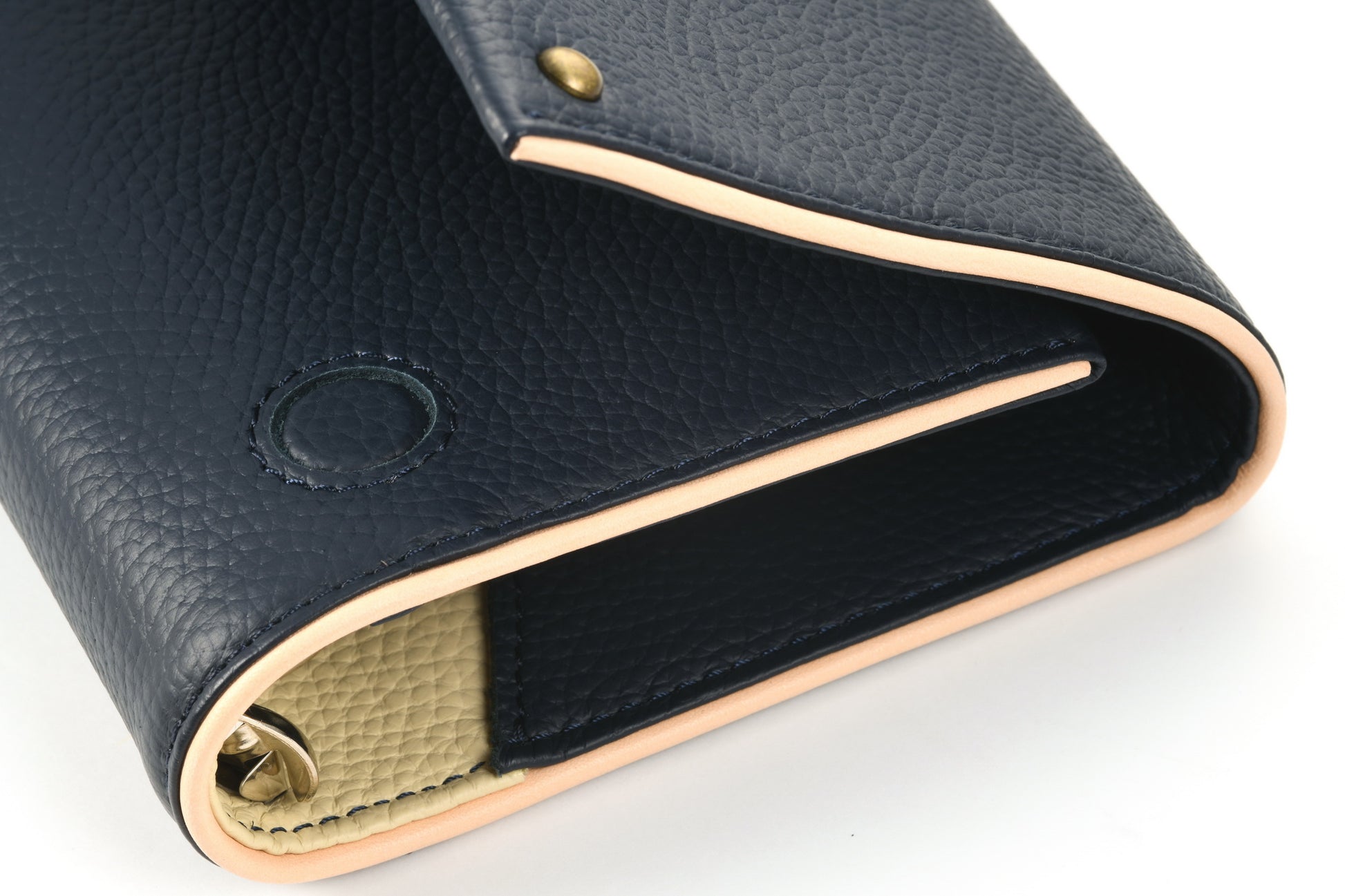 素材には、厳選した国産牛原皮を採用。最先端の特殊顔料による鮮やかな発色、シュリンクエンボスの繊細な表情、そして柔らかな質感が際立ちます。カラーバリエーションは「ネイビー」「トープ」「ブラウン」の3色。中面アオリ部分には共通で「クリーム」を用い、落ち着いたトーンが年齢や性別を問わず使いやすさを引き立てます。