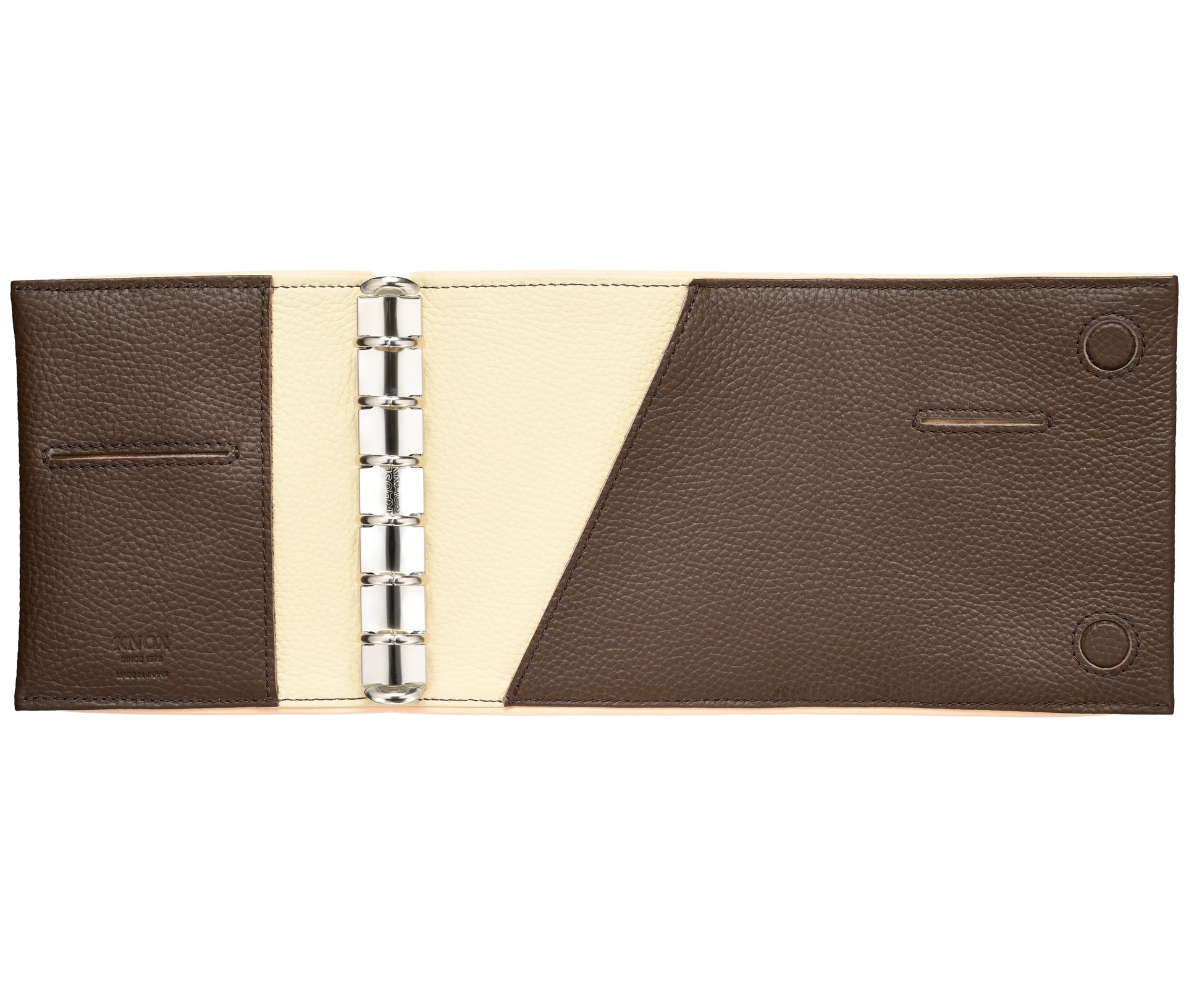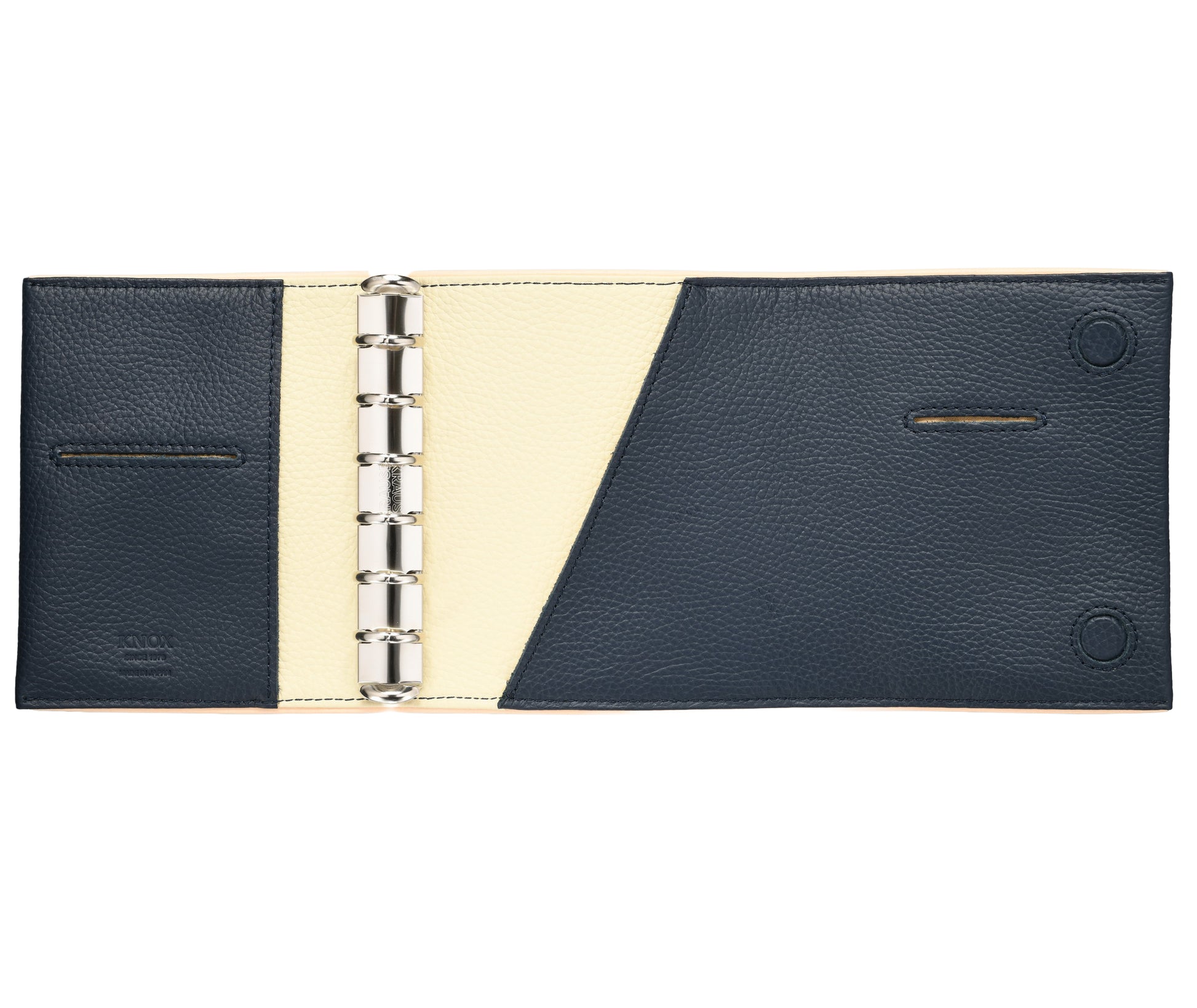 全体を開くと、リング横に「包み込む」コンセプトを体現した大きなポケットが右方向に広がります。最長部で約20cmの深さを持ち、十分な収納力を備えています。斜めのカットラインとバイカラーにより、リズム感のある外観に仕上がっているのも魅力です。