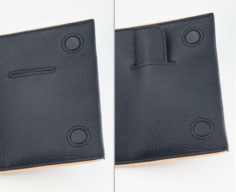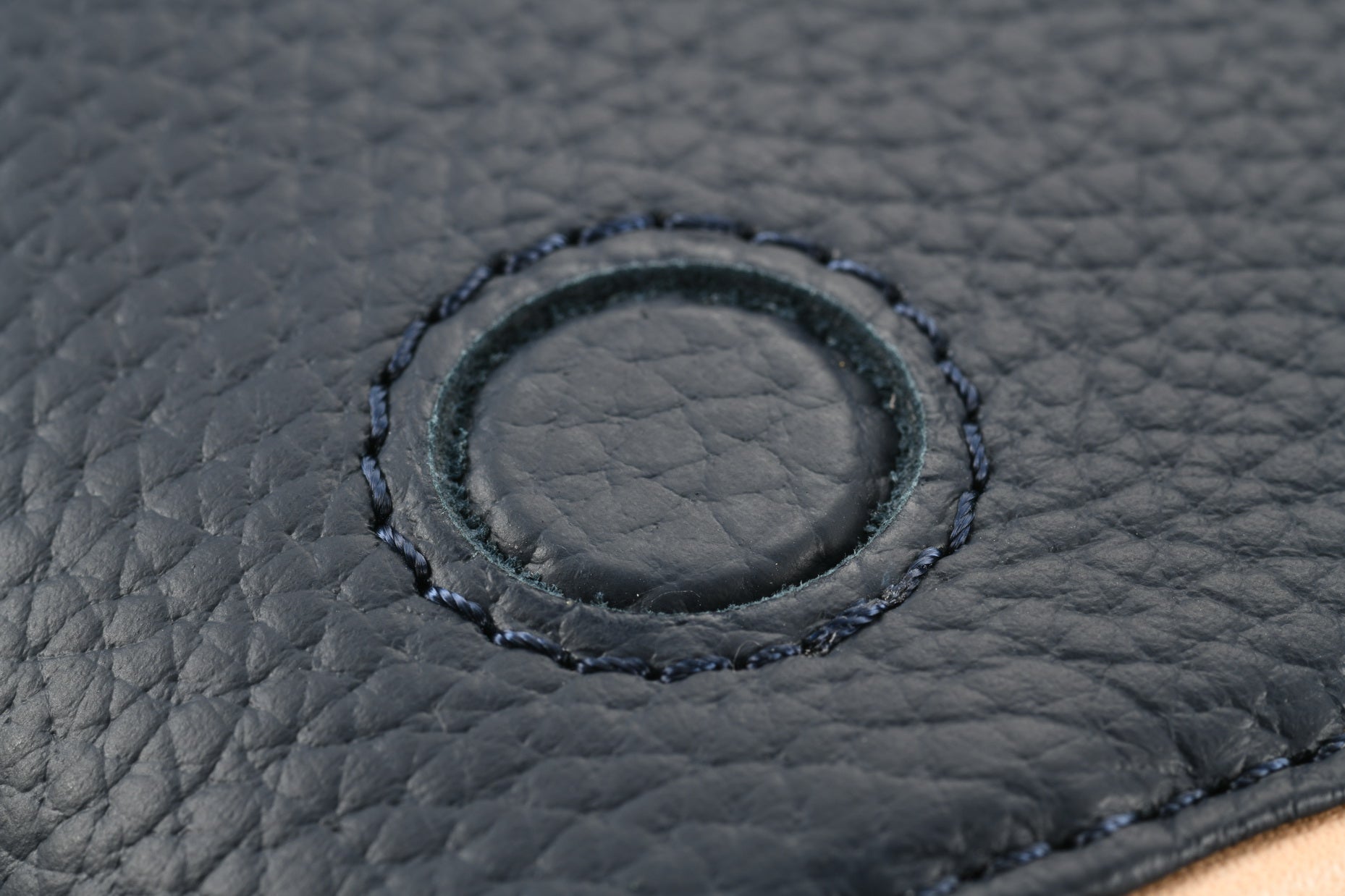 45周年モデルで初採用のマグネット式ホックを上下2か所に配置。軽快な開閉でストレスのない使い心地を実現しています。マグネットは革で包み込み、周囲のステッチも本体と同色に仕上げることで、統一感あるデザインを生み出しています。