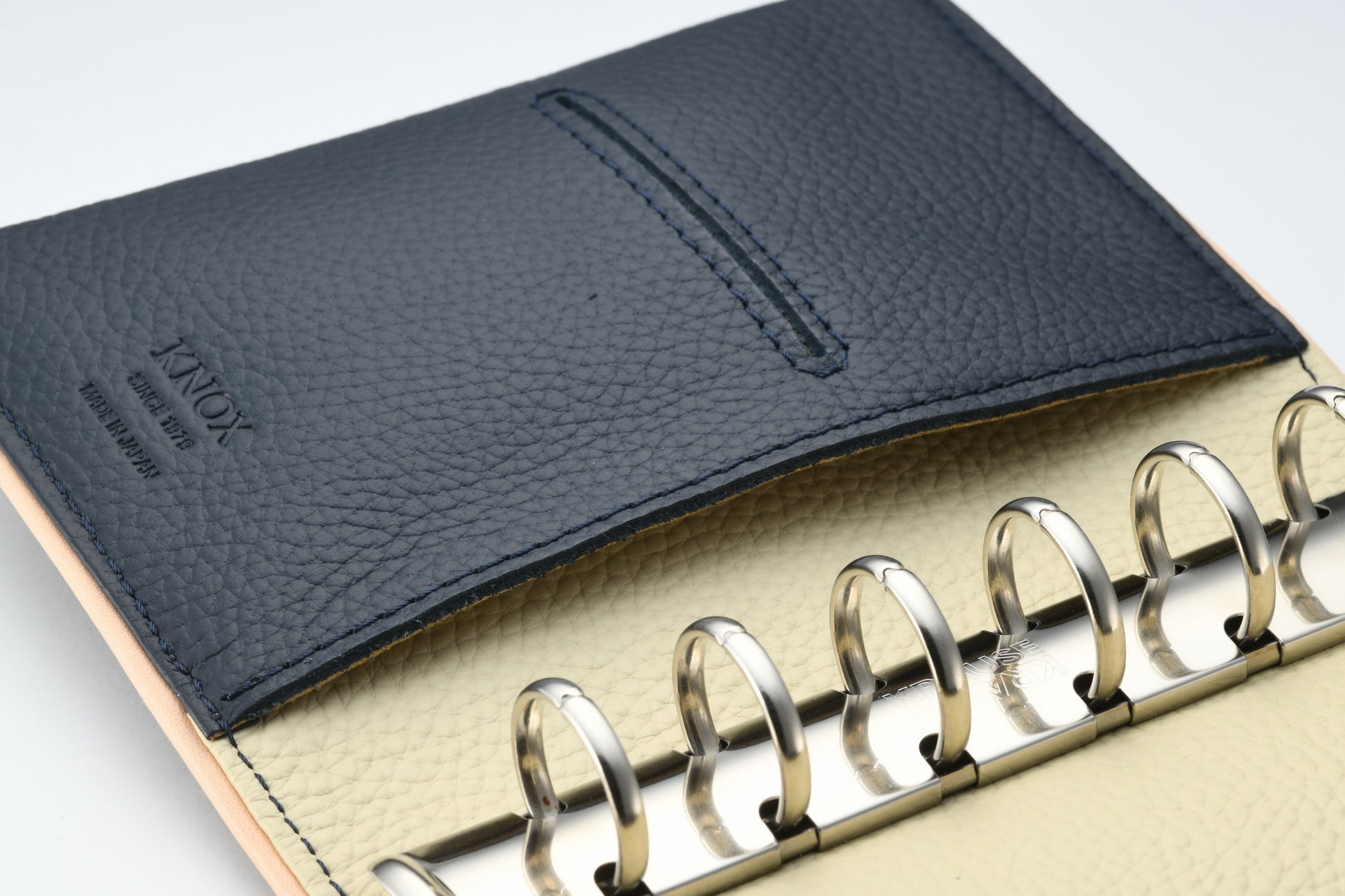 経年変化が魅力のナチュラルタンレザーを折り畳み、本体両面の革で挟み込む独自の仕様が特徴です。エッジの効いた仕上がりで、シュリンクレザーよりも先にナチュラルタンレザーがあめ色に変化し、時間差のエイジングが楽しめます。厳選素材を機能的なデザインへと昇華するノックスの哲学が細部にまで息づいています。